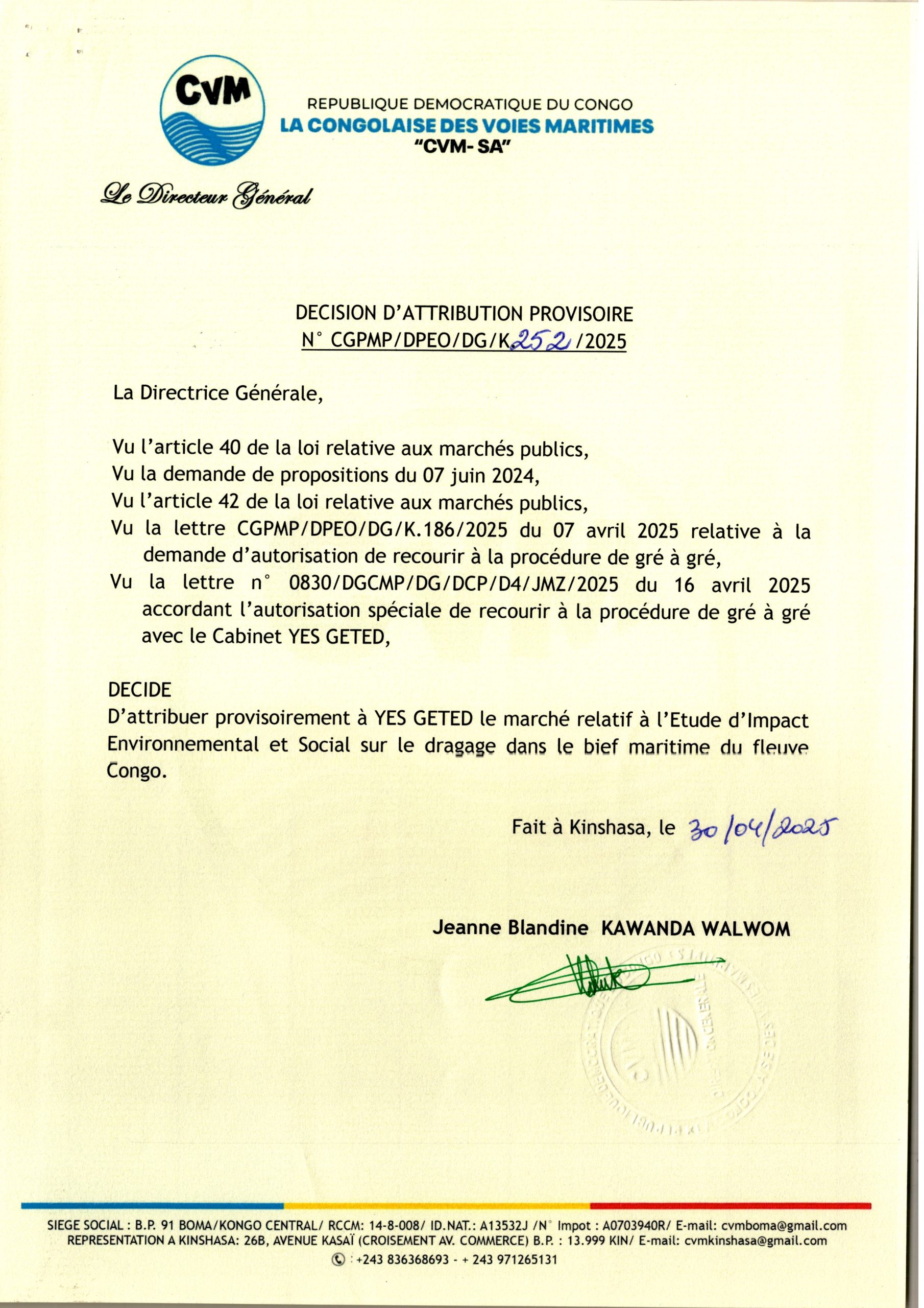 Décision d’attribution provisoire accordée à YES GETED marché relative à l’étude d’Impact Environnemental et social sur le dragage dans le bief maritime du fleuve Congo.