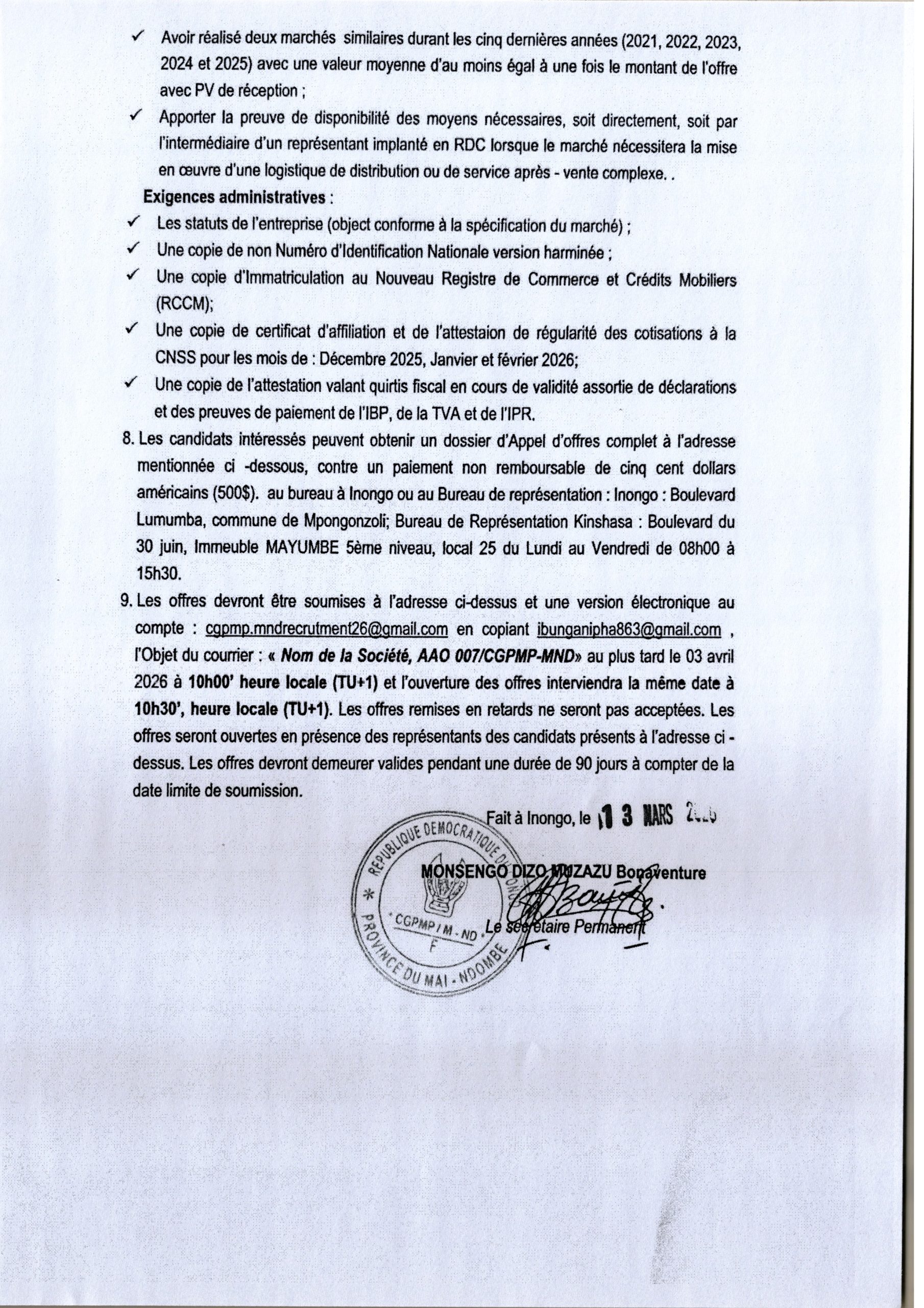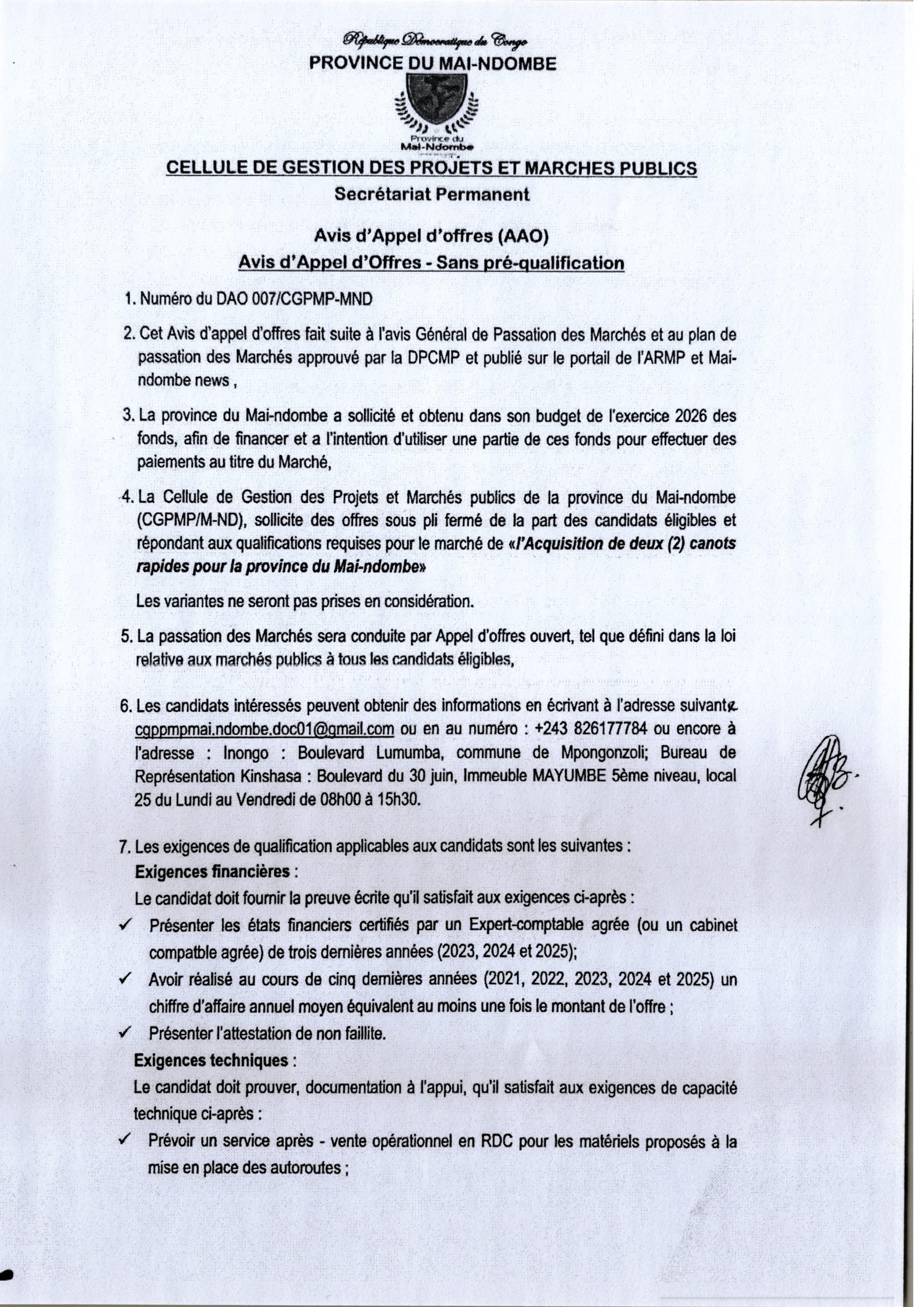 Acquisition de deux (2) canots rapides pour la province du Mai-ndombe.