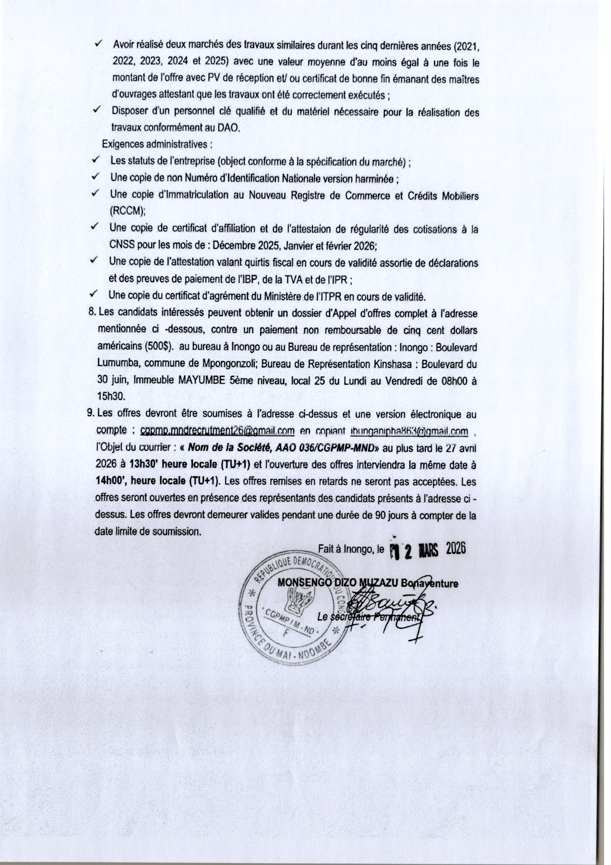Travaux de construction d’un bâtiment administratif à INONGO.