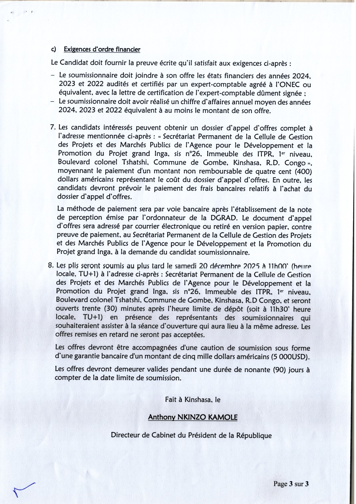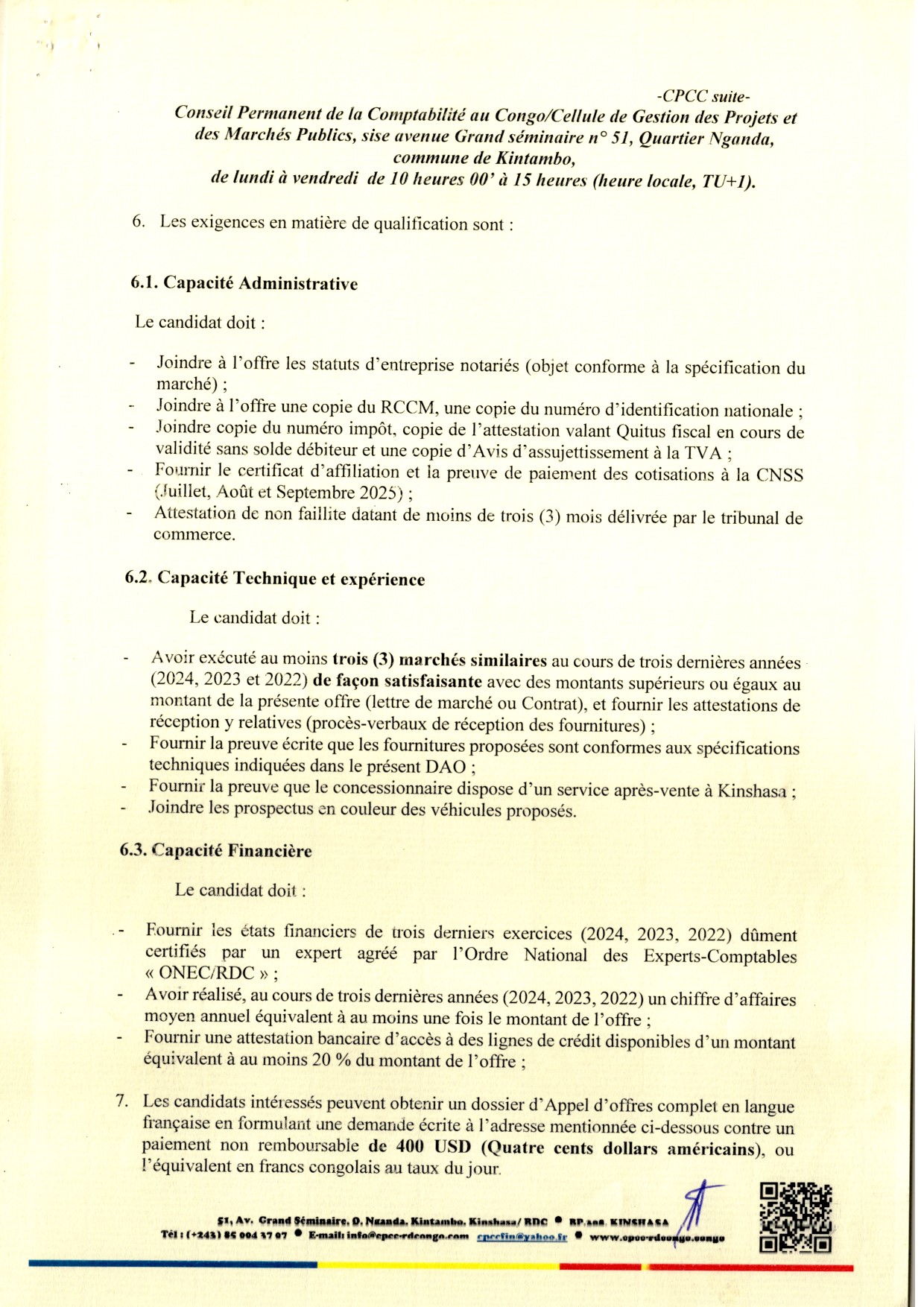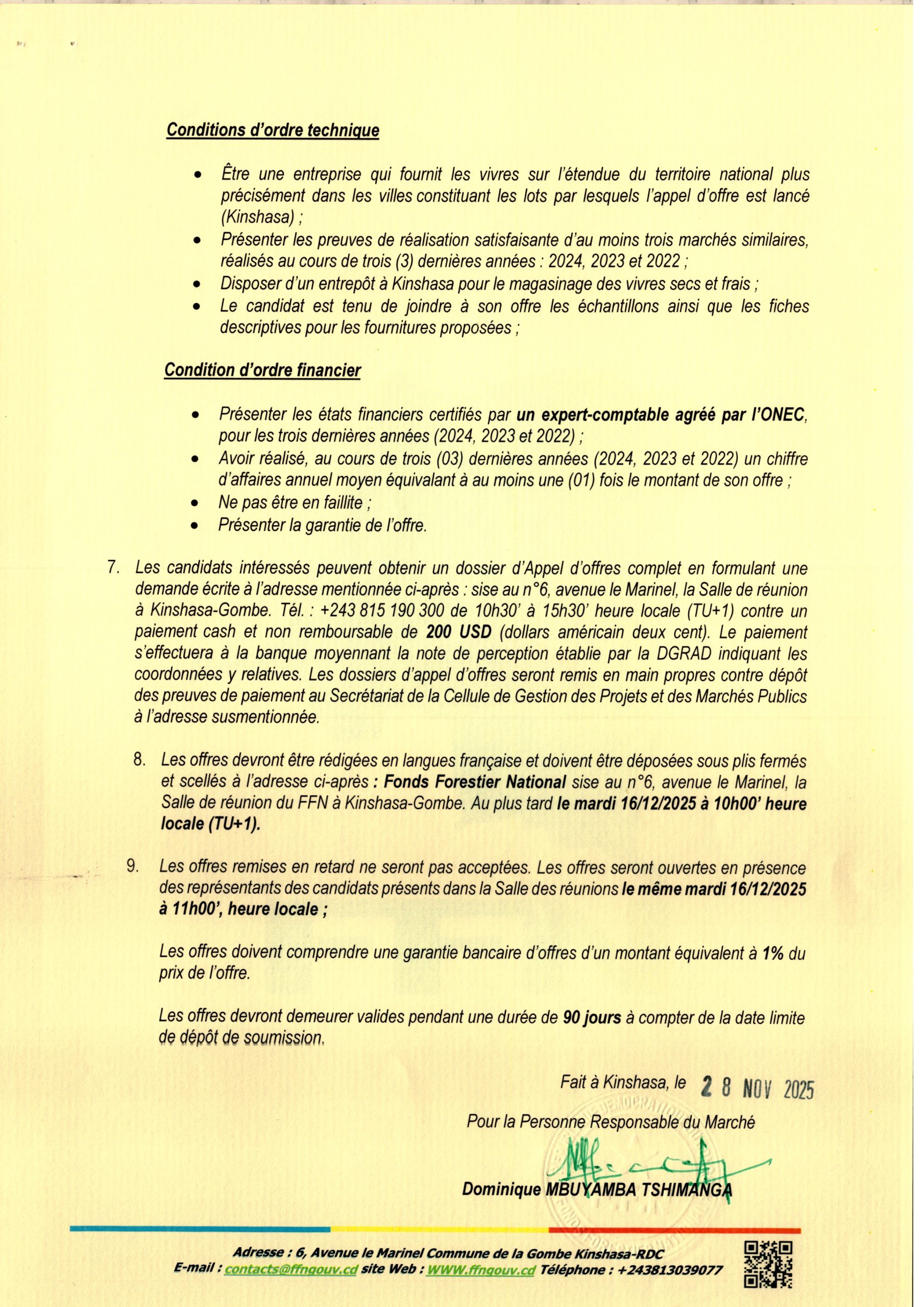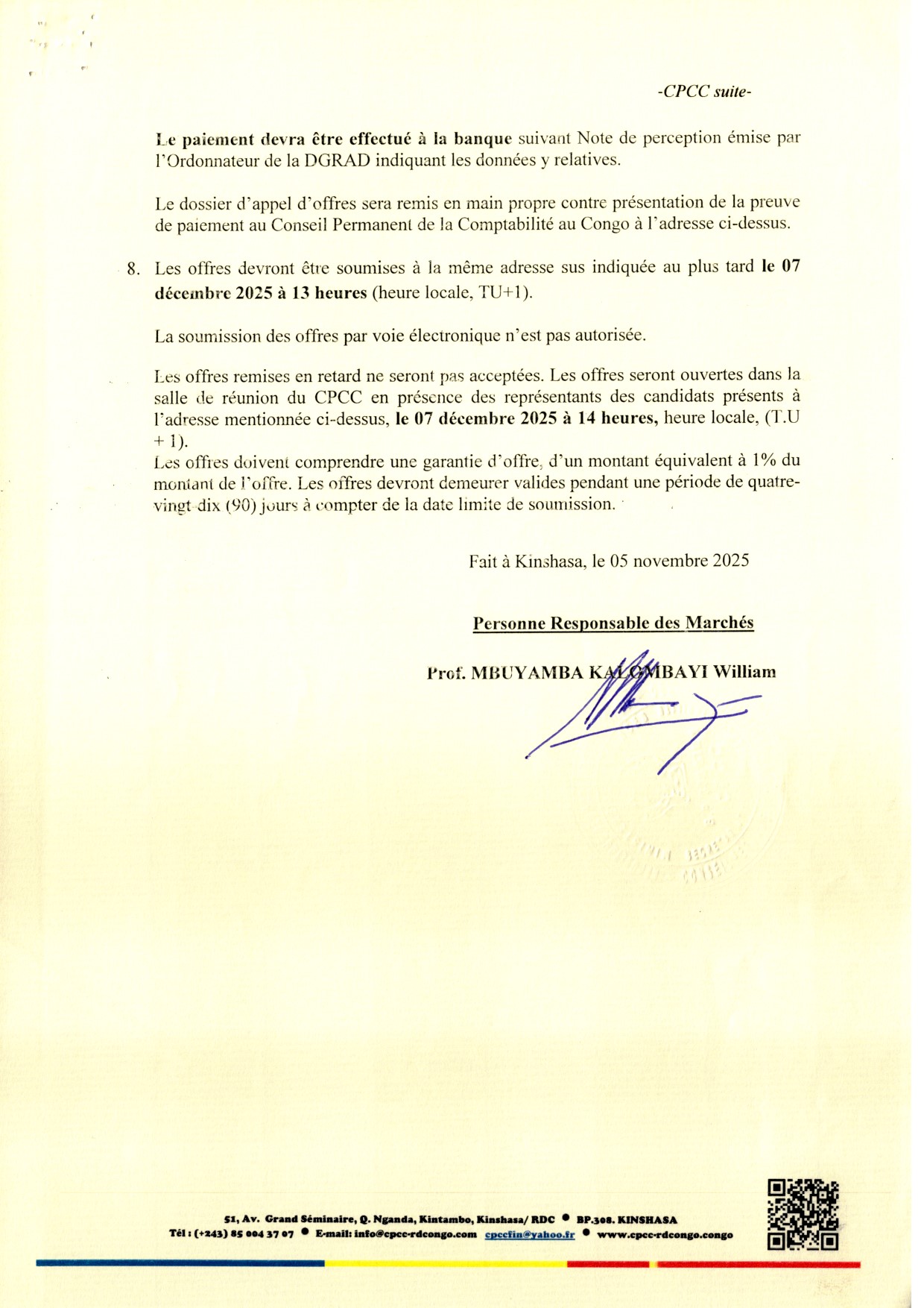 Communique Officiel aux soumissionnaires, que le date du dépôt des soumissions est fixée au 29 décembre 2025, à 13h00 (GMT+1) au siège du Conseil Permanent de la Comptabilité au Congo