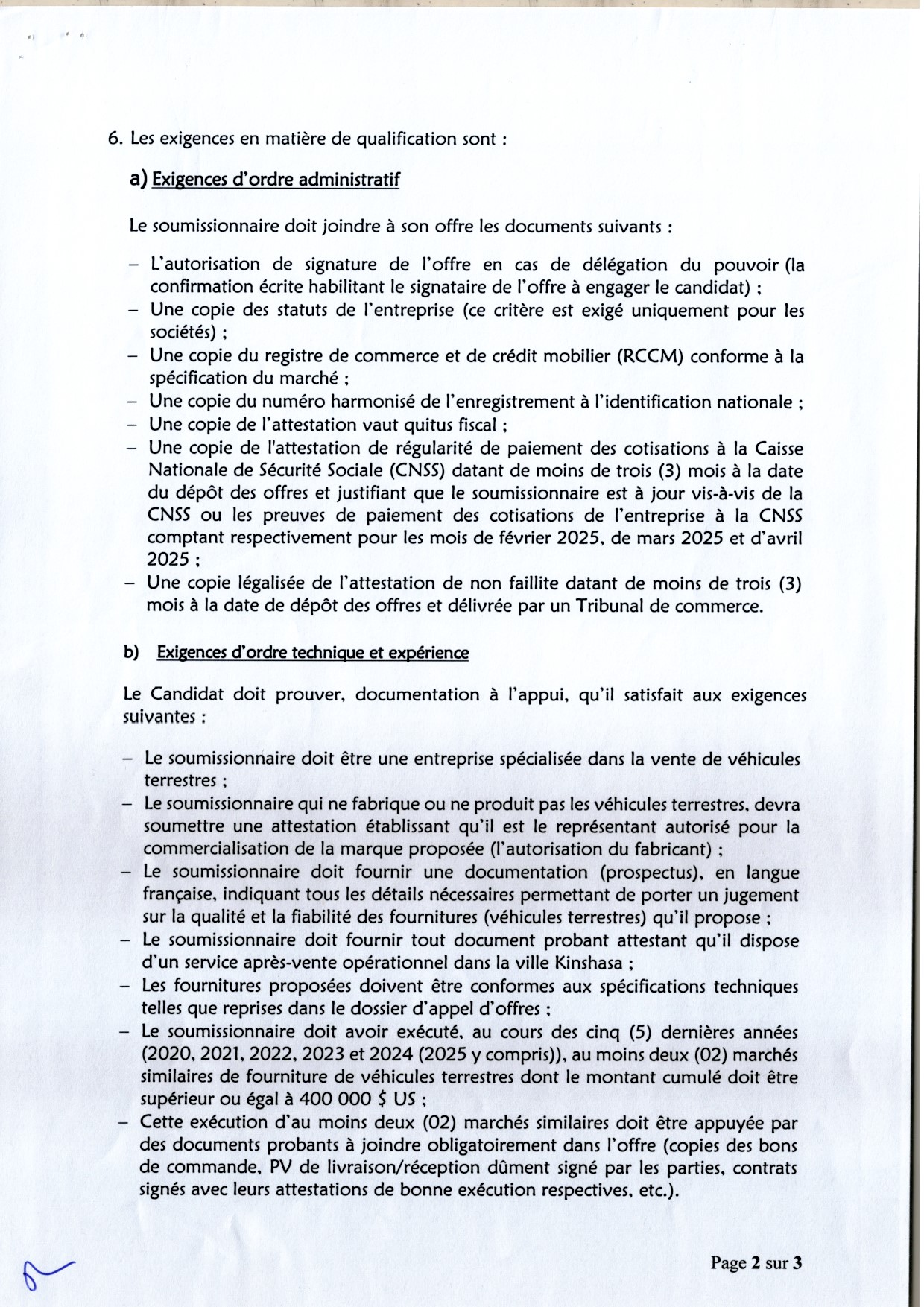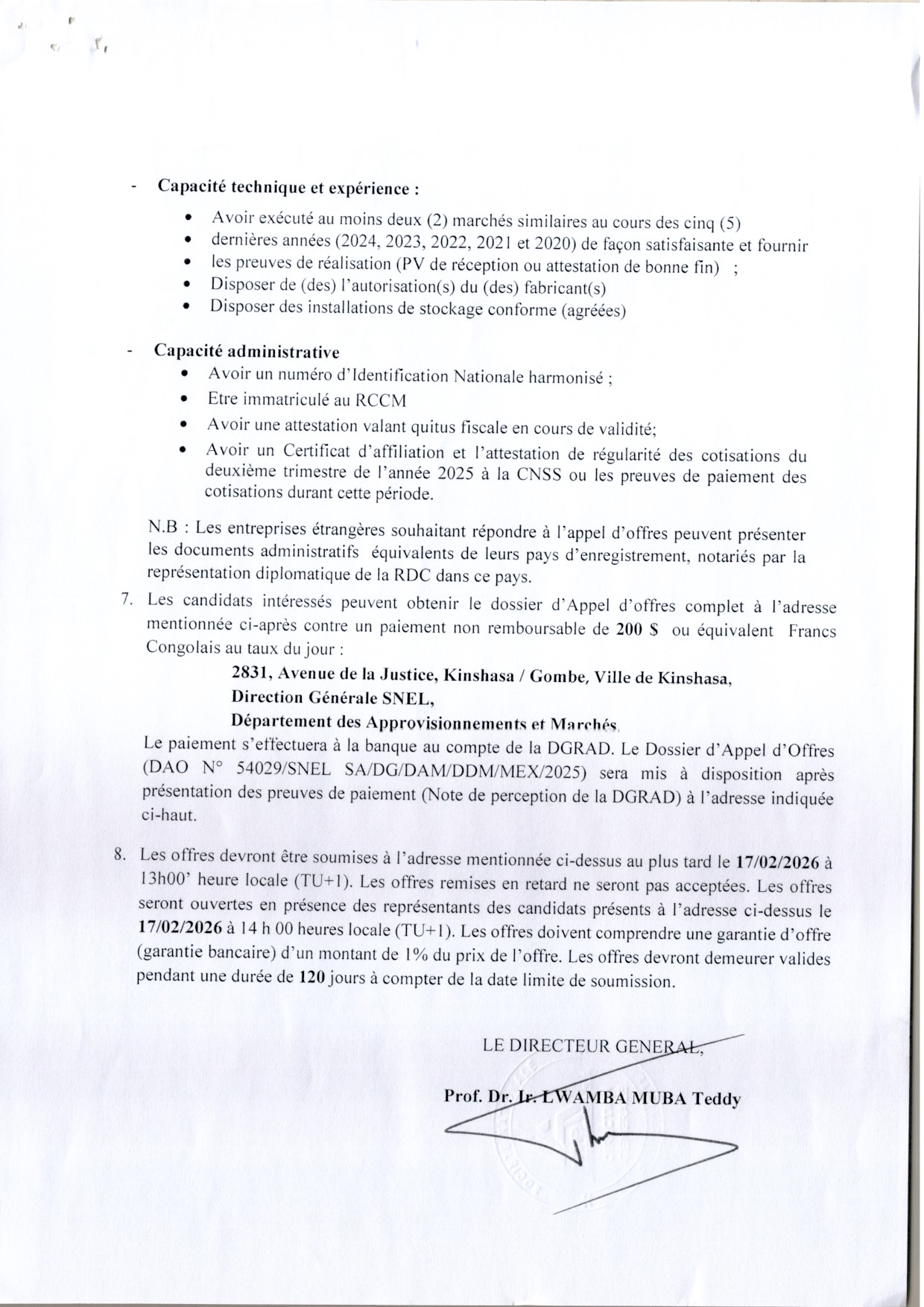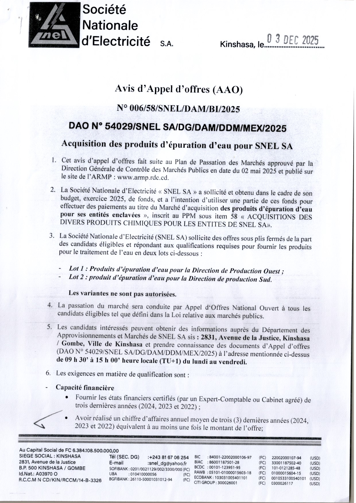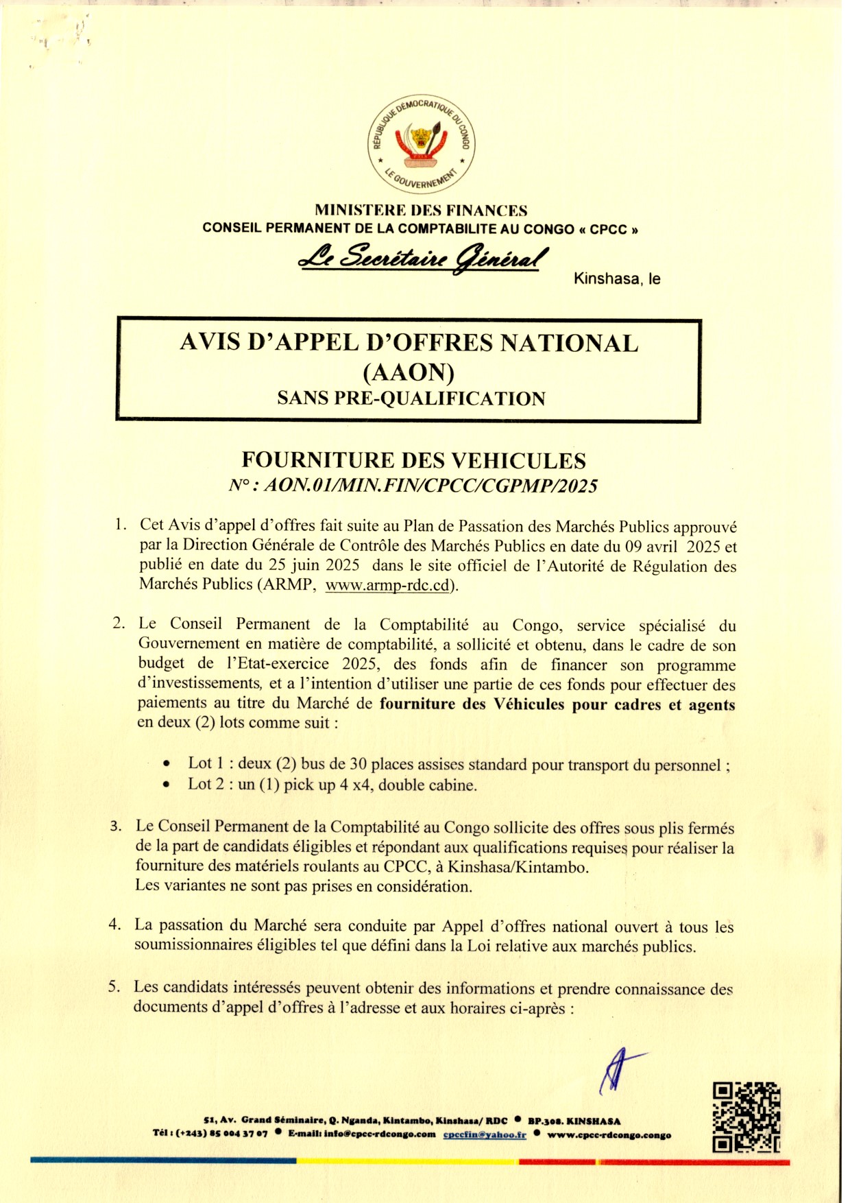 Communique Officiel aux soumissionnaires, que le date du dépôt des soumissions est fixée au 29 décembre 2025, à 13h00 (GMT+1) au siège du Conseil Permanent de la Comptabilité au Congo