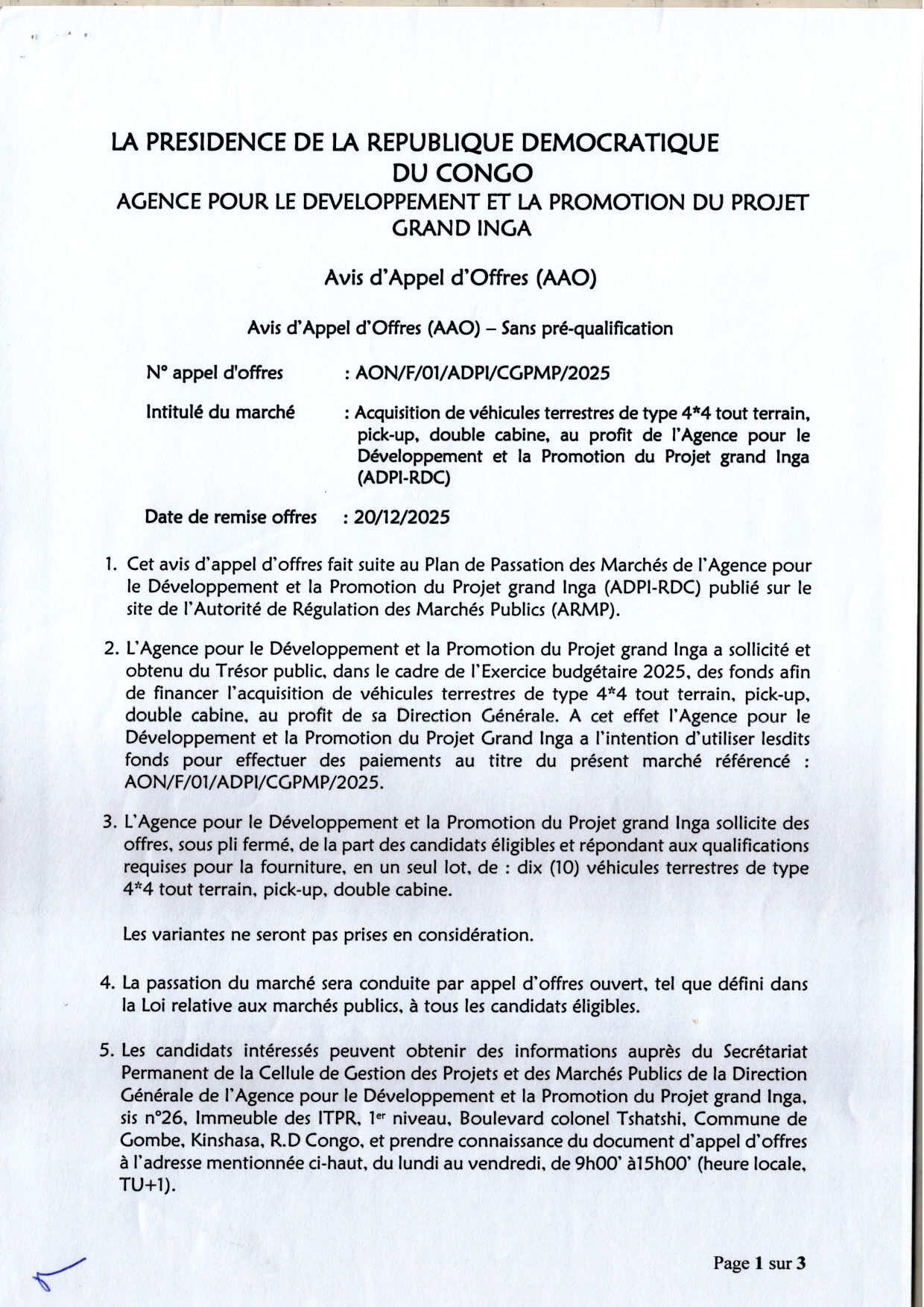 Acquisition de véhicules terrestres de type 4×4 tout terrain, pick-up, double cabine, au profit de l’Agence pour le Développement et la Promotion du Projet grand Inga (ADPI-RDC)