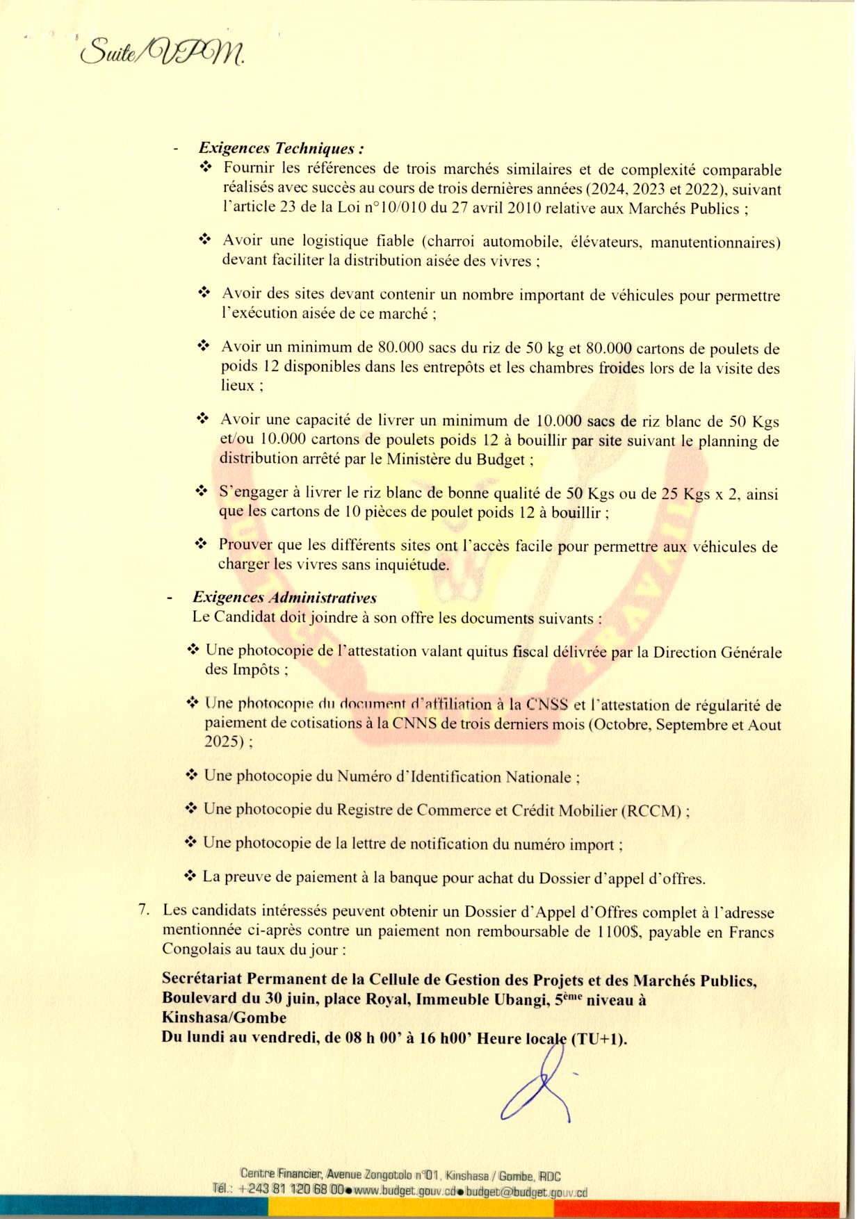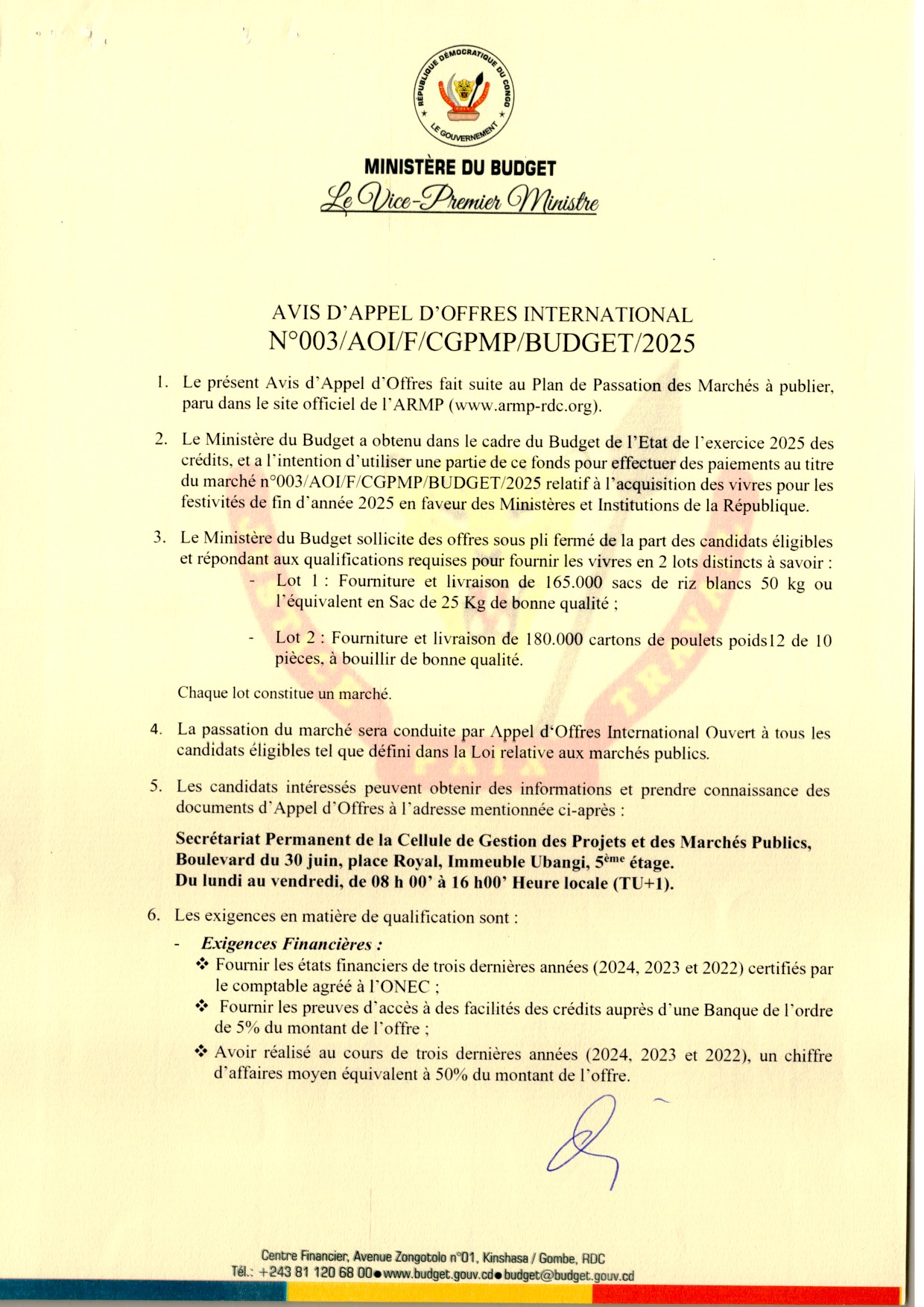 Acquisition des vivres pour les festivités de fin d’année 2025 en faveur des Ministères et Institutions de la République (lot 1 et lot 2).