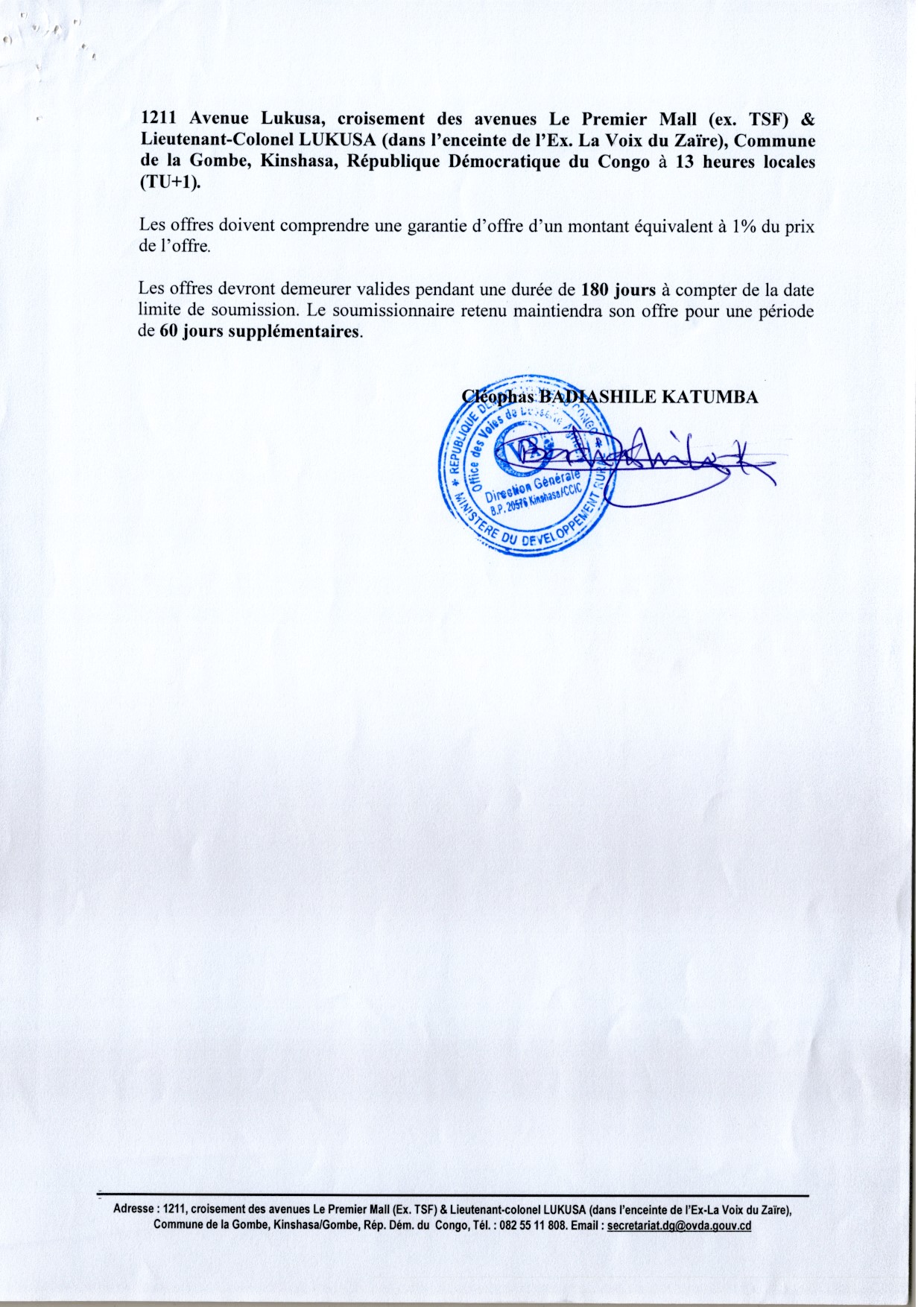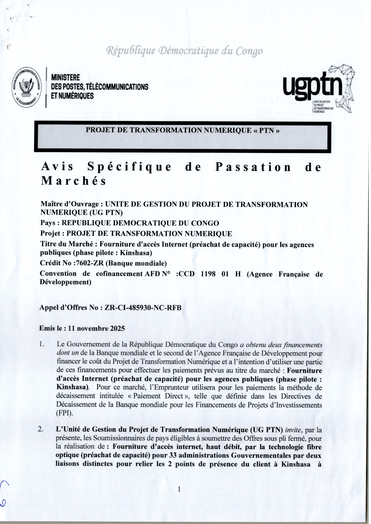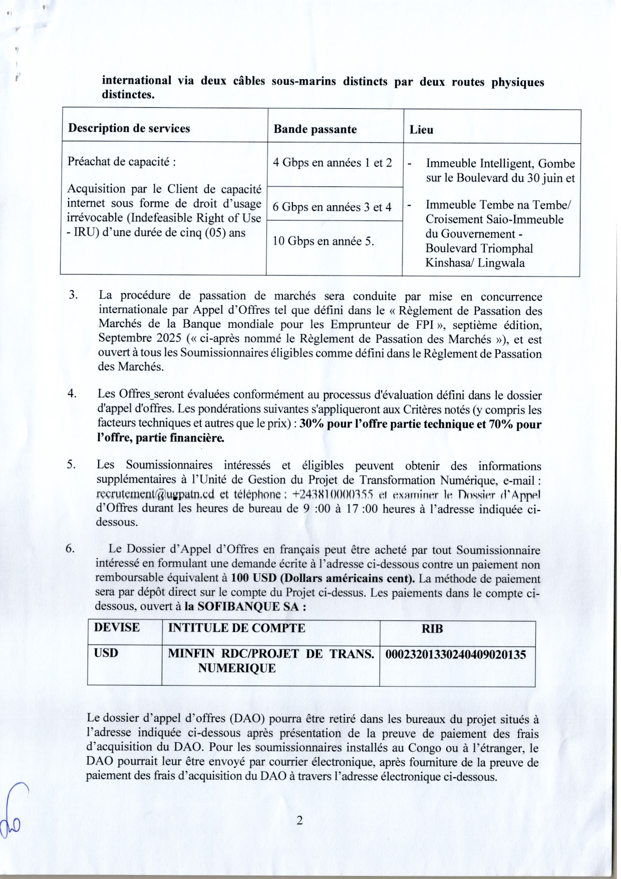 Fourniture d’accès Internet (préachat de capacité) pour les agences publiques (phase pilote : Kinshasa).