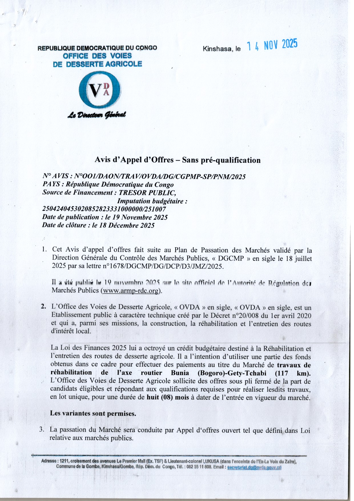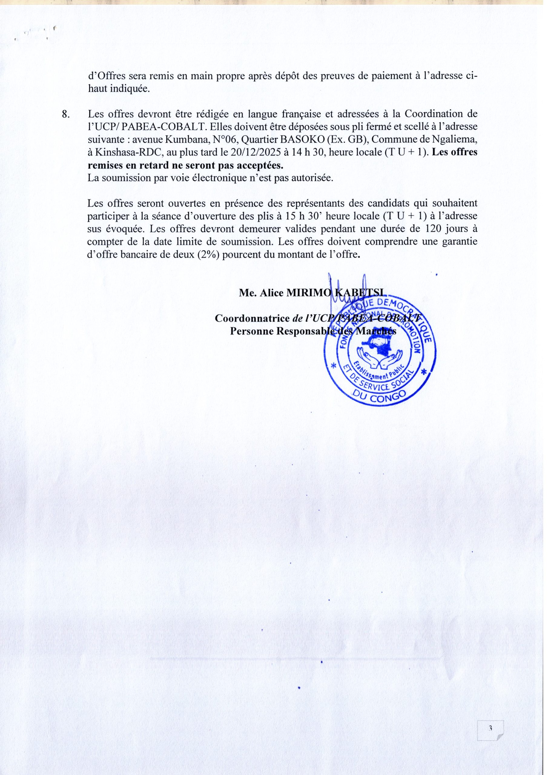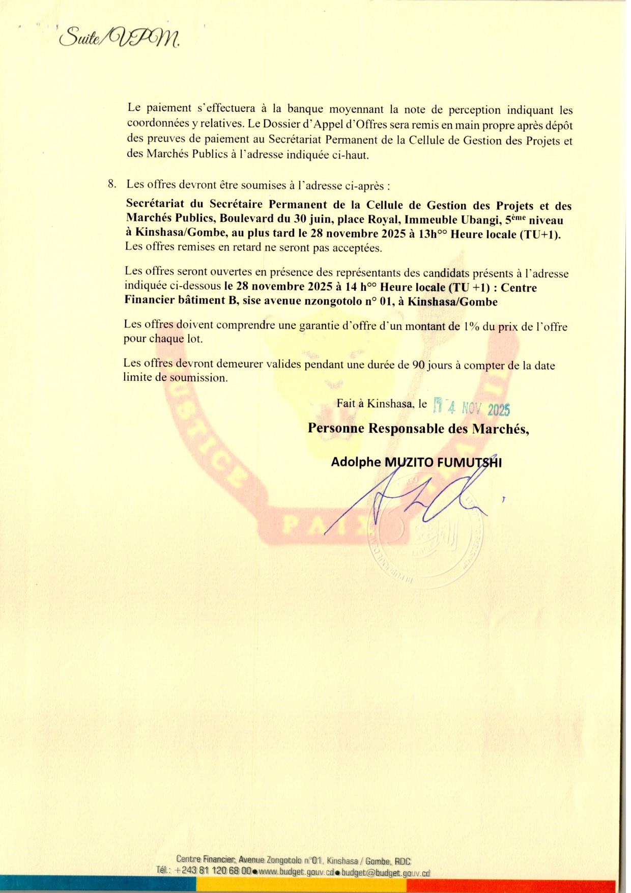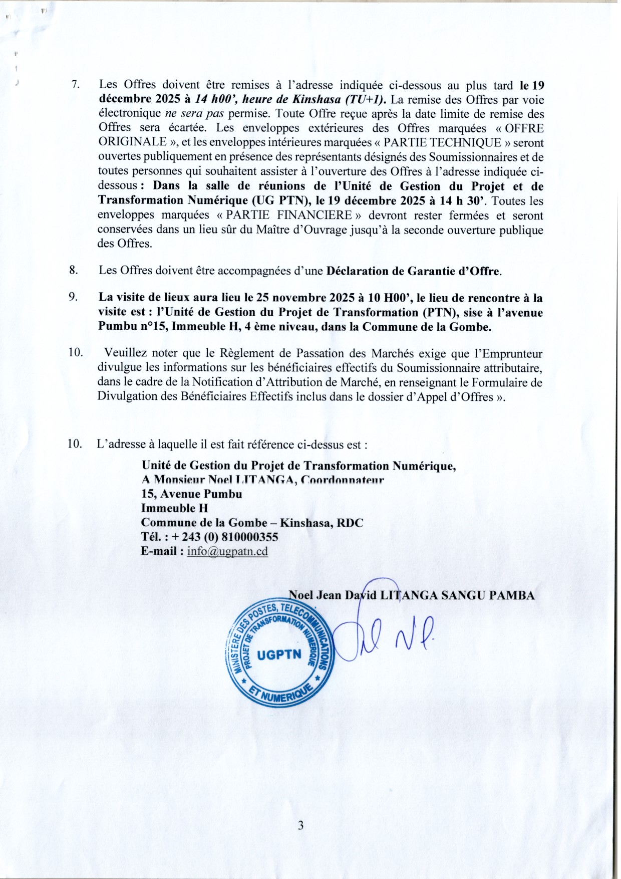 Fourniture d’accès Internet (préachat de capacité) pour les agences publiques (phase pilote : Kinshasa).