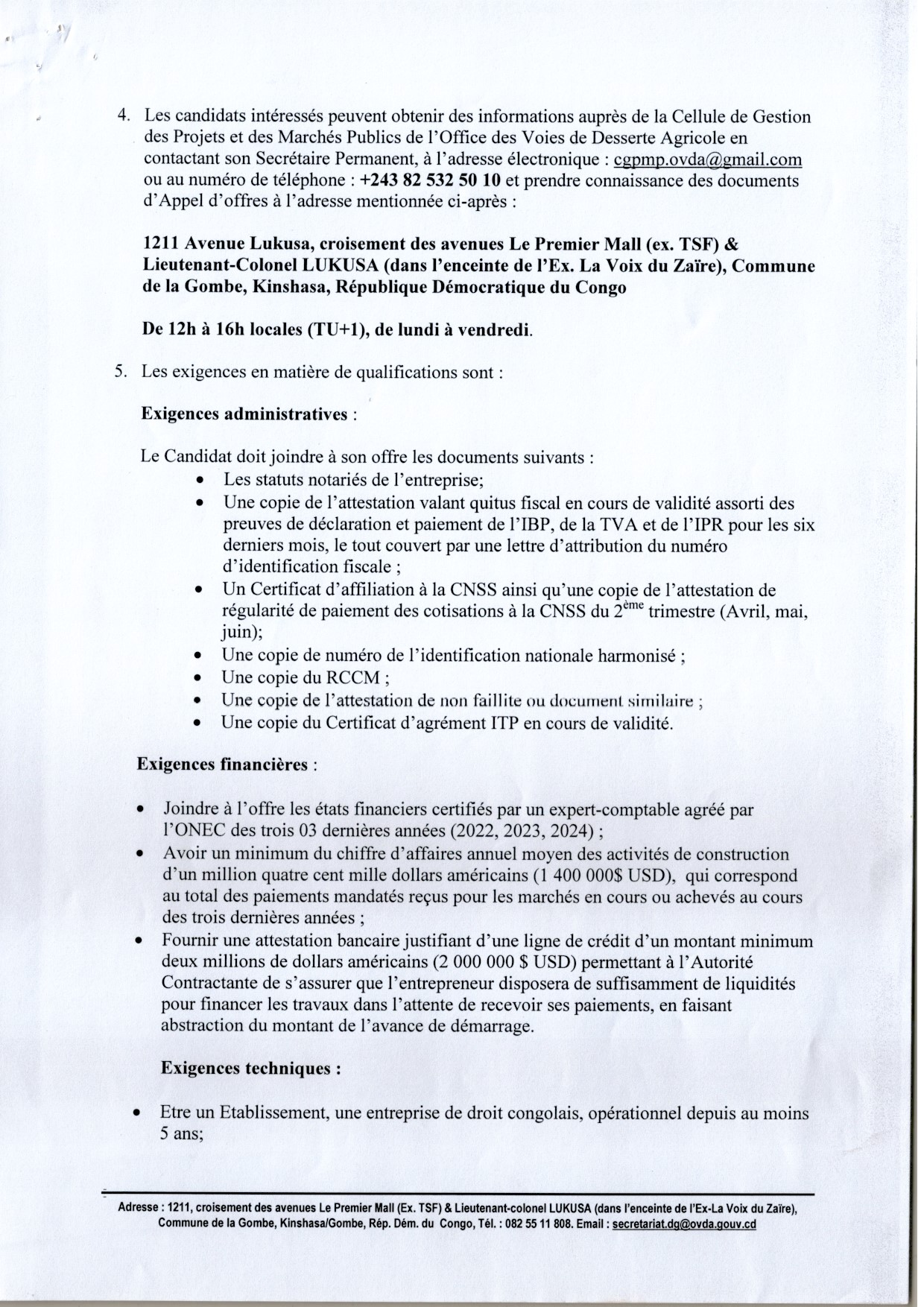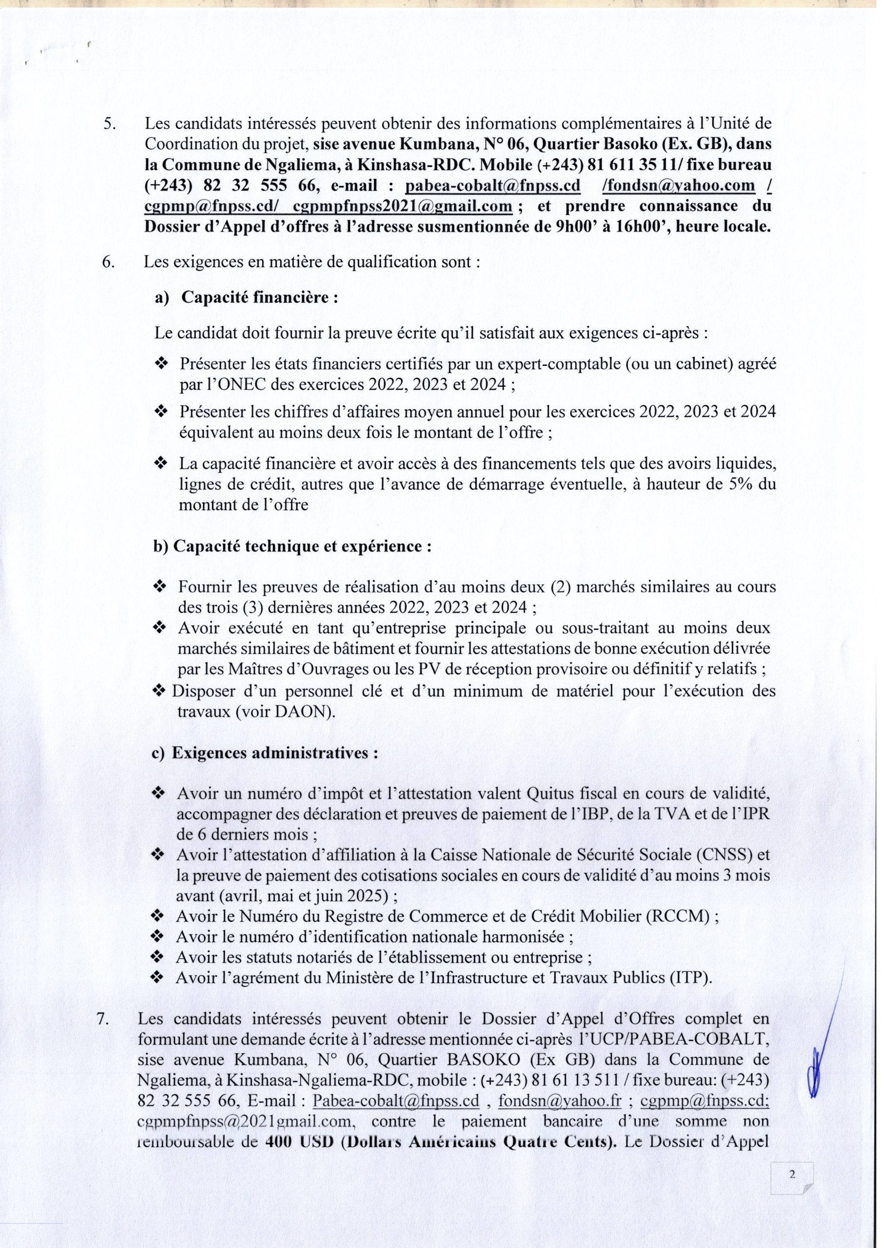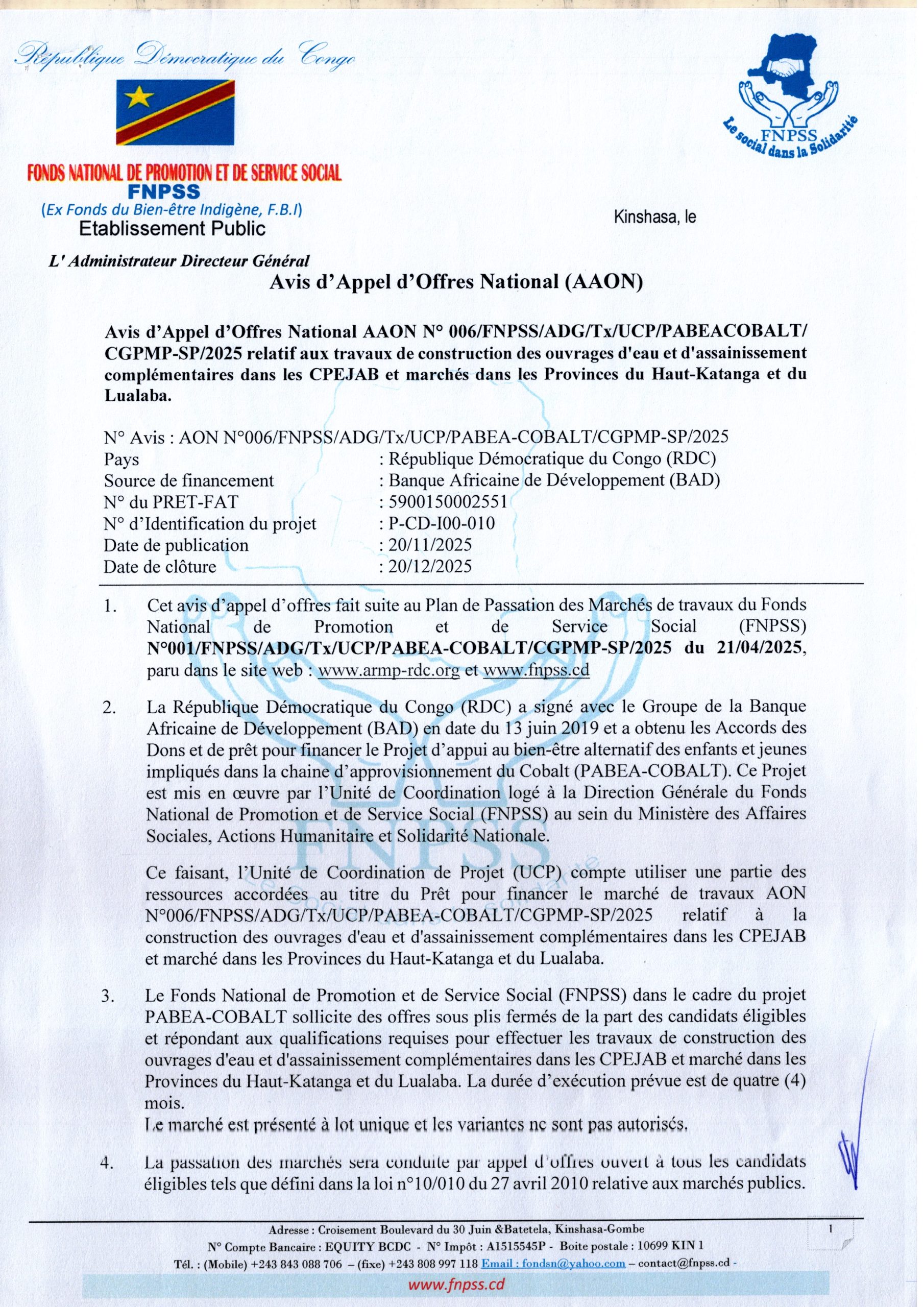 Travaux de construction des ouvrages d’eau et d’assainissement complémentaires dans les CPEJAB et marchés dans les provinces du Haut-Katanga et du Lualaba.