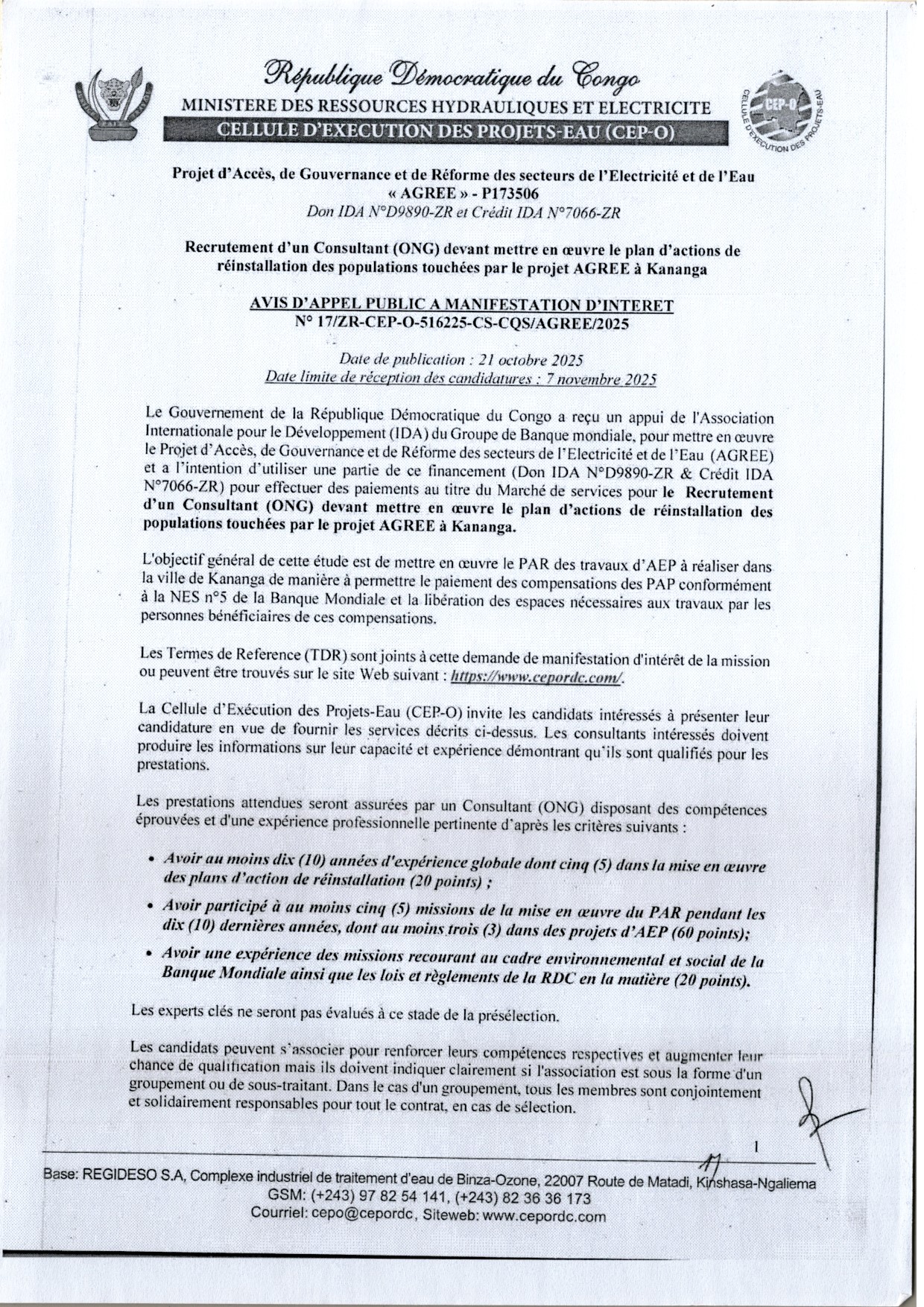 Recrutement d’un Consultant devant mettre en œuvre le plan d’actions de réinstallation des populations touchées par le projet AGREE à Kinshasa