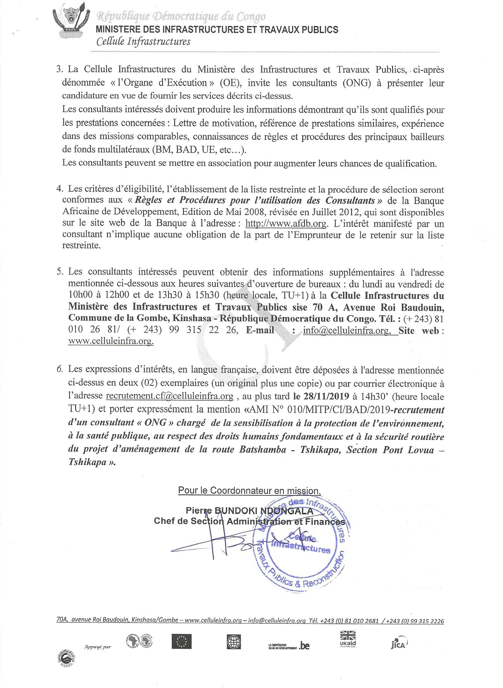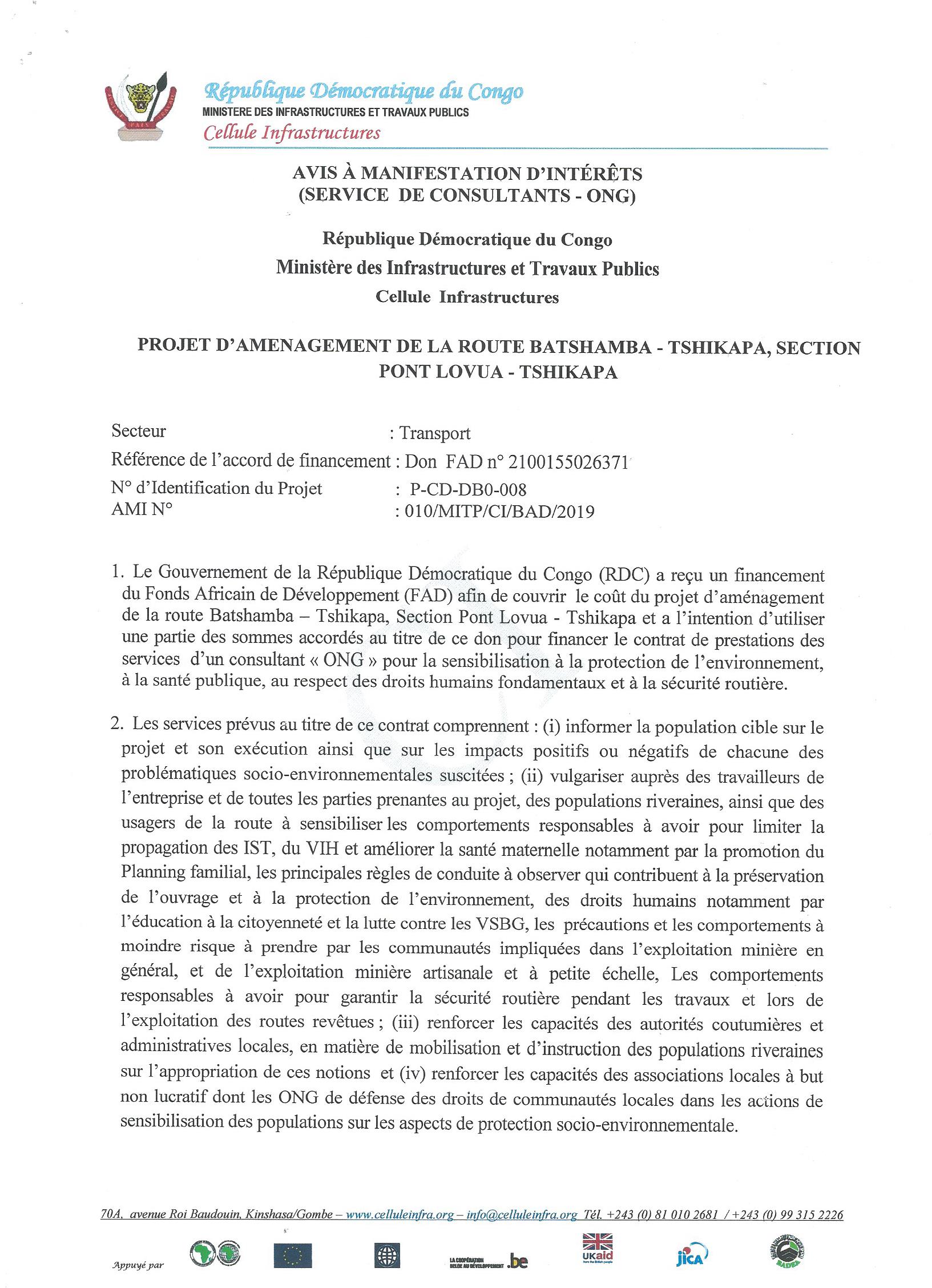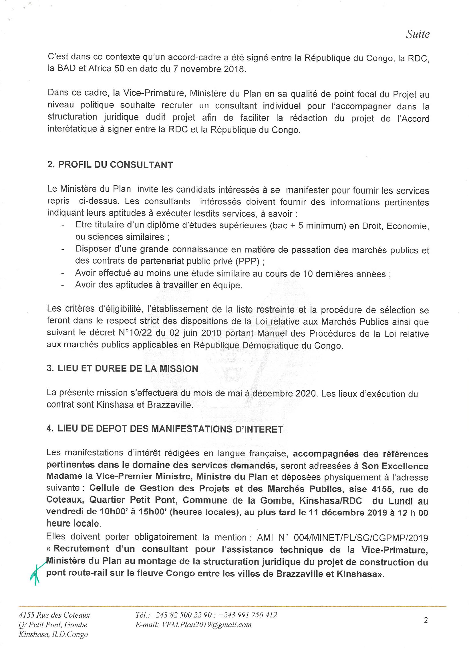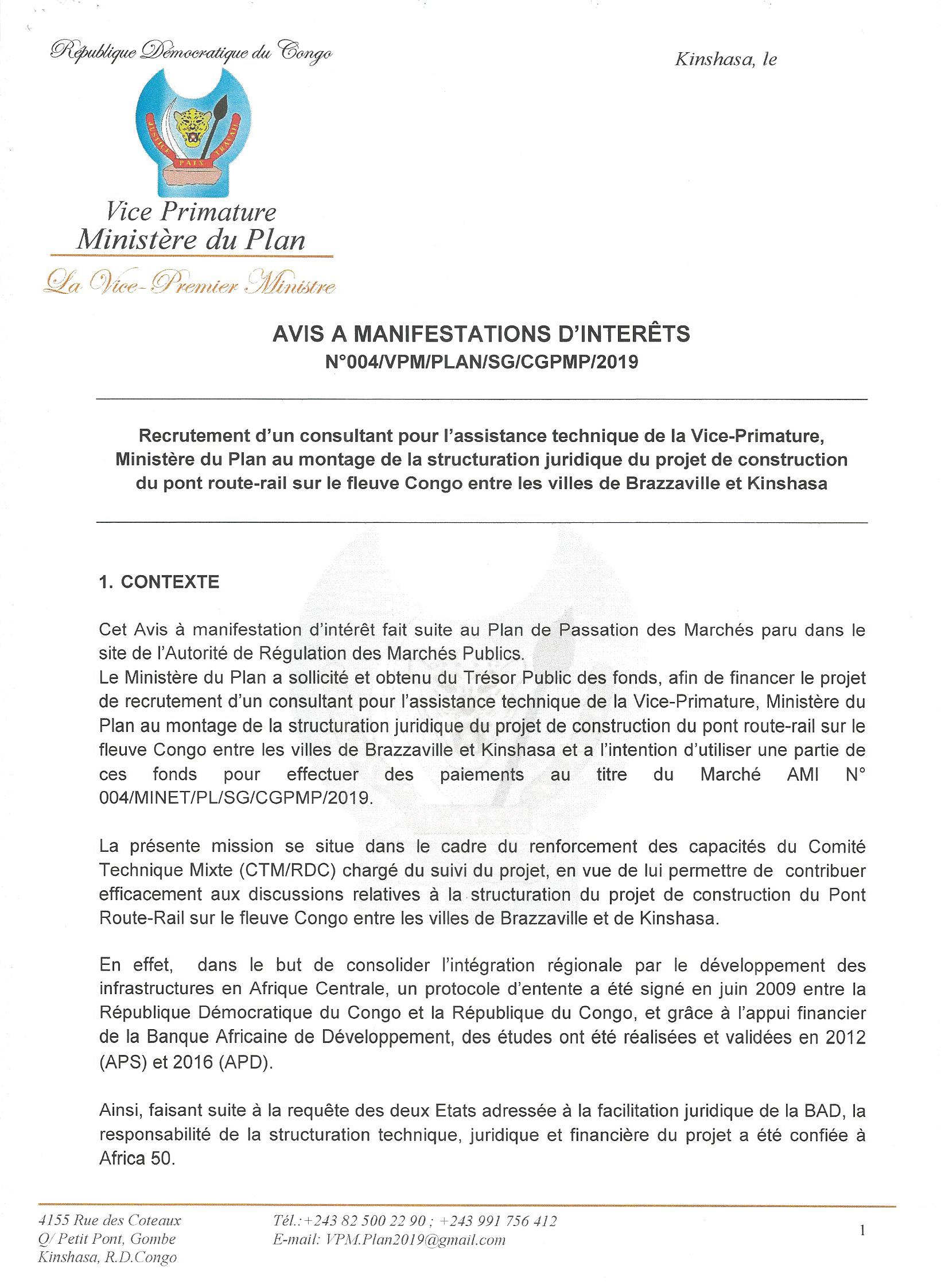 RECRUTEMENT D’UN CONSULTANT POUR L’ASSISTANCE TECHNIQUE DE LA VICE-PRIMATURE, MINISTÈRE DU PLAN AU MONTAGE DE LA STRUCTURATION JURIDIQUE DU PROJET DE CONSTRUCTION DU PONT ROUTE-RAIL SUR LE FLEUVE CONGO ENTRE LES VILLES DE BRAZZAVILLE ET KINSHASA.