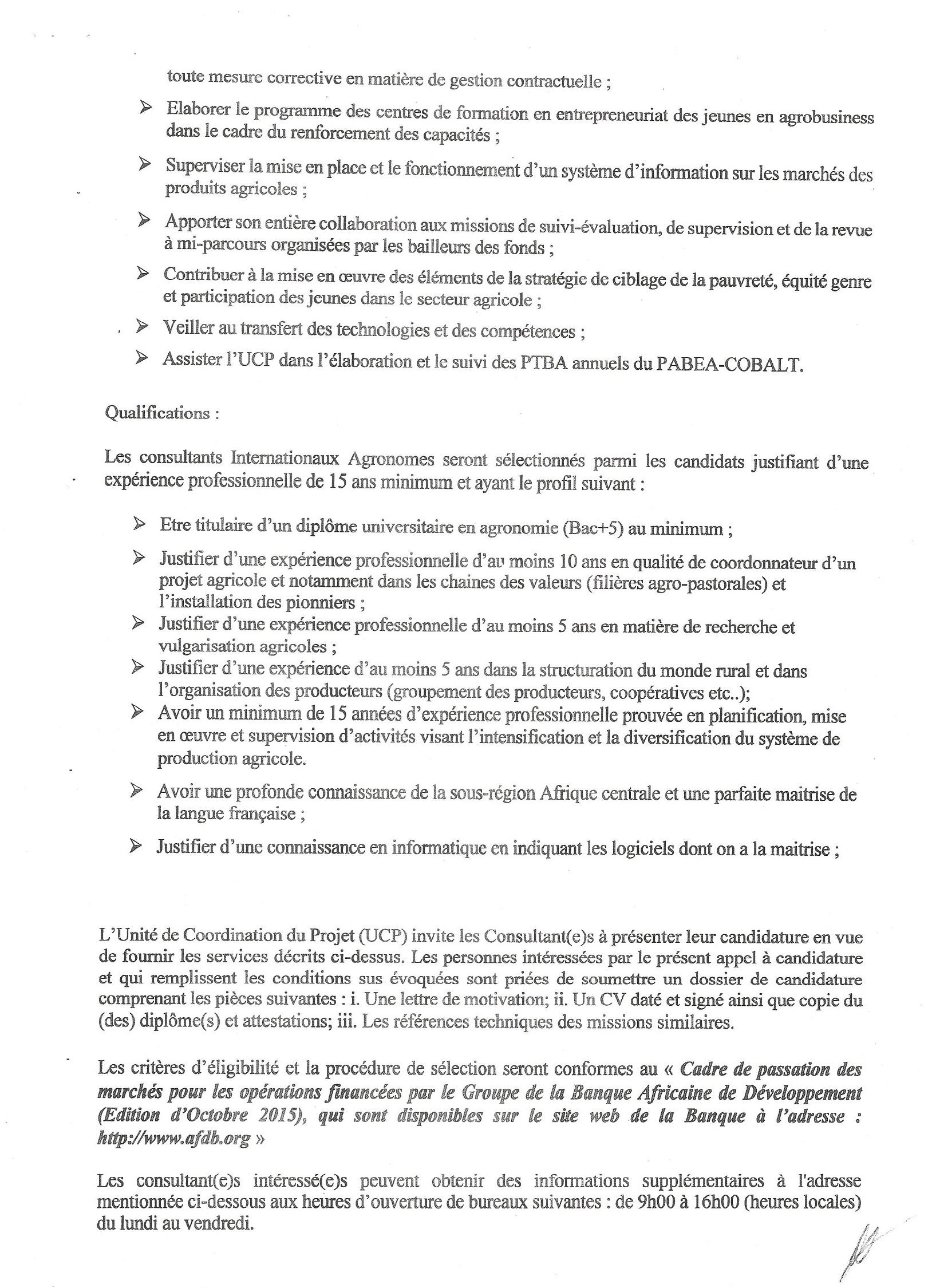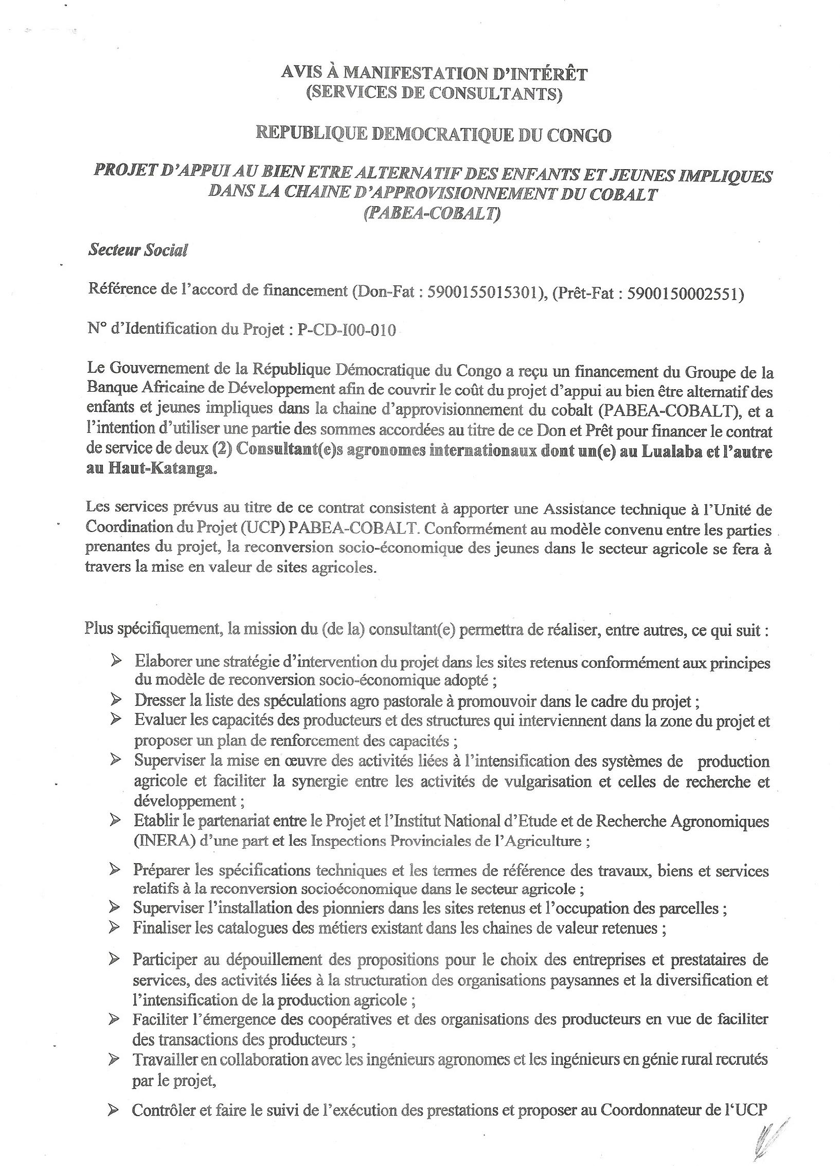 RECRUTEMENT DE DEUX (2) CONSULTANT(E)S AGRONOMES INTERNATIONAUX DONT UN(E) AU LUALABA ET L’AUTRE AU HAUT-KATANGA.