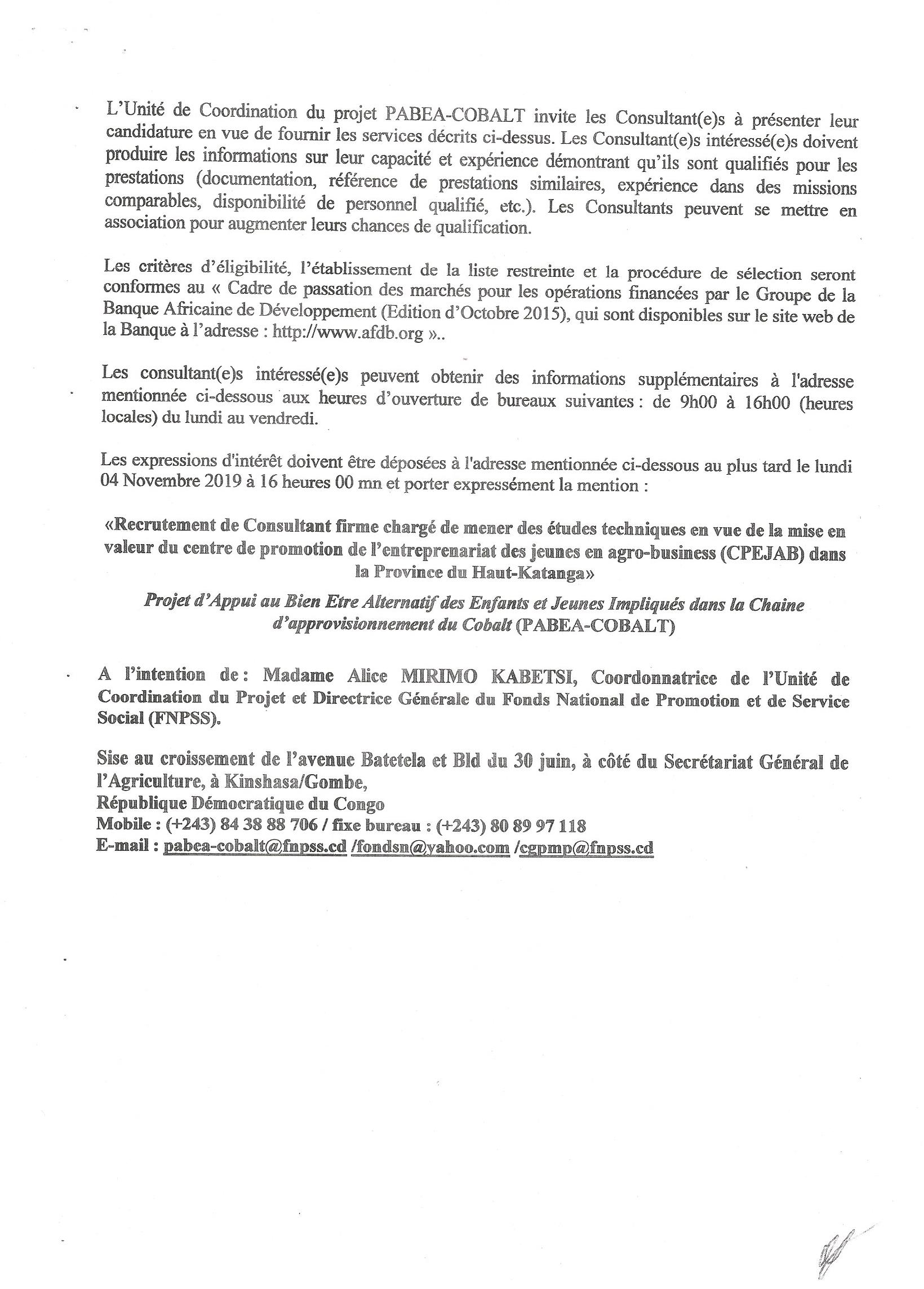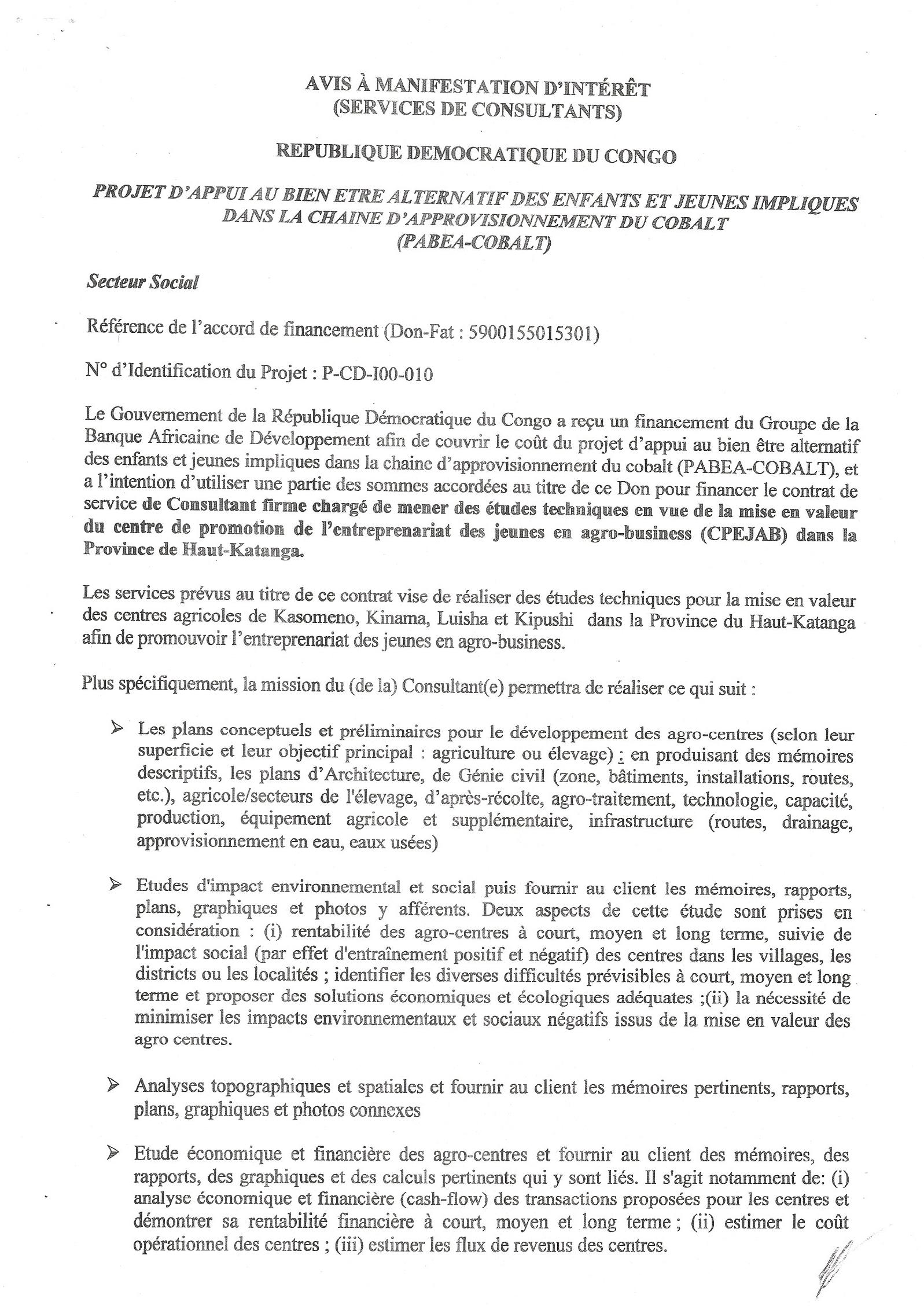 Recrutement d’un Consultant firme, chargée de mener des études techniques en vue de la mise en valeur du centre de promotion de l’entreprenariat des en Agro-business dans la Province de Haut-Katanga.