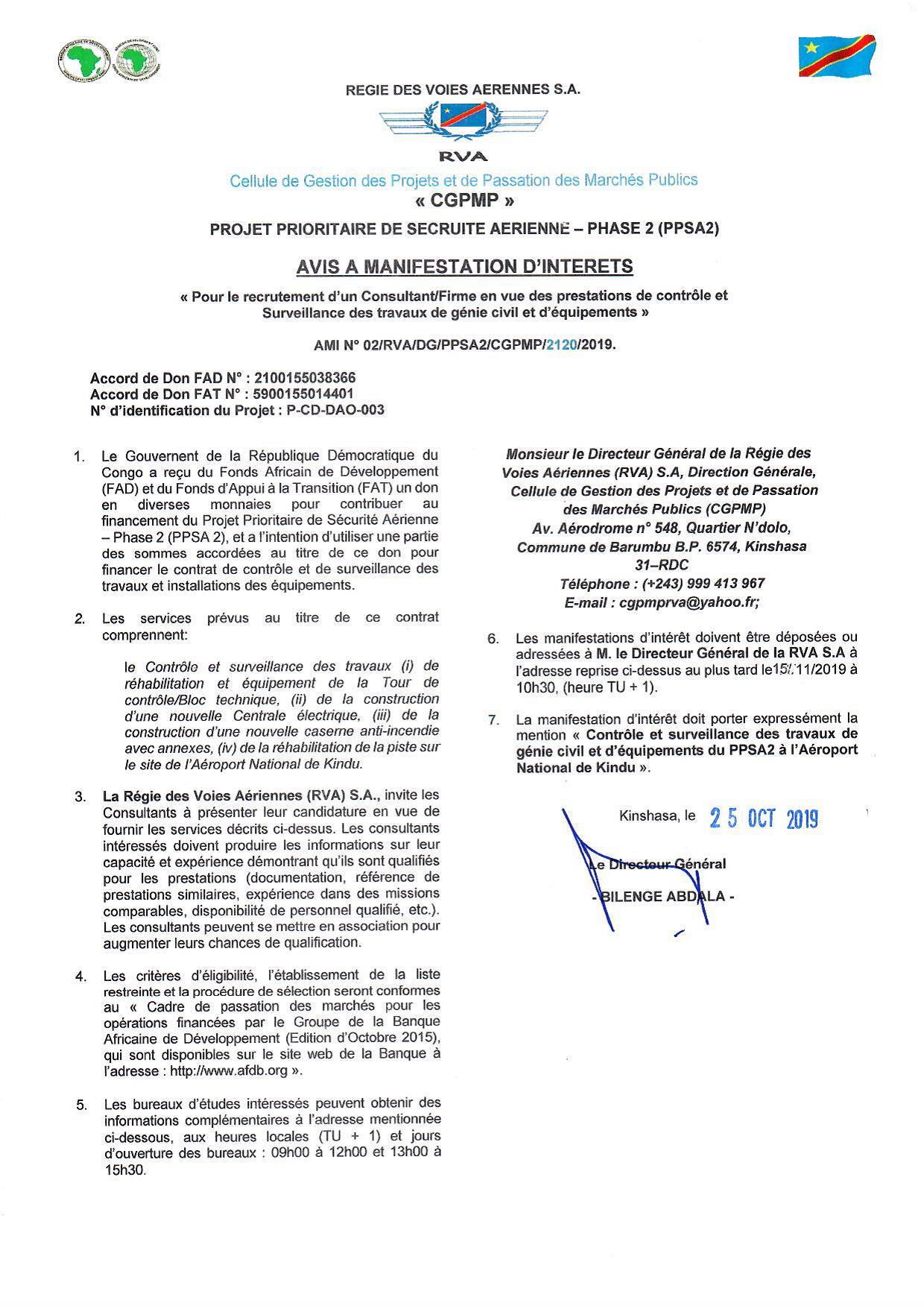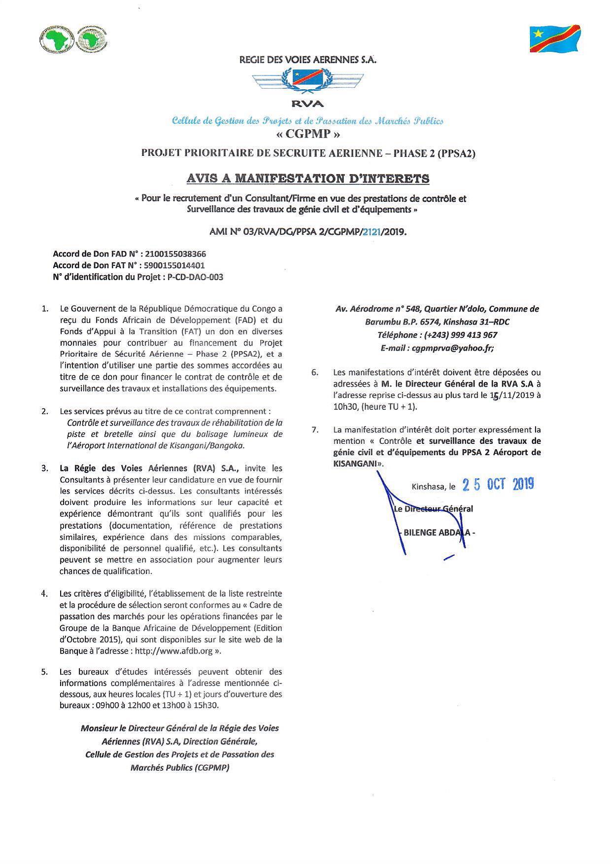 RECRUTEMENT D’UN CONSULTANT/FIRME EN VUE DES PRESTATIONS DE CONTRÔLE ET SURVEILLANCE DES TRAVAUX DE GÉNIE CIVIL ET D’ÉQUIPEMENTS »/KINSANGANI.