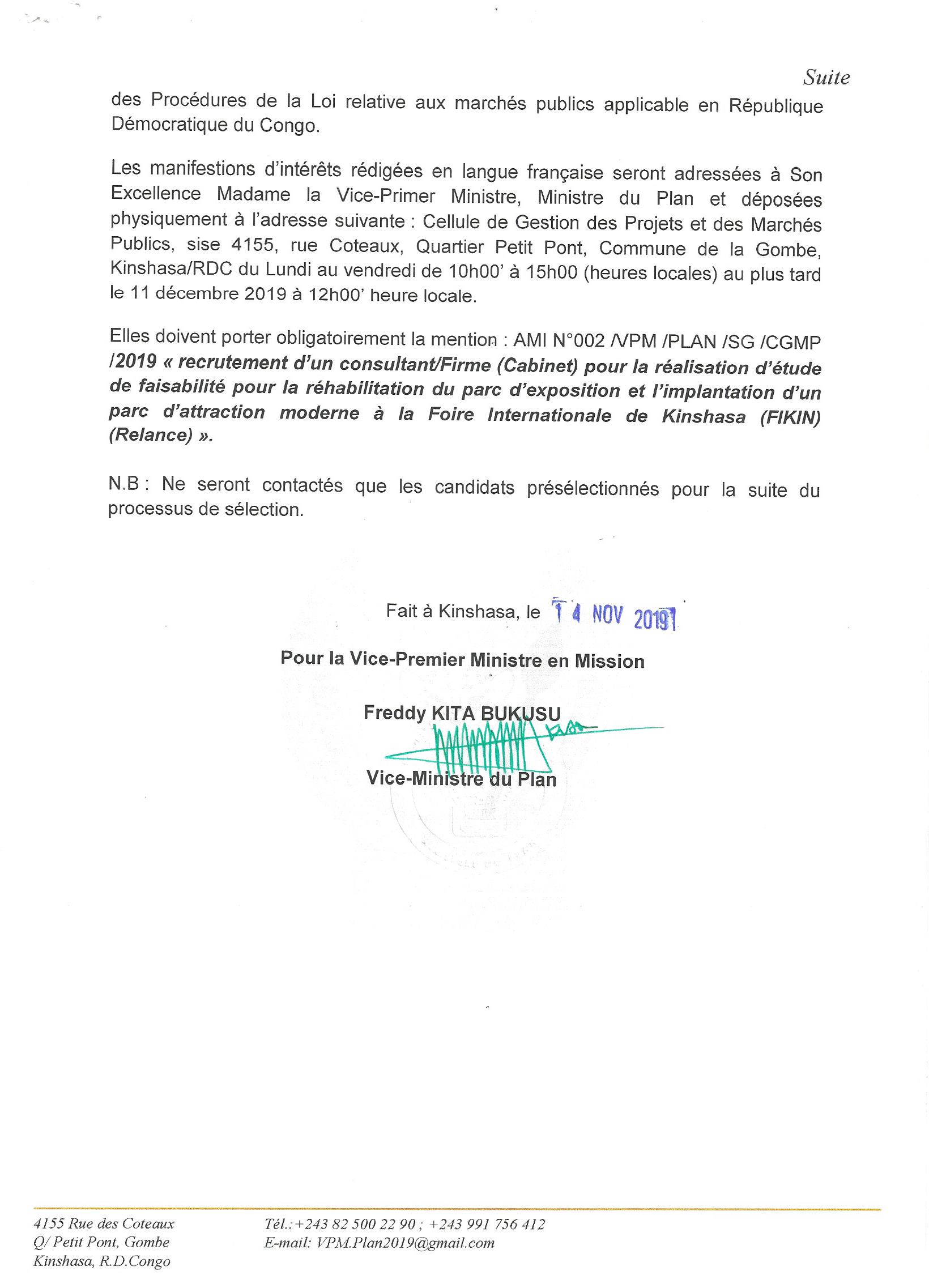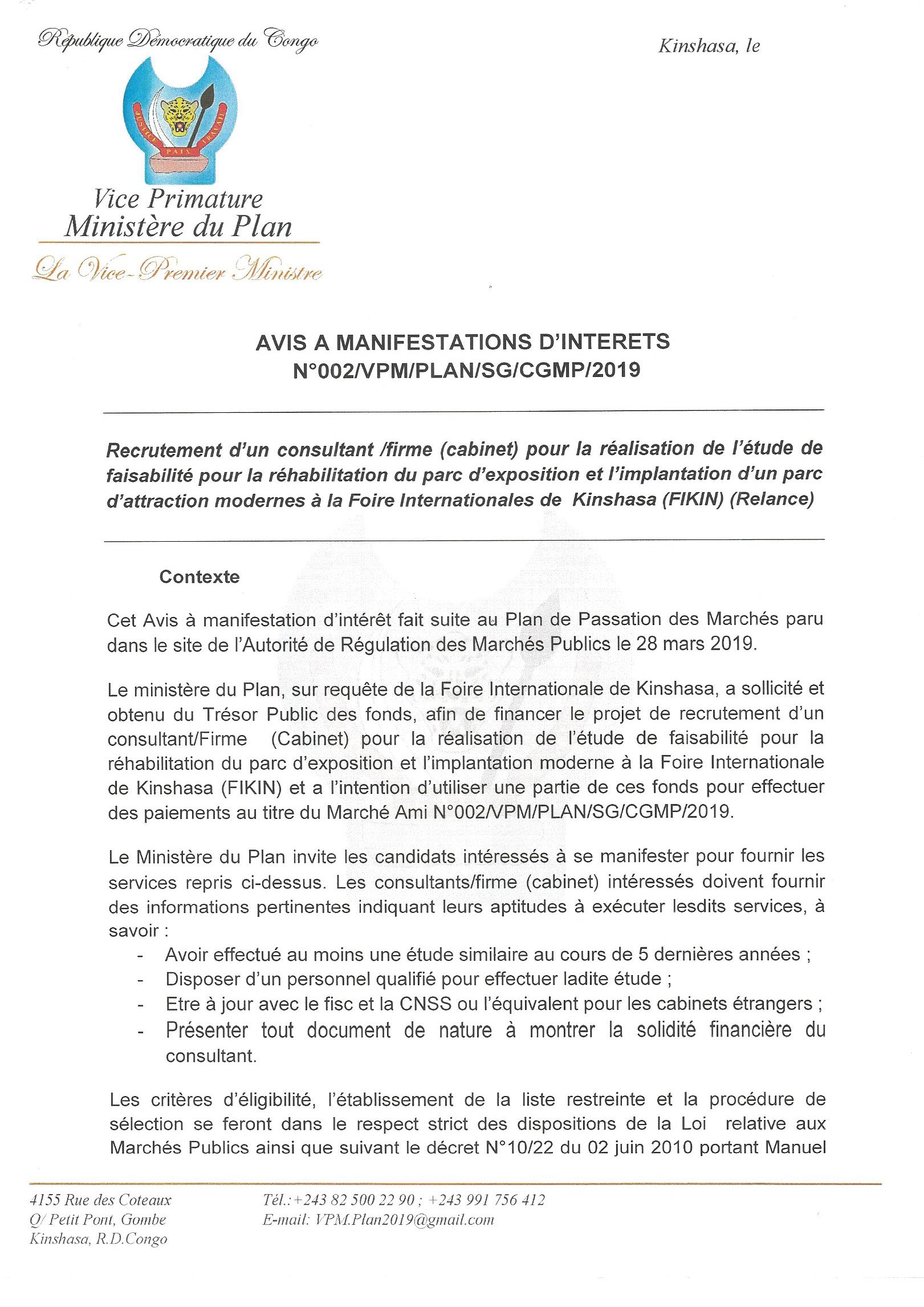 RECRUTEMENT D’UN CONSULTANT /FIRME (CABINET) POUR LA RÉALISATION DE L’ÉTUDE DE FAISABILITÉ POUR LA RÉHABILITATION DU PARC D’EXPOSITION ET L’IMPLANTATION D’UN PARC D’ATTRACTION MODERNES À LA FOIRE INTERNATIONALES DE KINSHASA (FIKIN).