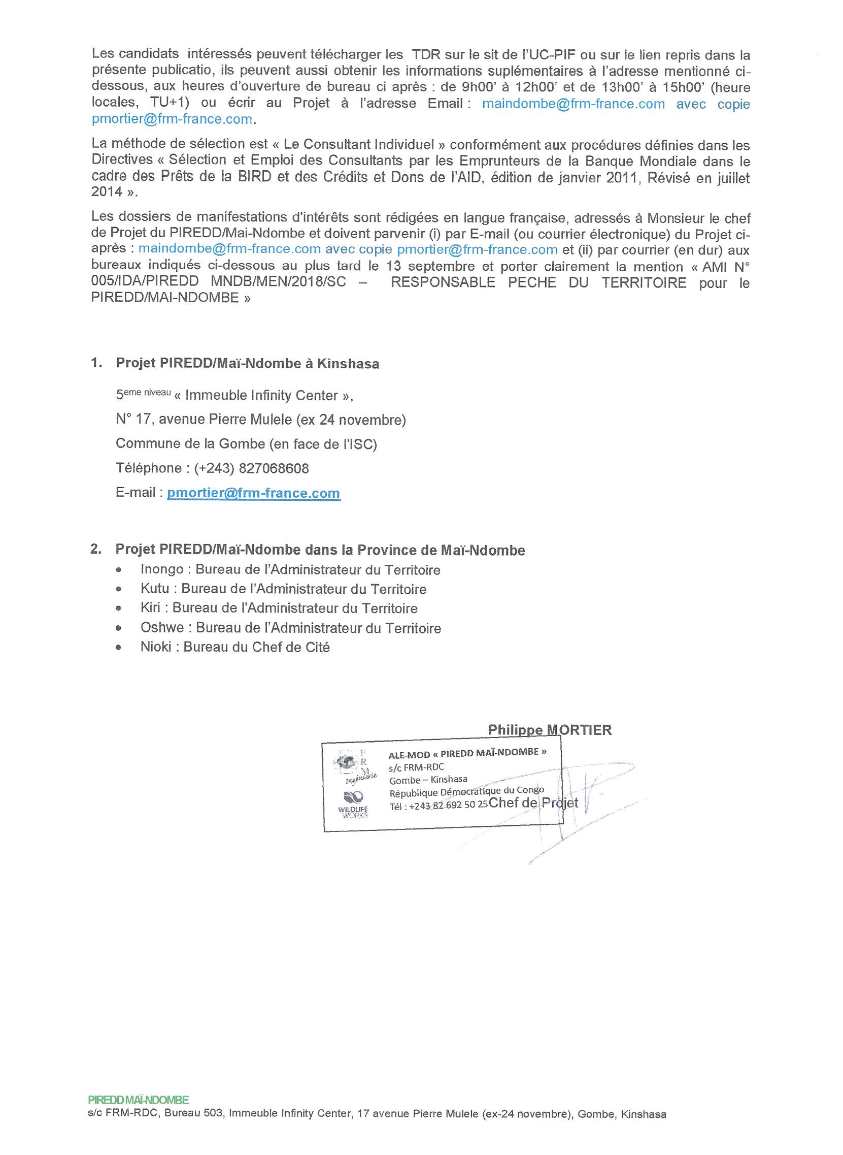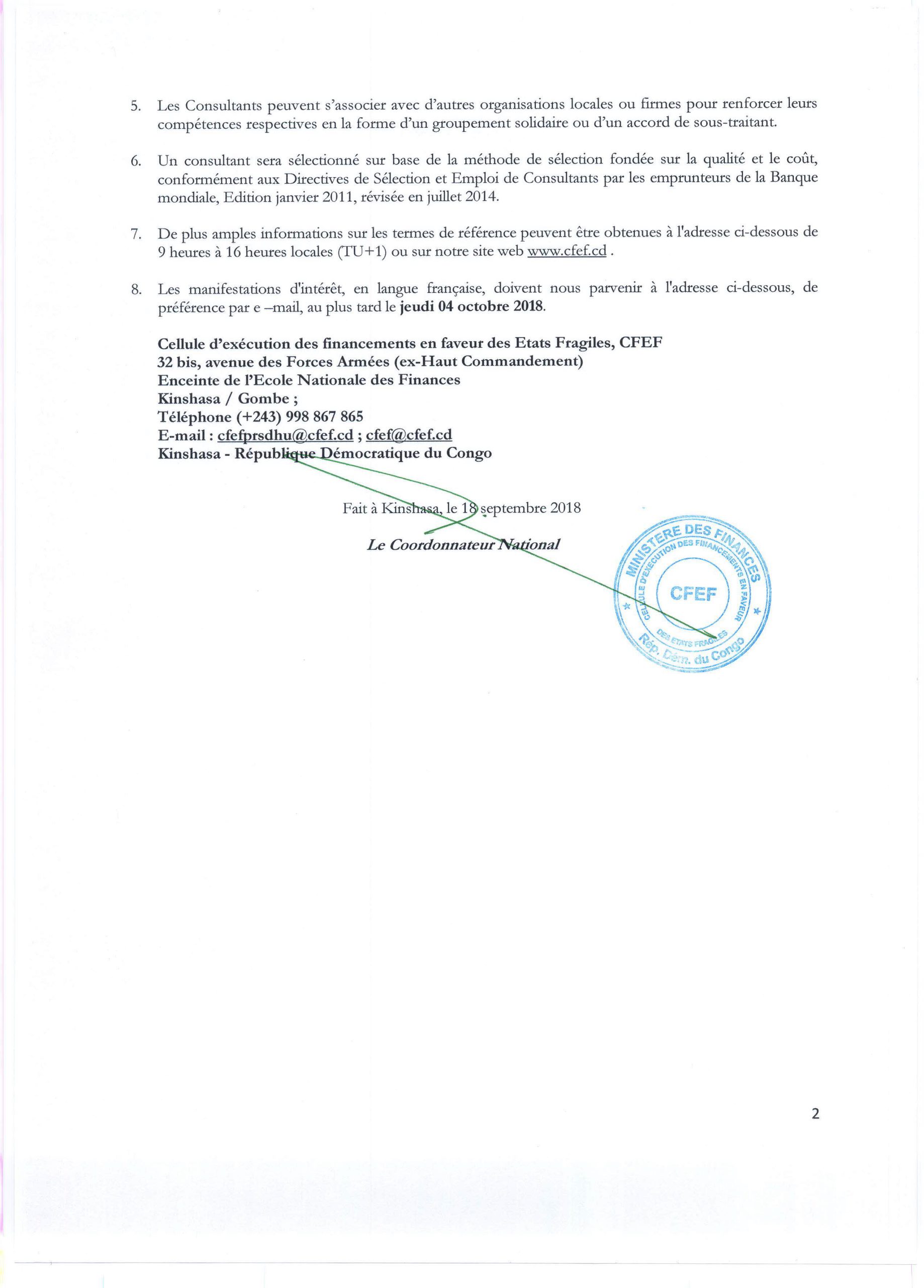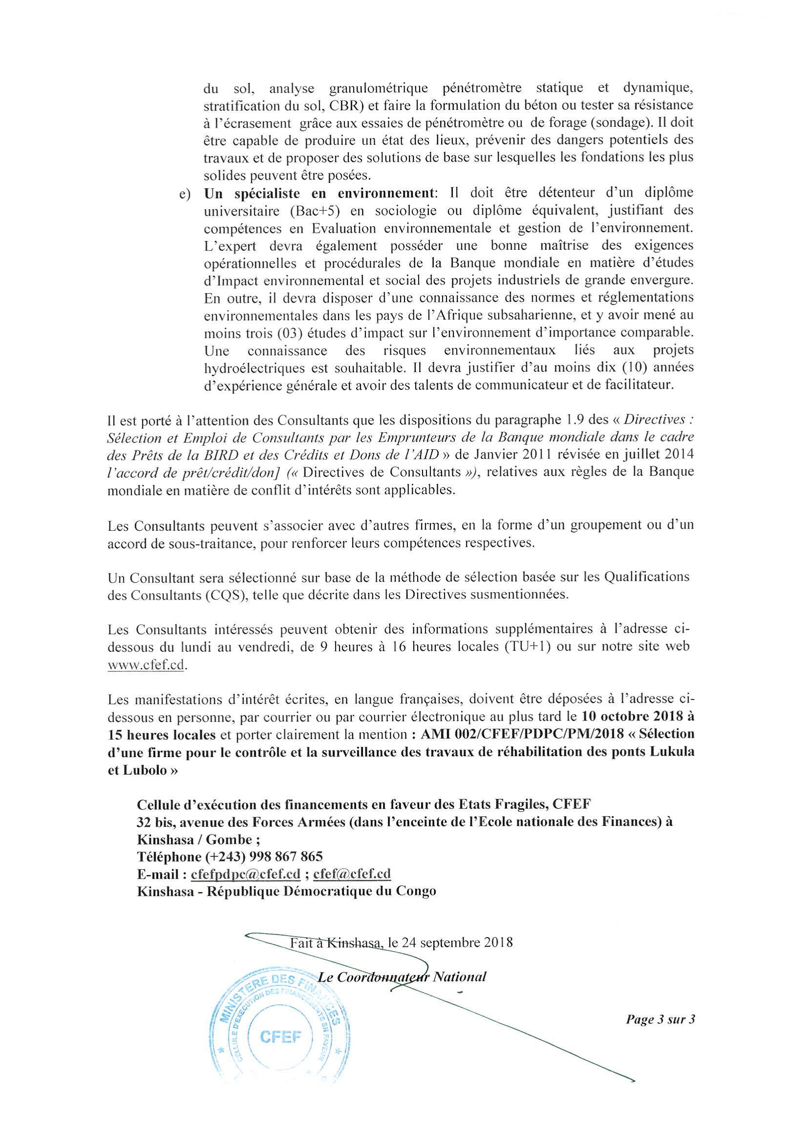 RECRUTEMENT D’UNE FIRME DE CONSULTANTS QUI SERA CHARGÉE DE LA MISSION DE CONTRÔLE ET SURVEILLANCE DES TRAVAUX DES PONTS LUKULA ET LUBOLO.