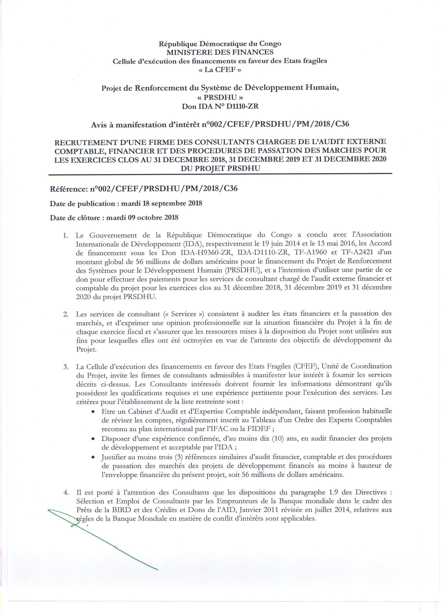 RECRUTEMENT D’UNE FIRME DES CONSULTANTS CHARGÉ DE L’AUDIT EXTERNE COMPTABLE, FINANCIER ET DES PROCÉDURES DE PASSATION DES MARCHES POUR LES EXERCICES CLOS AU 31 DÉCEMBRE 2018, 31 DÉCEMBRE 2019 ET 31 DÉCEMBRE 2020 DU PROJET PRSDHU