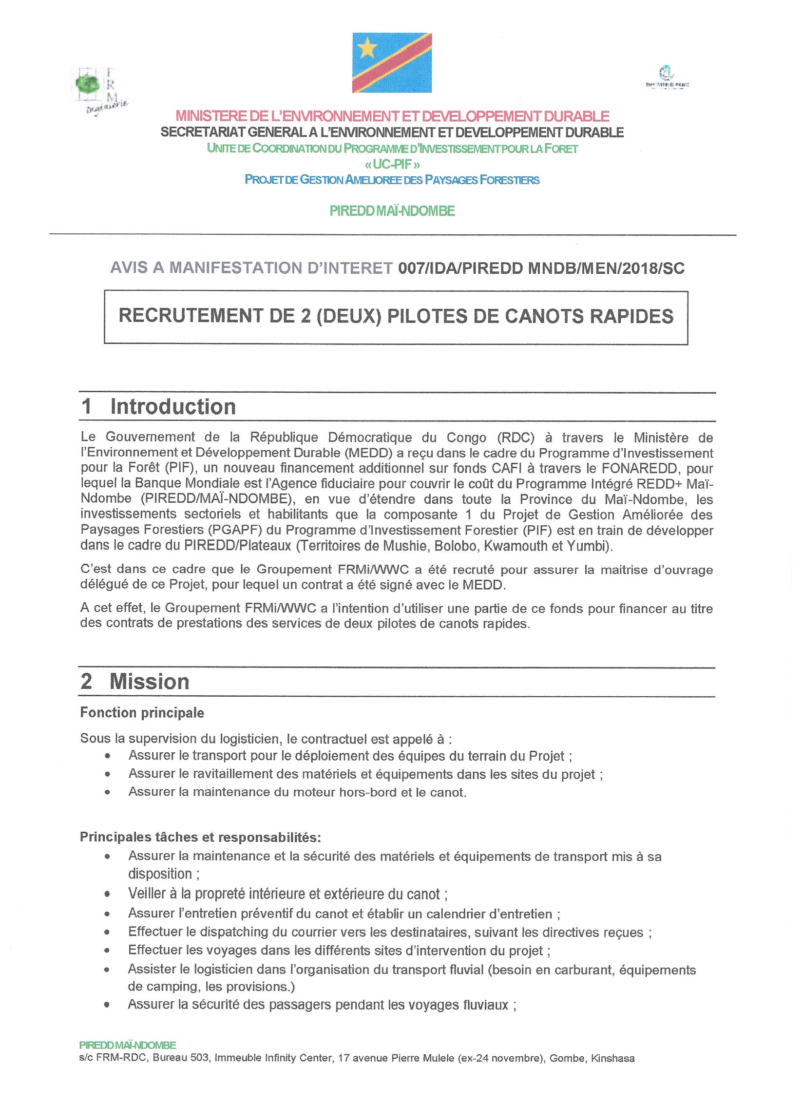 Recrutement de deux (2) Pilotes de Canots Rapides