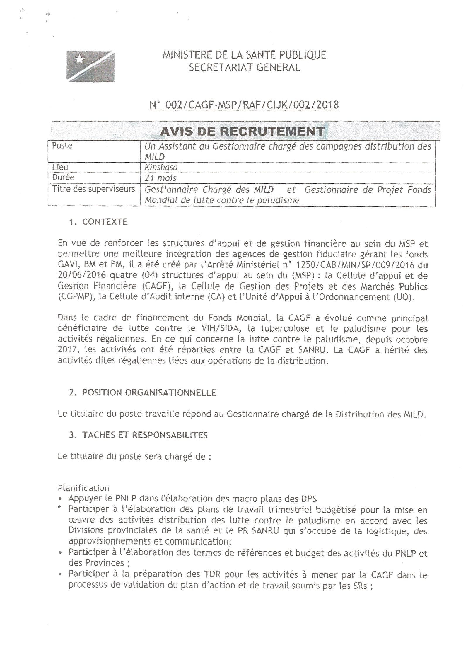 Recrutement d’un Assistant au Gestionnaire chargé des campagnes distribution des MILD.