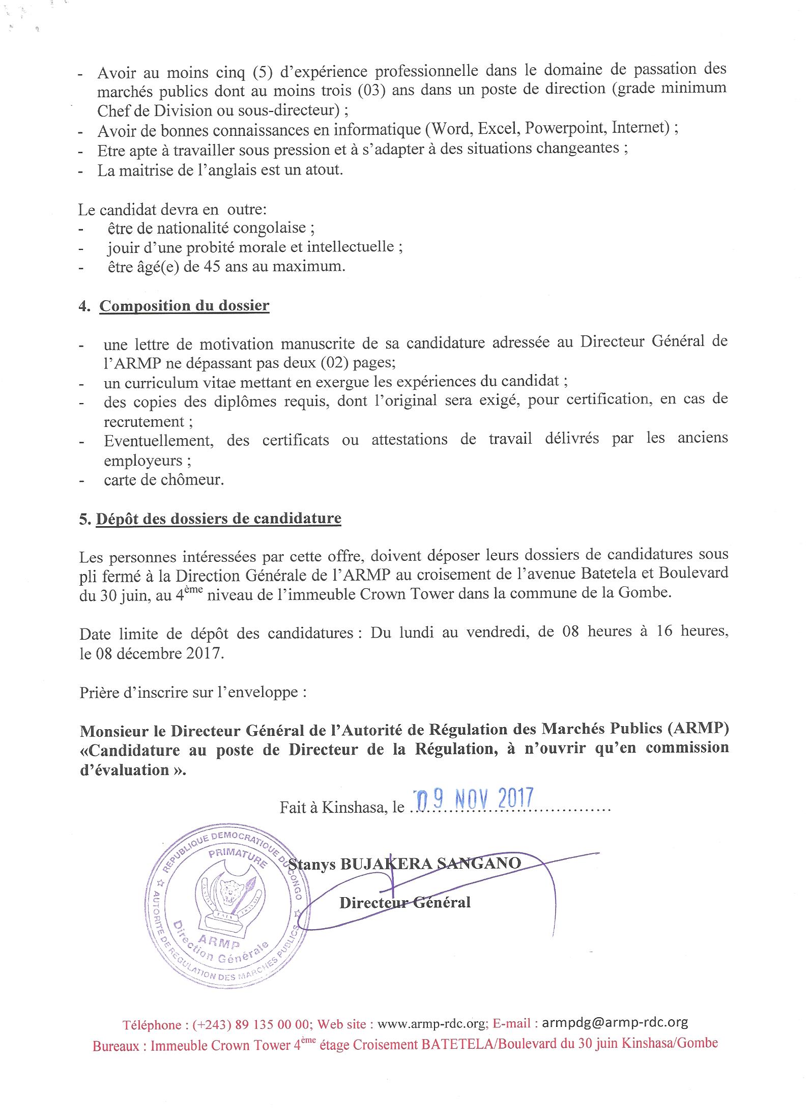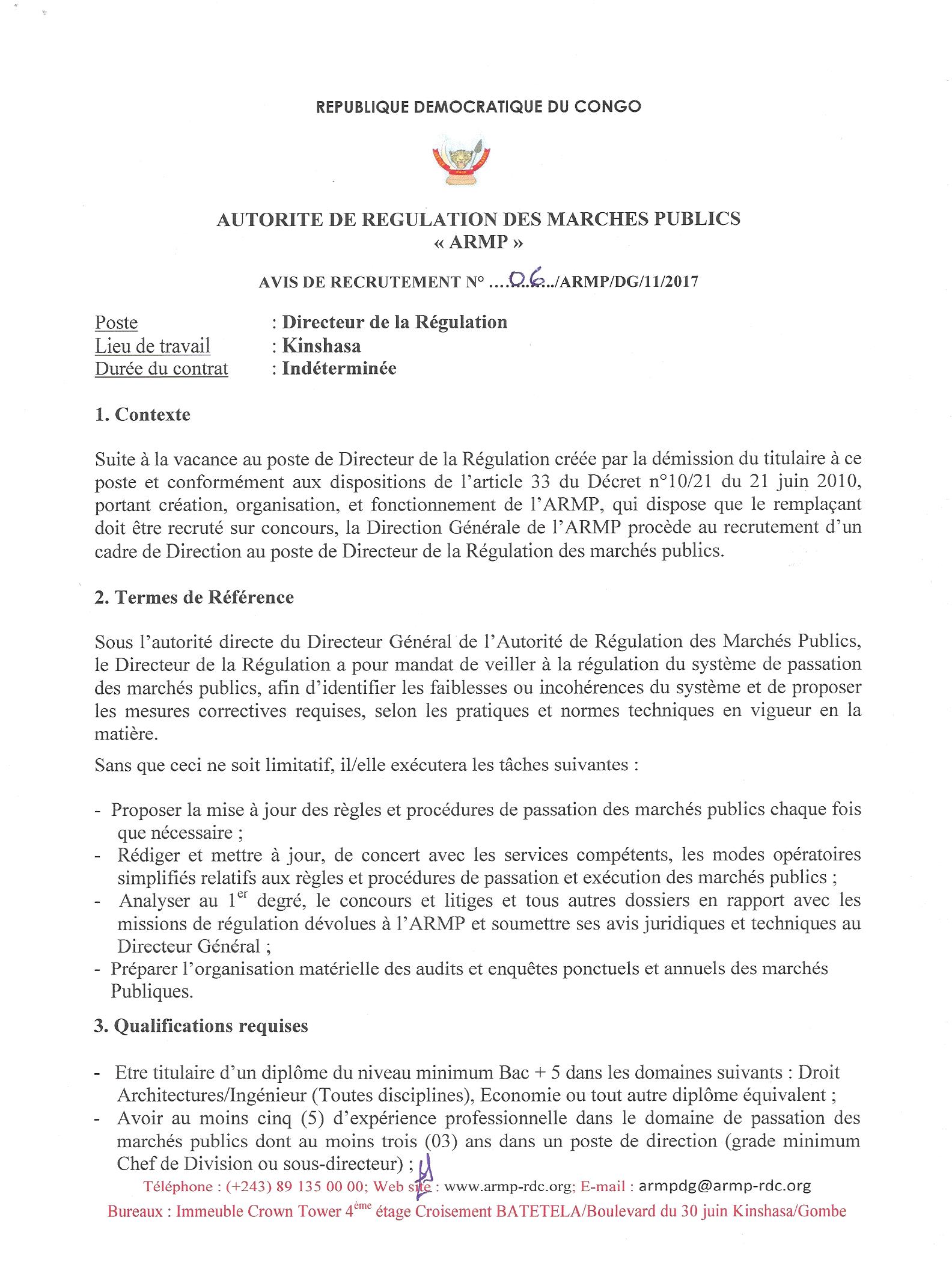 RECRUTEMENT D’UN CADRE DE DIRECTION AU POSTE DE DIRECTEUR DE LA RÉGULATION DES MARCHÉS PUBLICS