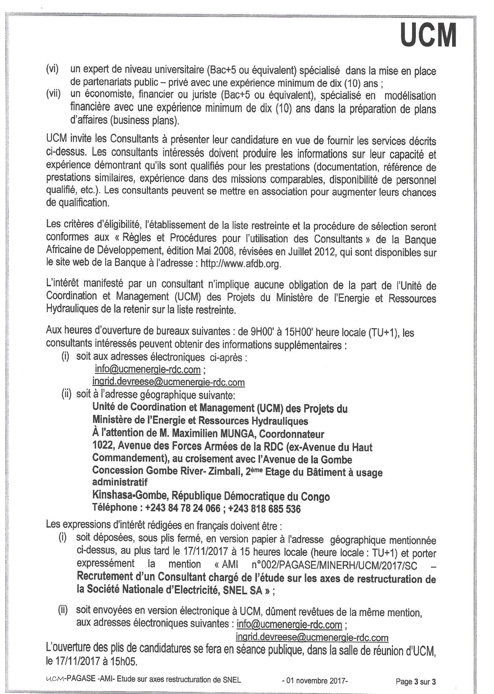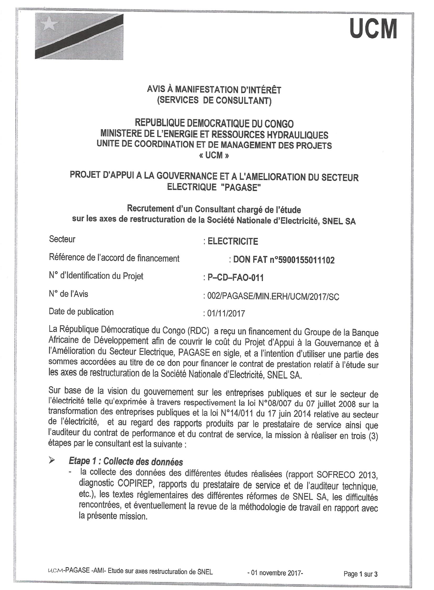 RECRUTEMENT D’UN CONSULTANT CHARGÉ DE L’ÉTUDE SUR LES AXES DE RESTRUCTURATION DE LA SOCIÉTÉ NATIONALE D’ELECTRICITÉ, SNEL SA.