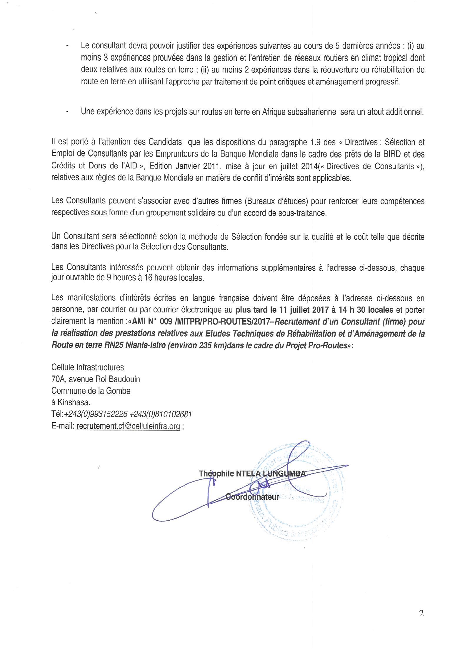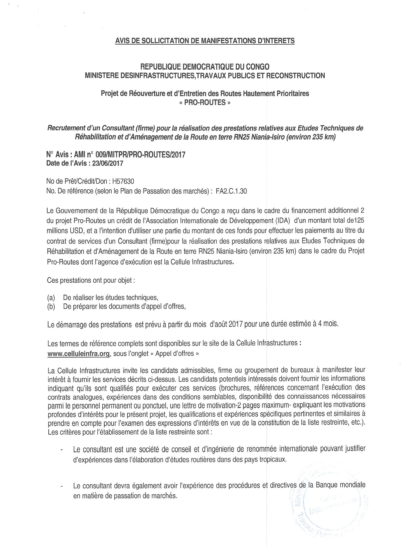 Recrutement d’un Consultant (Firme) pour la réalisation des prestations relatives aux Etudes Techniques de Réhabilitation et d’Aménagement de la Route en terre RN25 Niania-Isiro (environ 235 km).