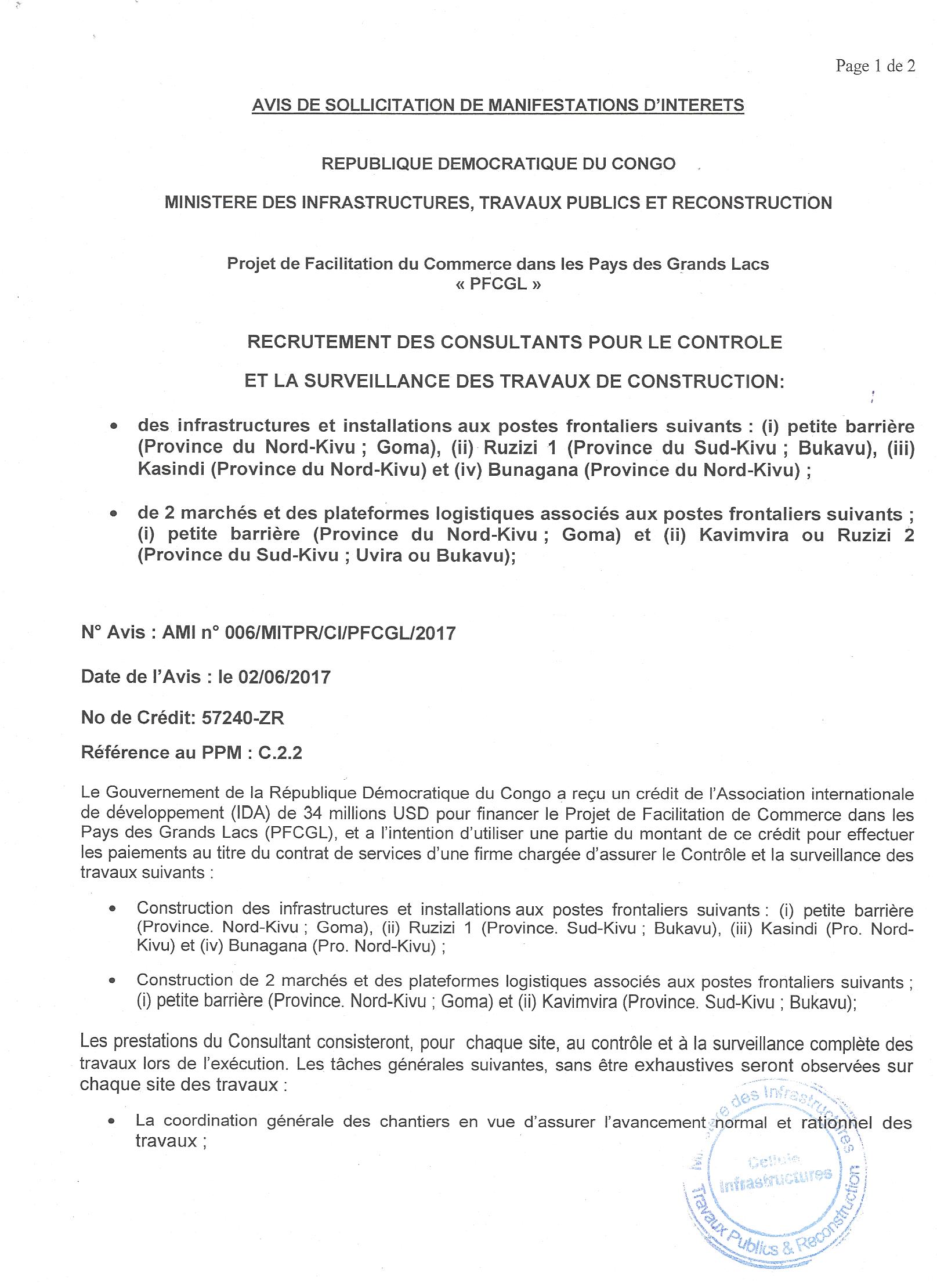 Recrutement d’un Consultant Individuel chargé de l’élaboration d’un Plan d’Actions de Réinstallation (PAR) pour les travaux d’AEP de la ville de Matadi. Recrutement d’un Consultant Individuel chargé de l’élaboration d’un Plan d’Actions de Réinstallation (PAR) pour les travaux d’AEP de la ville de Kinshasa.