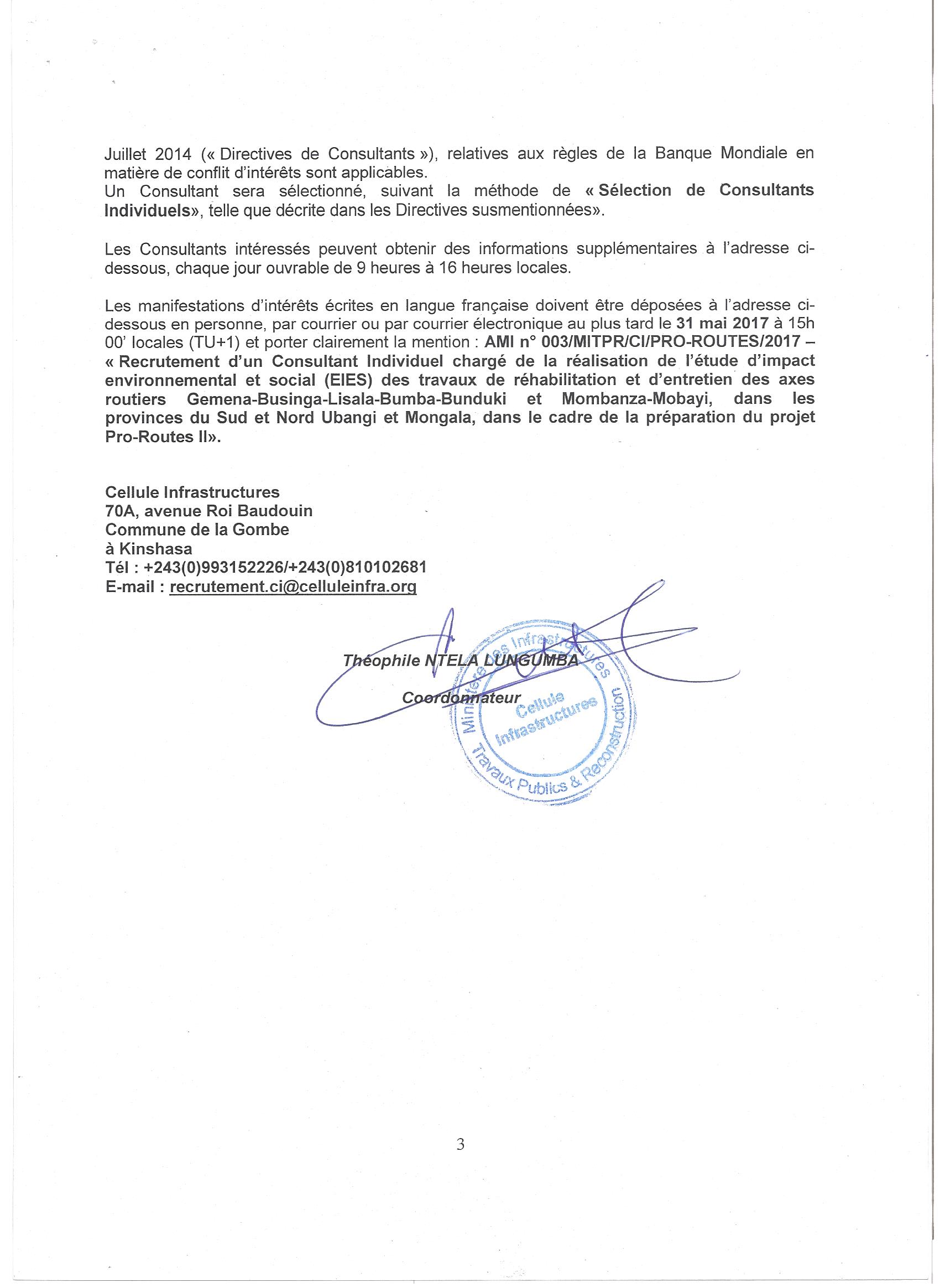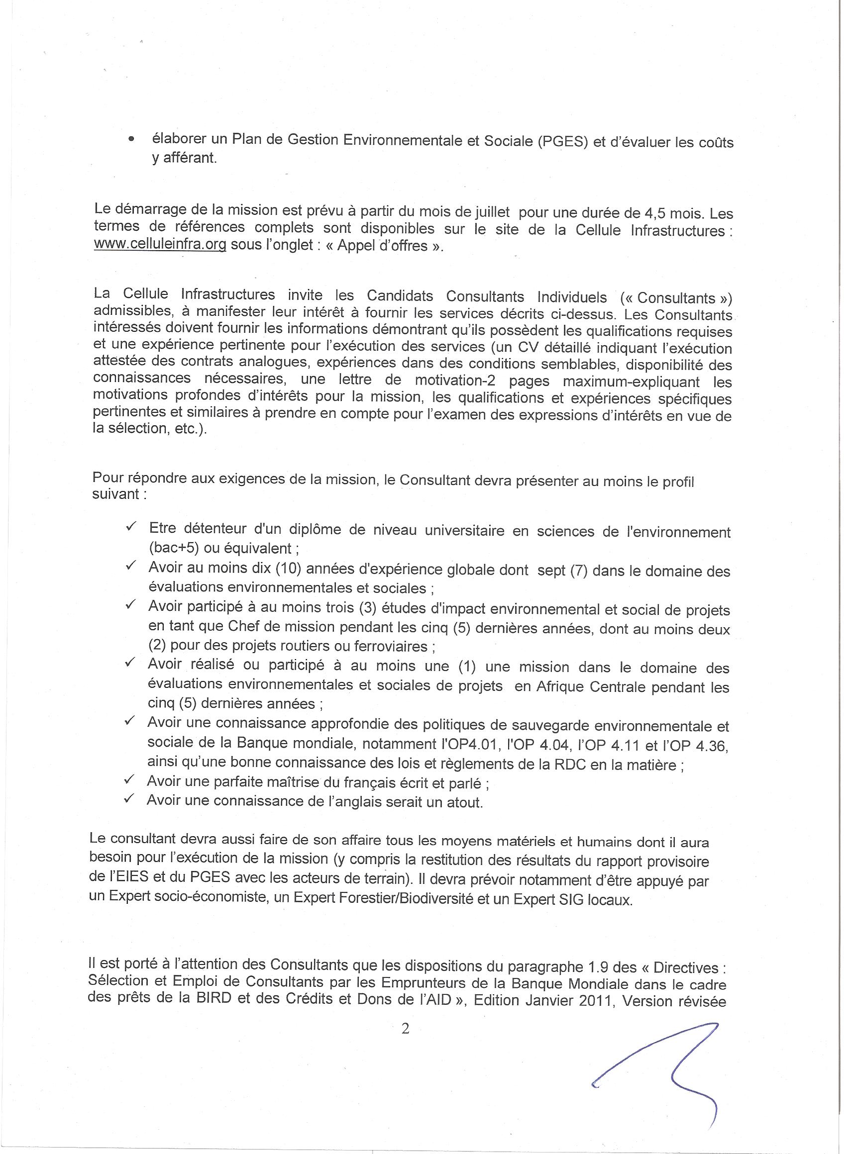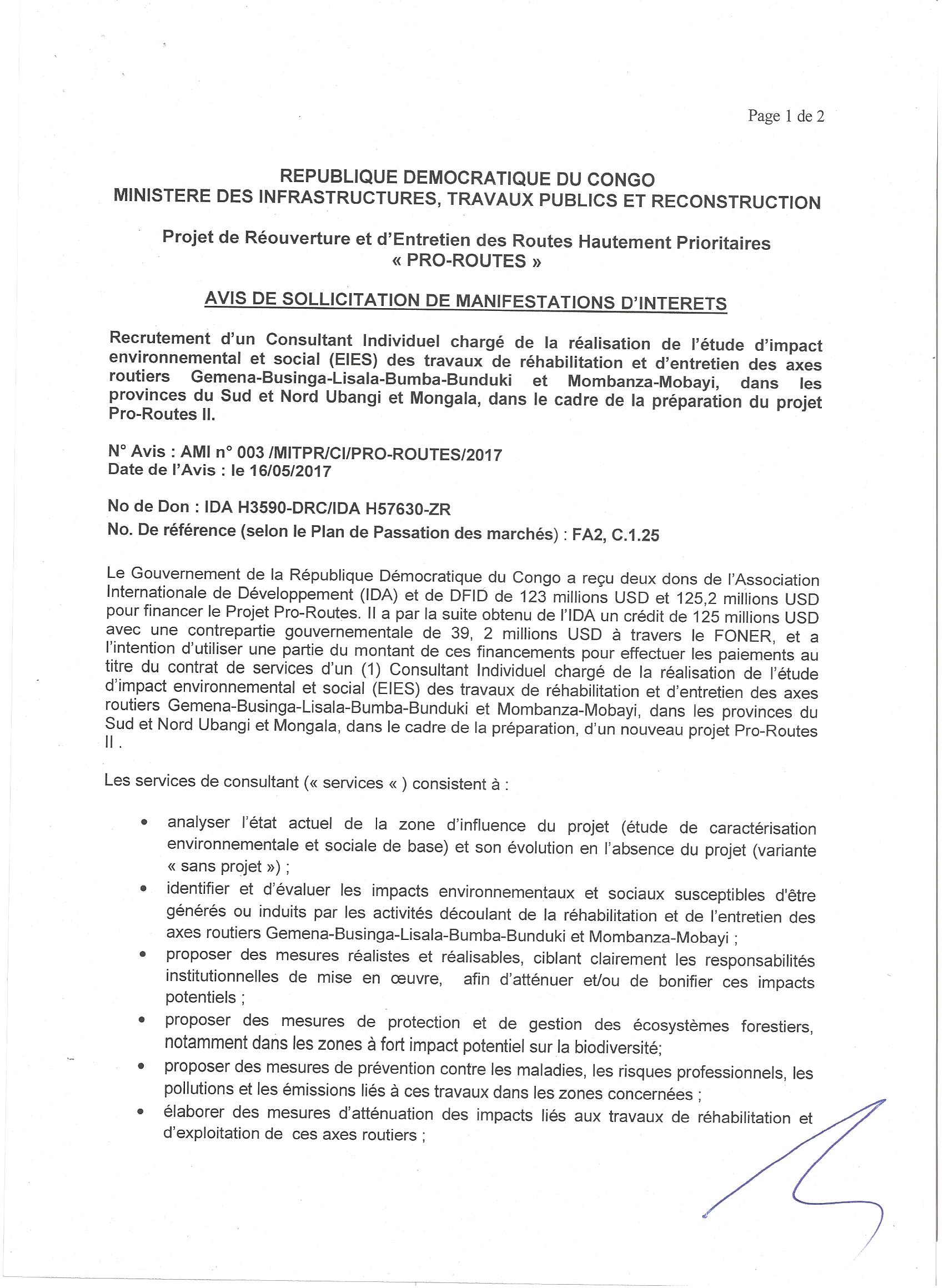 Recrutement d’un Consultant individuel chargé de la réalisation de l’étude d’impact environnemental et social des travaux de réhabilitation et d’entretien des axes routiers Gemena-Businga-Lisala-Bumba-Bunduki et Mobanza-Mobayi dans la province du Sud et…