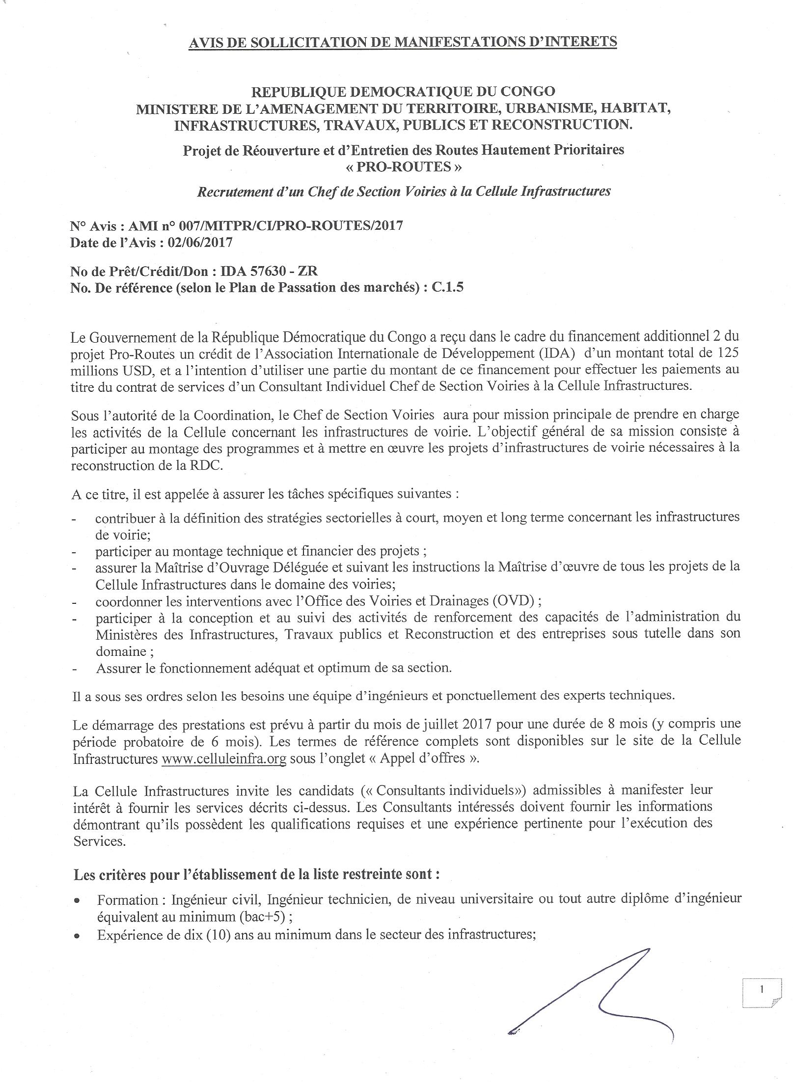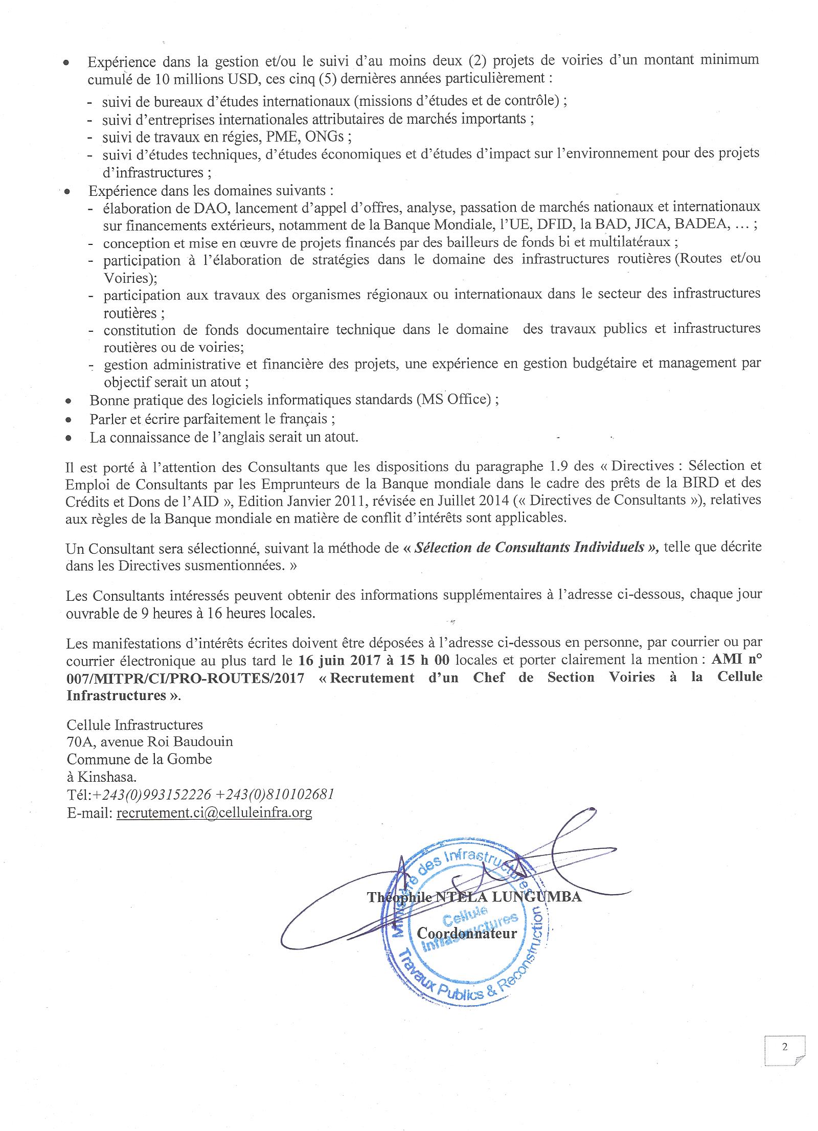 RECRUTEMENT D’UN CHEF DE SECTION VOIRIES À LA CELLULE INFRASTRUCTURES.