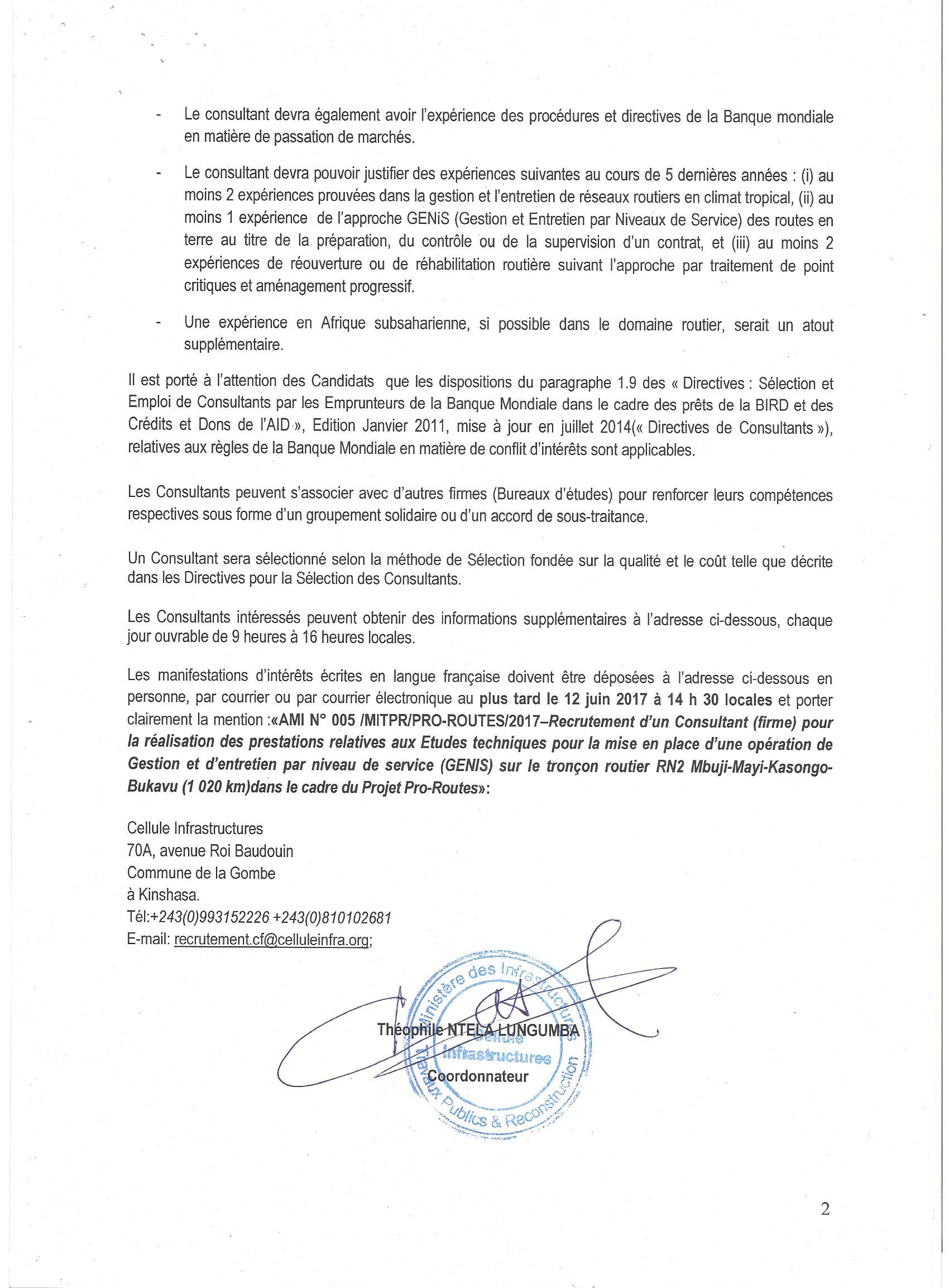 recrutement d’un Consultant pour la réhabilitation des prestations relatives aux Etudes techniques pour la mise en place d’une opération de Gestion et d’entretien par niveau de service (GENIS) sur le troçon routier RN2 Mbuji Mayi-Kasongo-Bukavu (1020 Km))