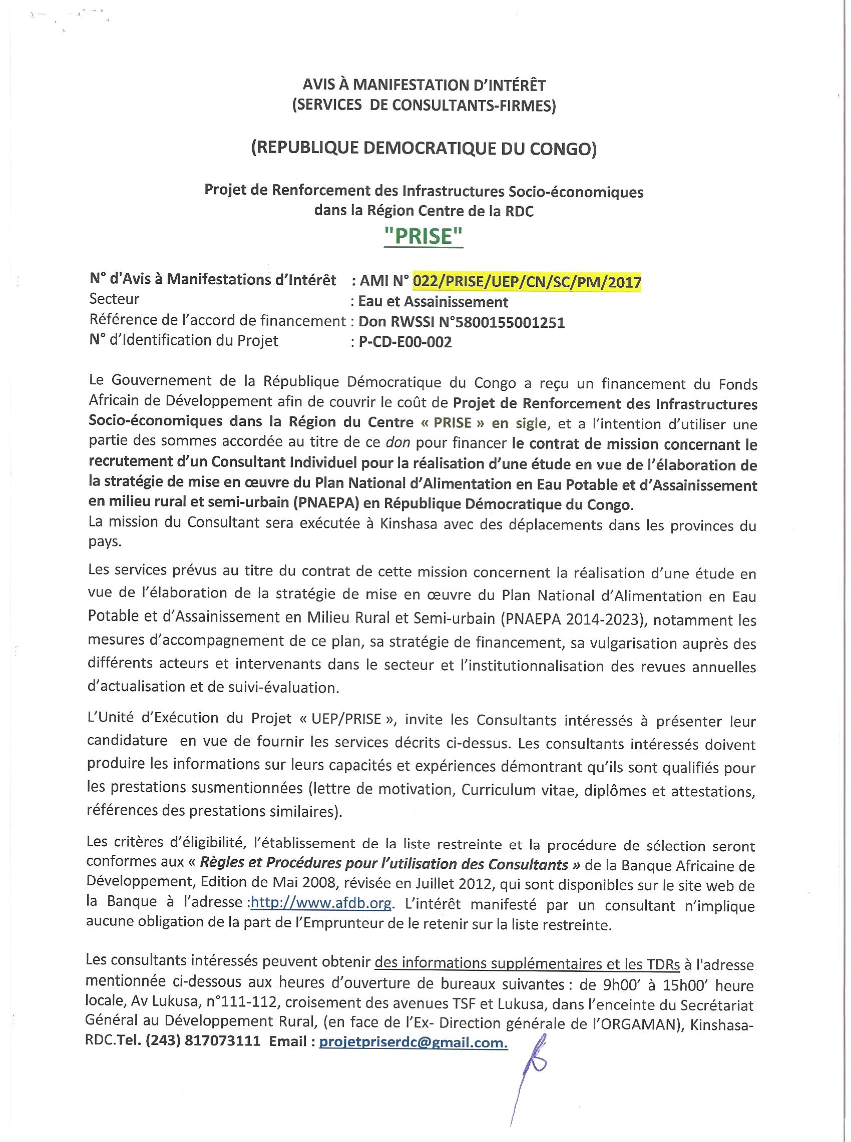 Mission de recrutement d’un Consultant individuel en vue de la réalisation d’une étude en vue de l’élaboration de la stratégie de mise en œuvre du Plan National d’Alimentation en Eau Potable et d’Assainissement en milieu rural et semi urbain (PNAEPA) en…