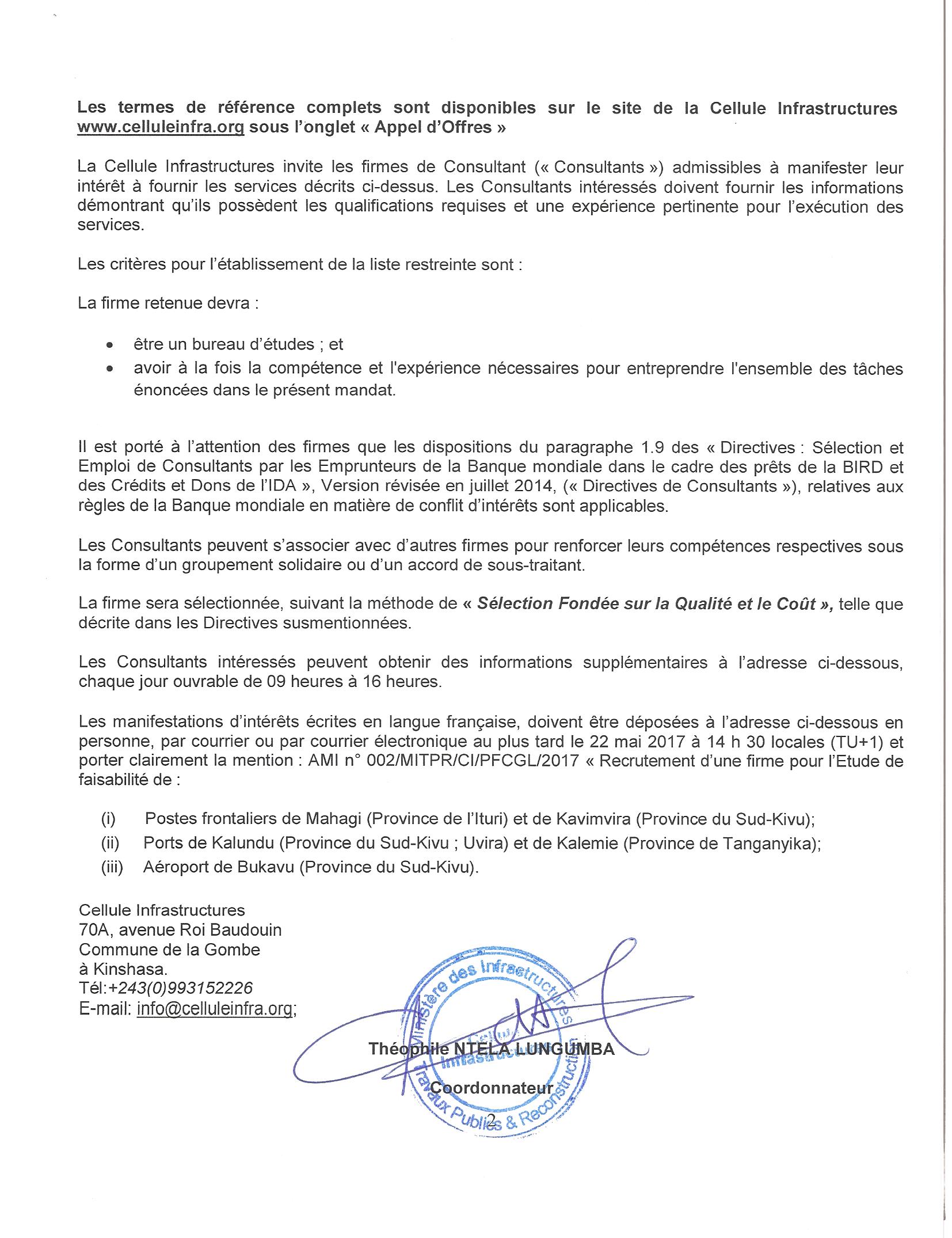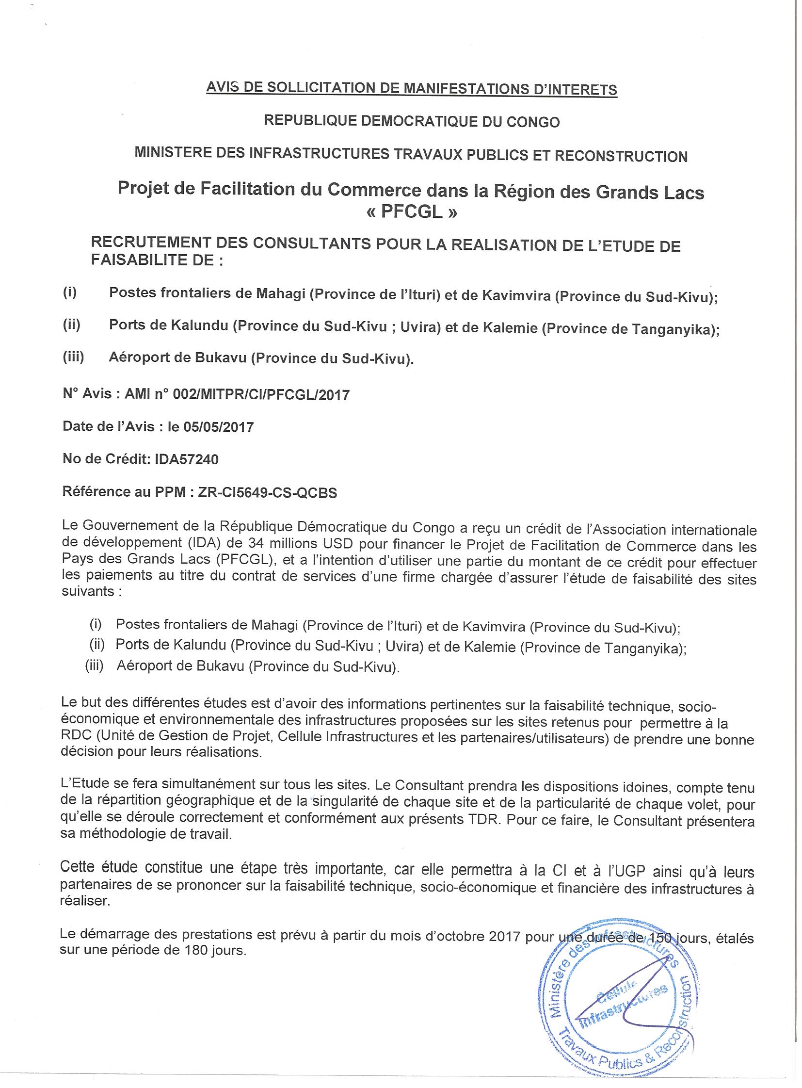Recrutement des Consultants pour la Réalisation de l’Etude de faisabilité de postes frontaliers de Mahagi (Province de l’Ituri) et de Kavimvira (Province du Sud-Kivu) ; Ports de Kalundu (Province du Sud-Kivu ; Uvira) et de Kalemie (Province de Tanganyika.