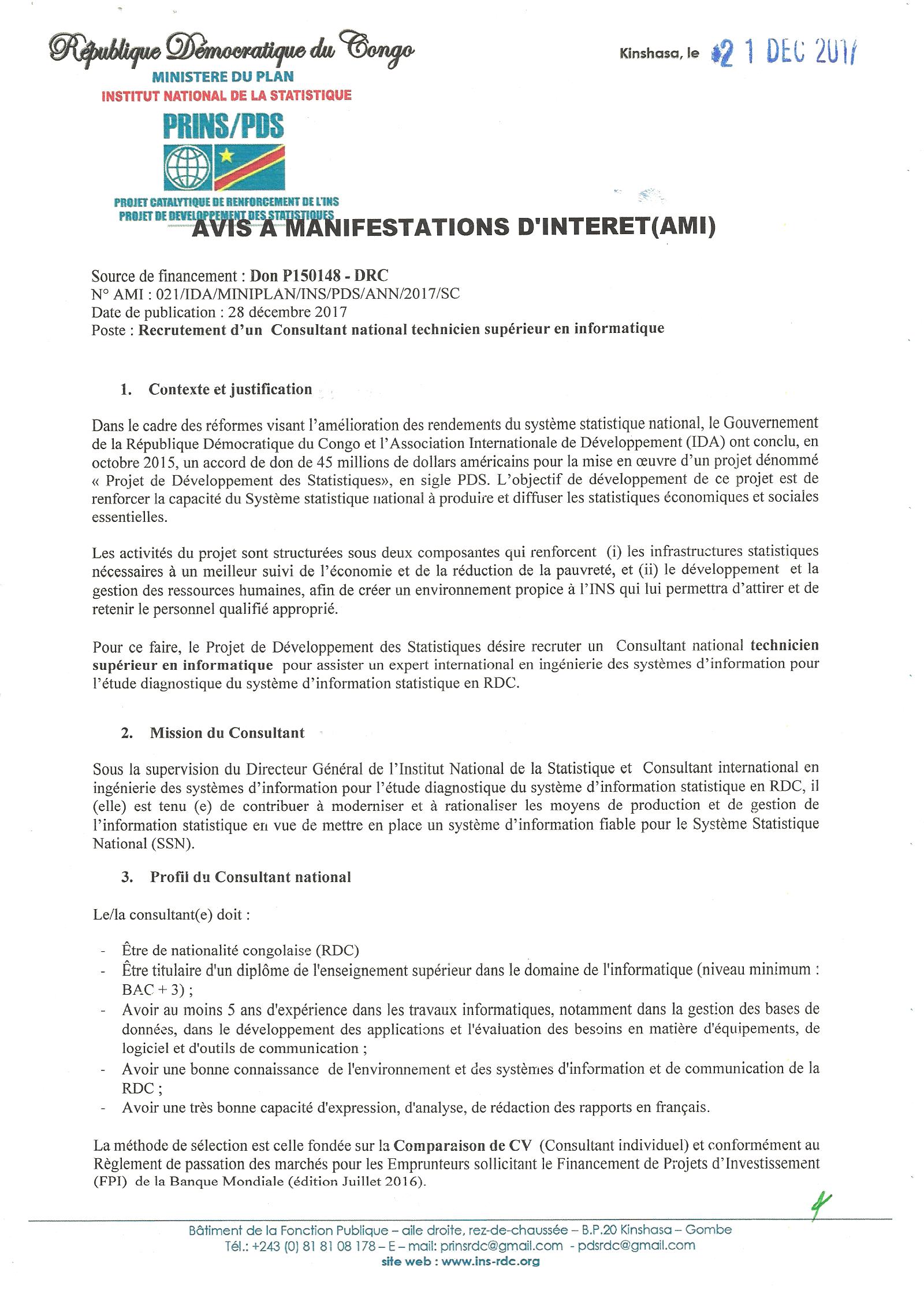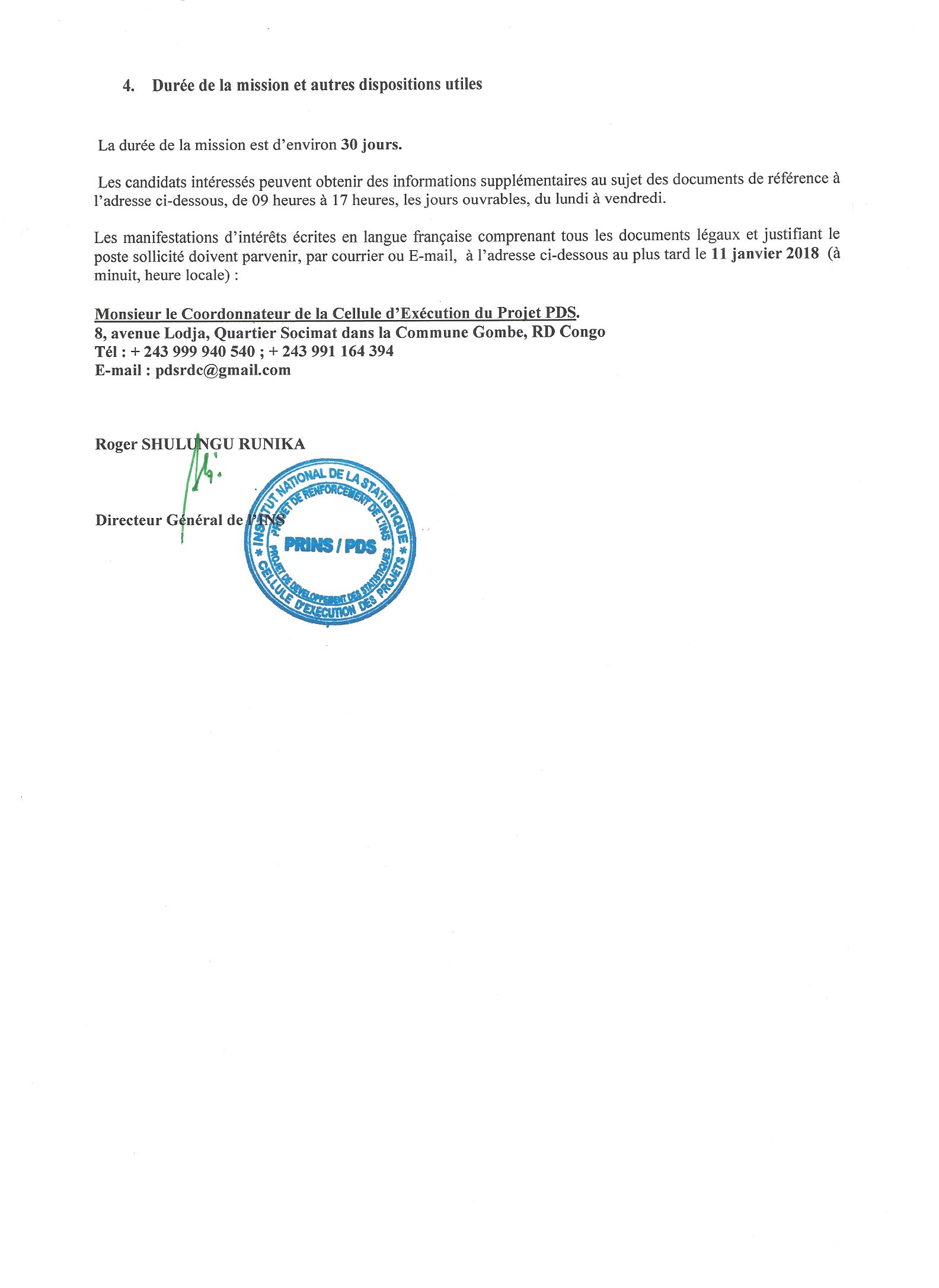 RECRUTEMENT D’UN CONSULTANT CONSEILLER TECHNIQUE PERMANENT AUPRÈS DU DIRECTEUR GÉNÉRAL DE L’INSTITUT NATIONAL DE LA STATISTIQUE POUR LA GESTION DES PROJETS PRINS ET PDS