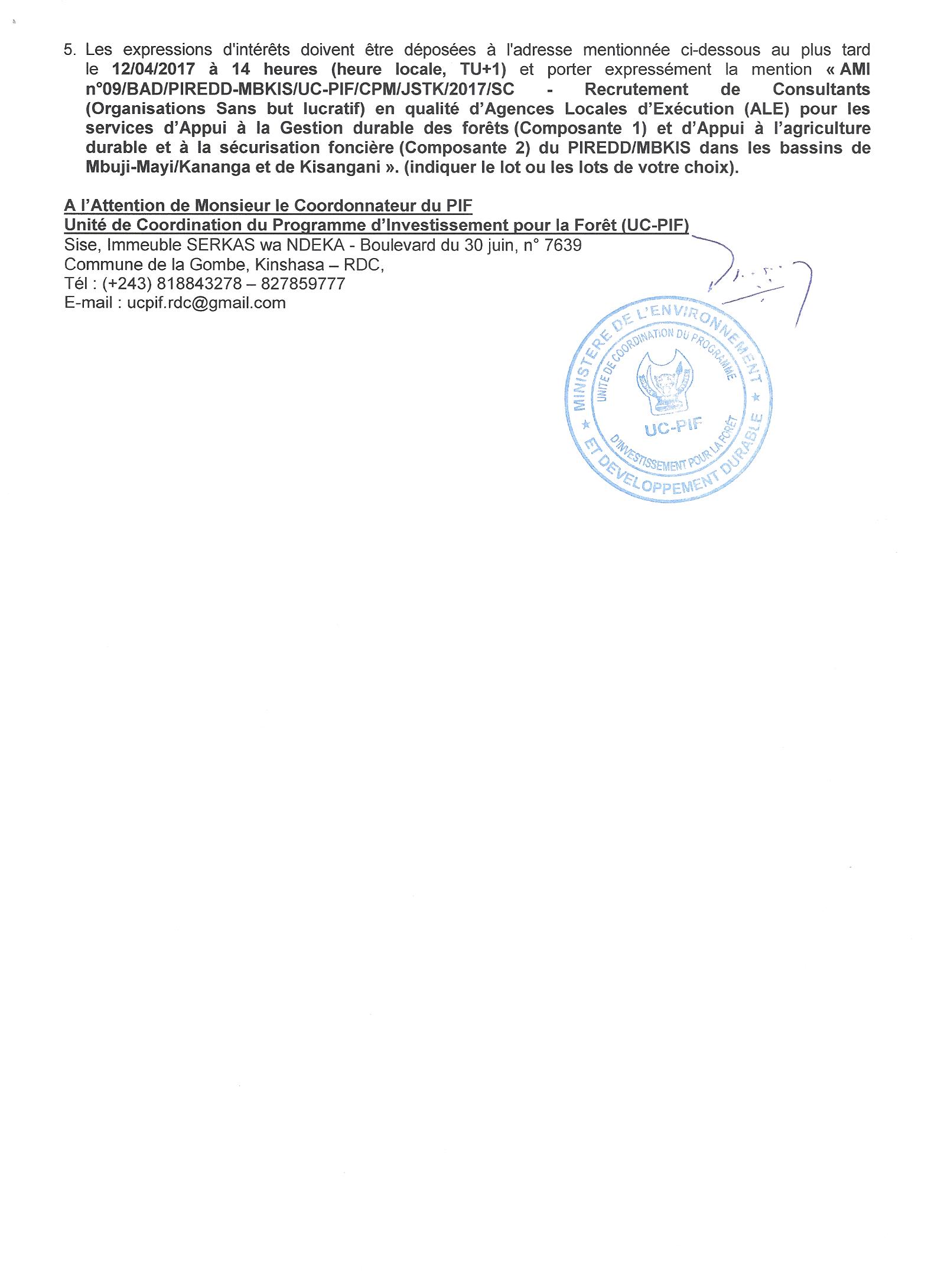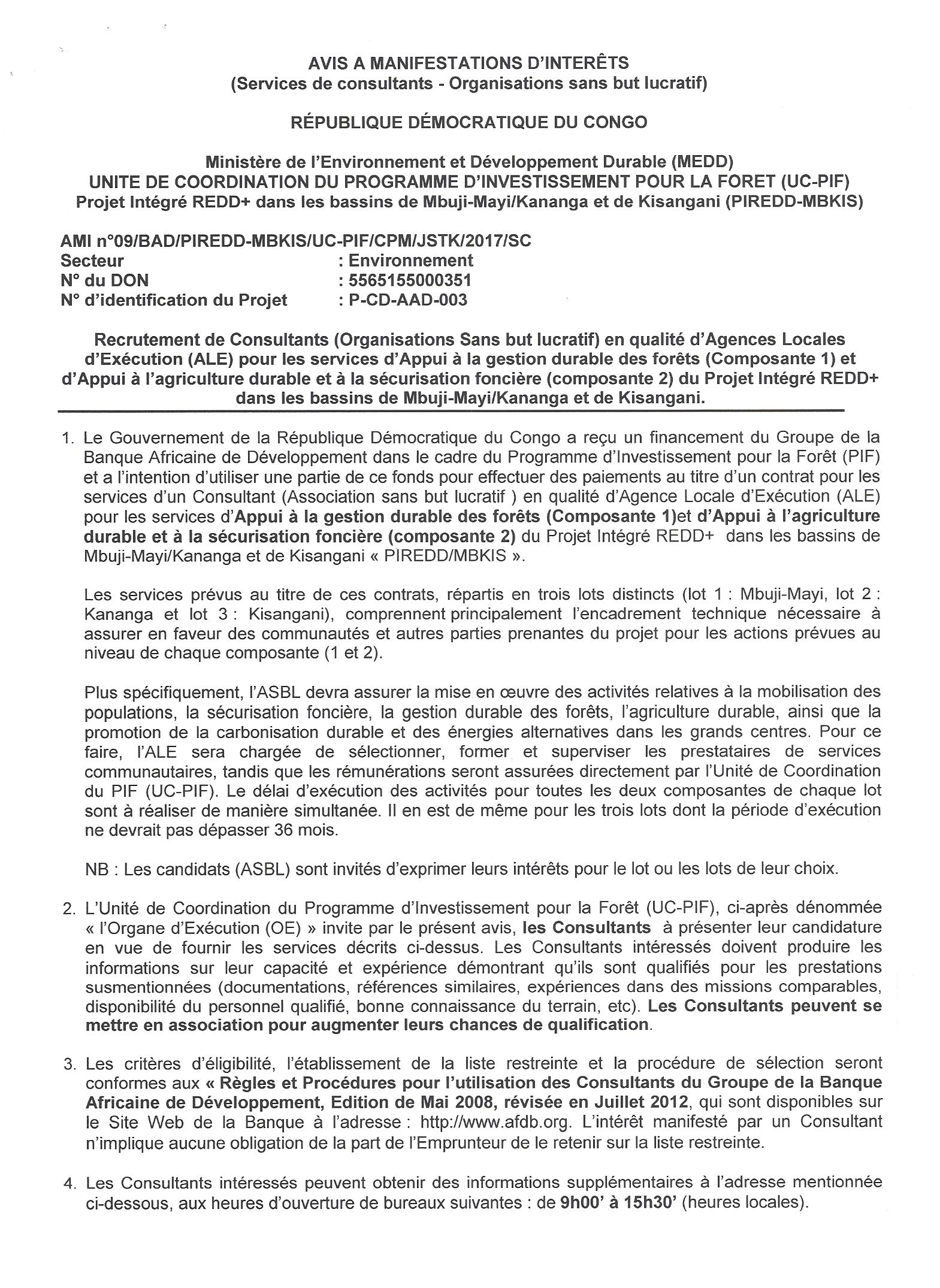 RECRUTEMENT DE CONSULTANTS EN QUALITÉ D’AGENCE LOCALES D’EXÉCUTION POUR LES SERVICES D’APPUI À LA GESTION DURABLE DES FORÊTS ET D’APPUI À L’AGRICULTURE DURABLE ET À LA SÉCURISATION FONCIÈRE DU PROJET INTÉGRÉ REDD+ DANS LES BASSINS DE MBUJI-MAYI/KANANGA ET DE KISANGANI (PIREDD-MBKIS)