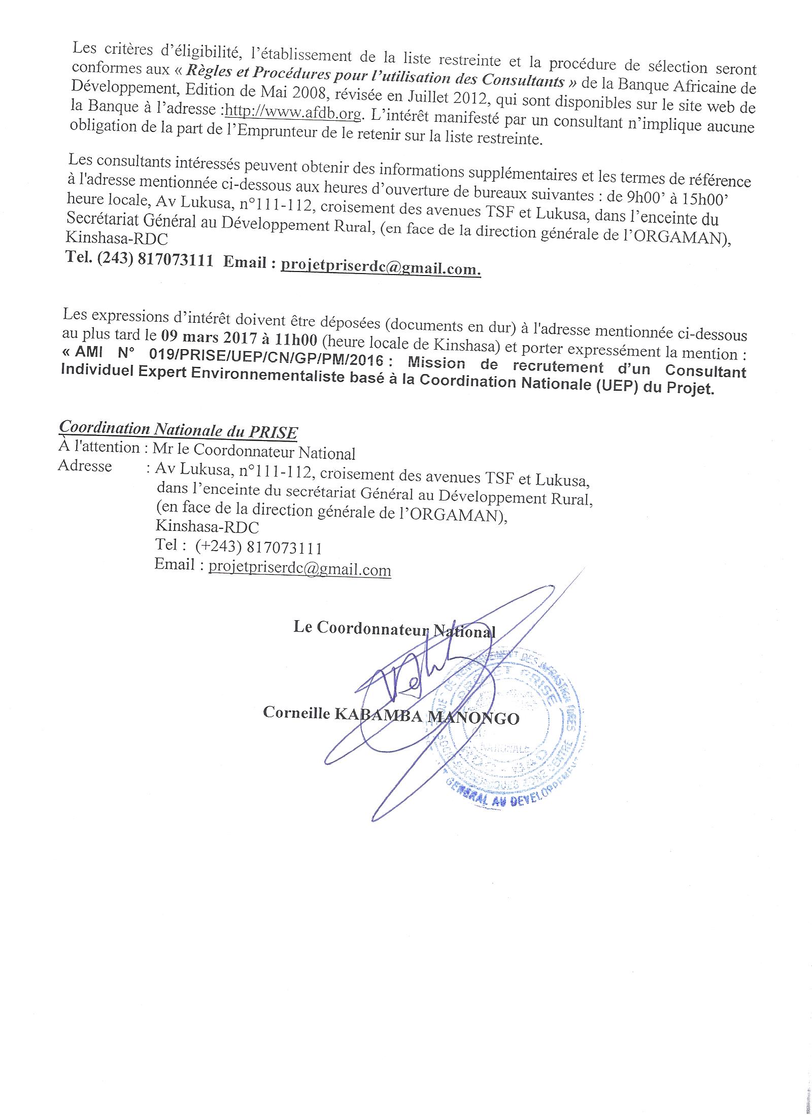 SERVICES DU CONSULTANT INDIVIDUEL EXPERT ENVIRONNEMENTALISTE BASÉ À LA COORDINATION NATIONALE DU PROJET POUR 12 MOIS DES PRESTATIONS AVEC DES MISSIONS DE TERRAIN POUR LE SUIVI DE LA MISE EN ŒUVRE DU PLAN DE GESTION ENVIRONNEMENTALE ET SOCIALE.