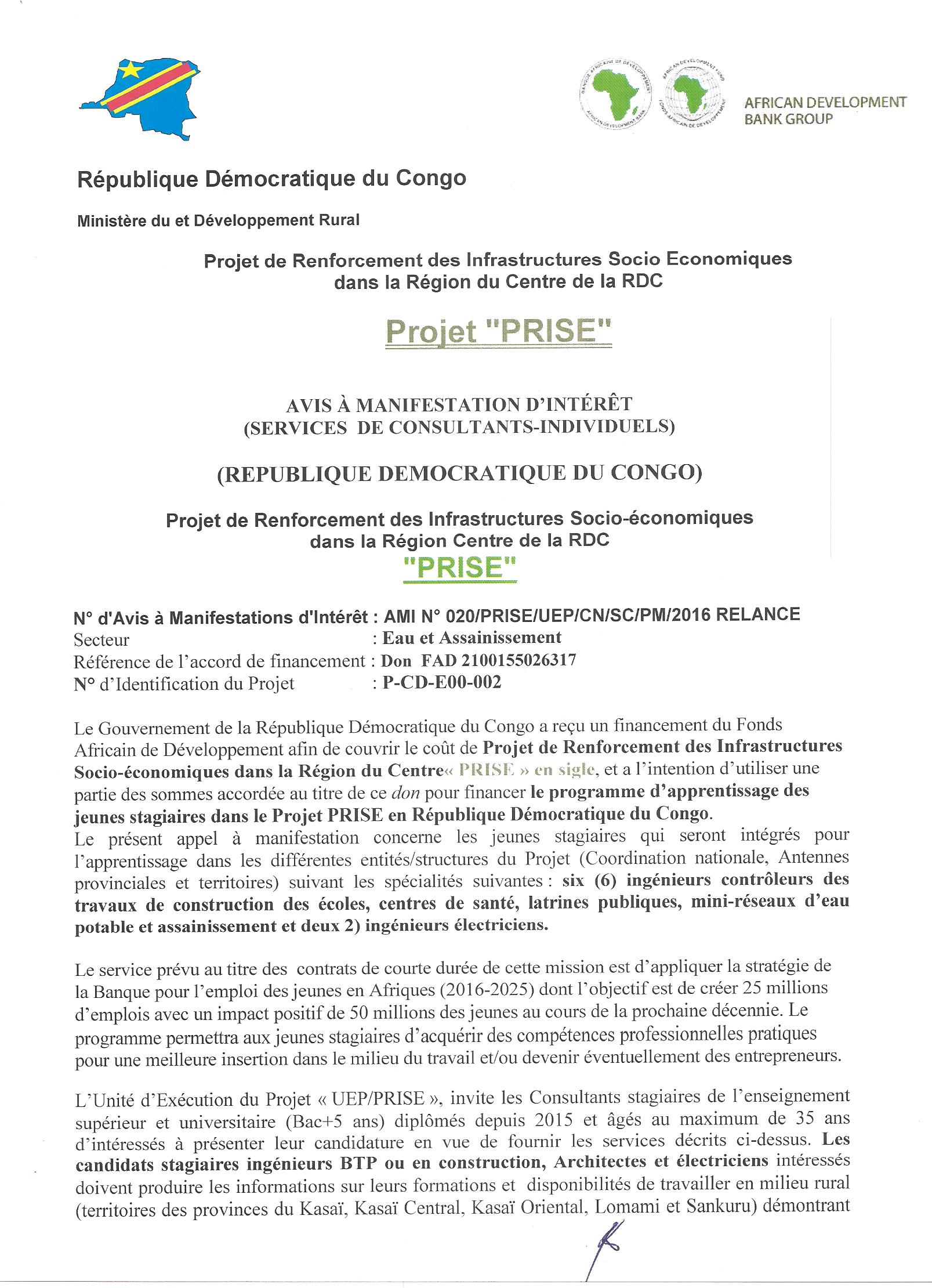 SERVICES DE CONSULTANTS-INDIVIDUELS POUR LE PROJET DES RENFORCEMENT DES INFRASTRUCTURES SOCIO-ÉCONOMIQUES DANS LA RÉGION DU CENTRE.