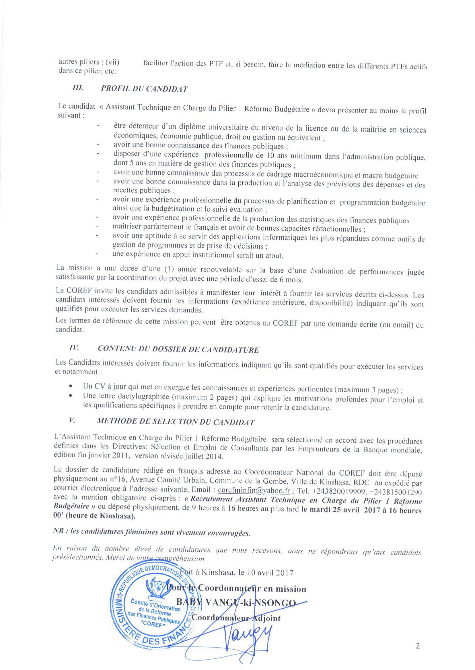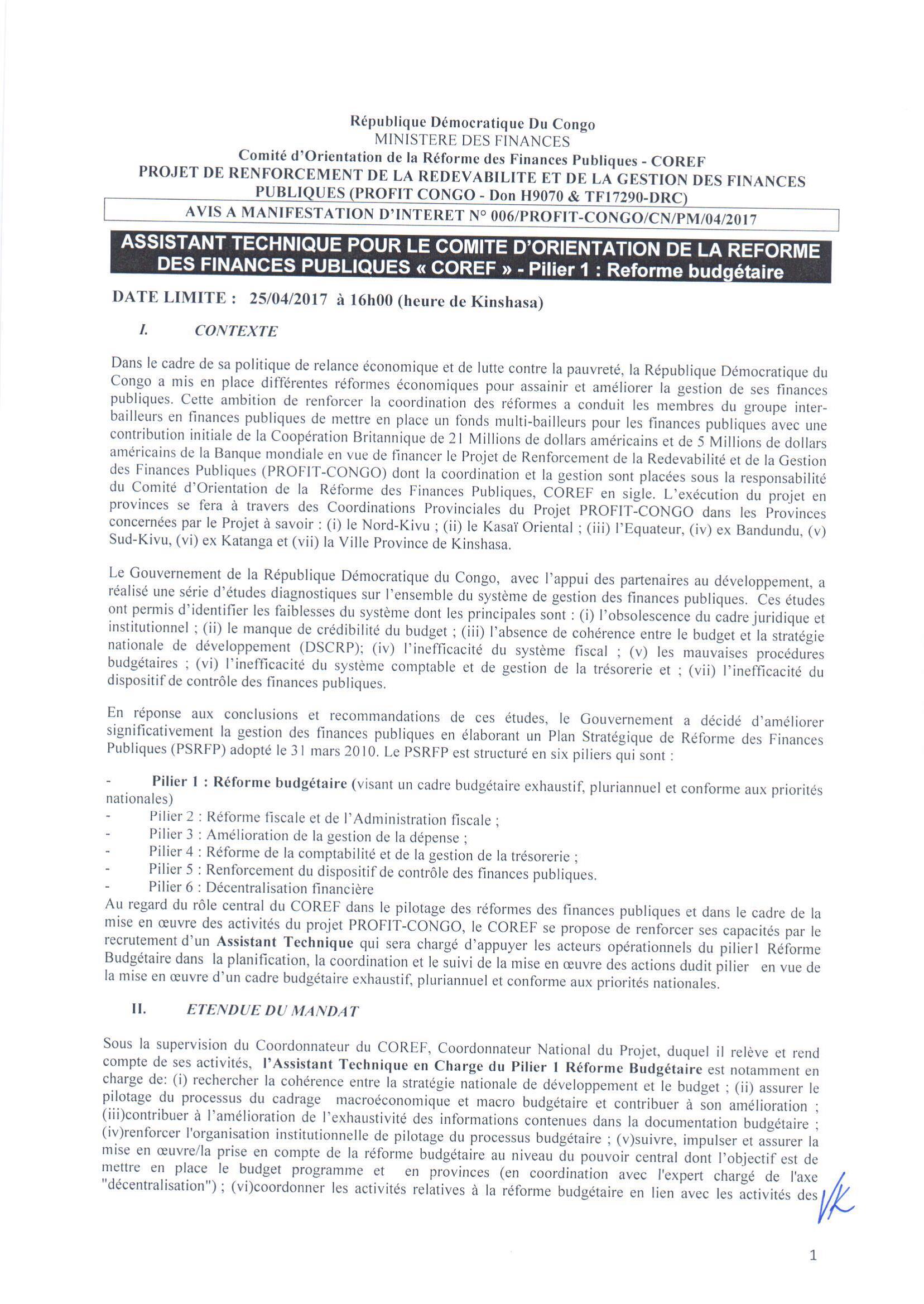 RECRUTEMENT D’UN ASSISTANT TECHNIQUE POUR LE COMITÉ D’ORIENTATION DE LA REFORME DES FINANCES PUBLIQUES « COREF ».