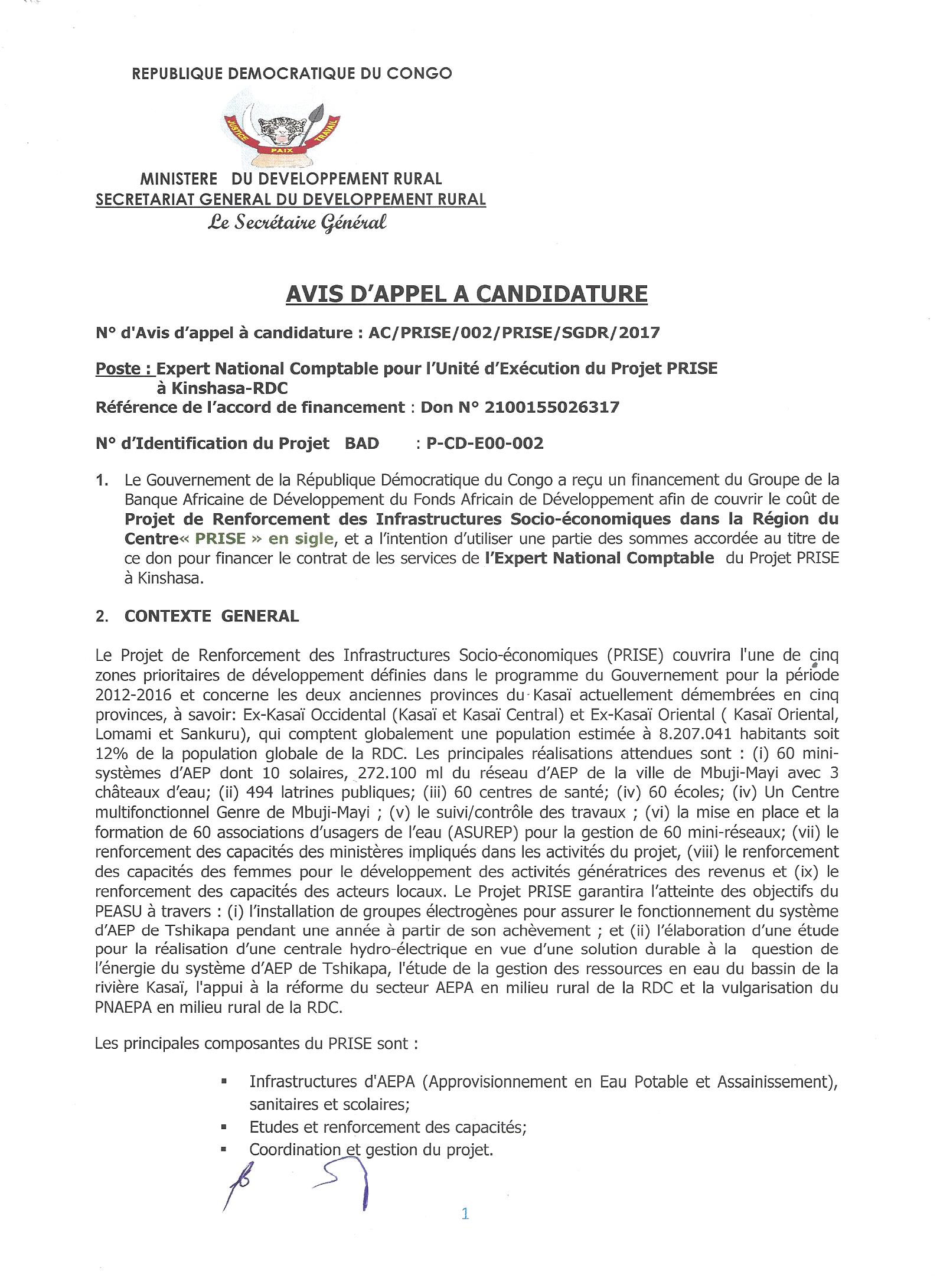 Expert National Comptable pour l’Unité d’Exécution du Projet PRISE à Kinshasa-RDC.