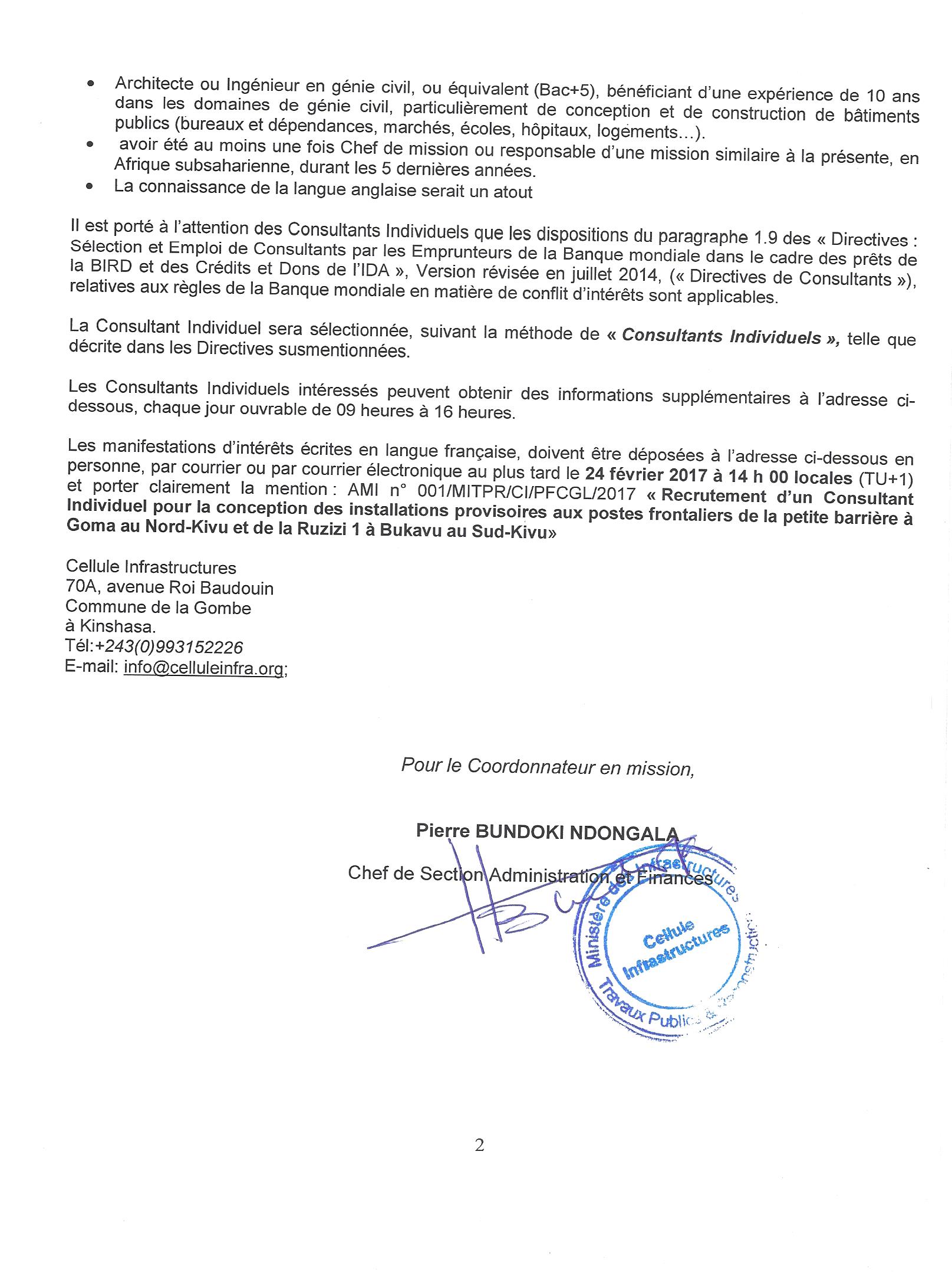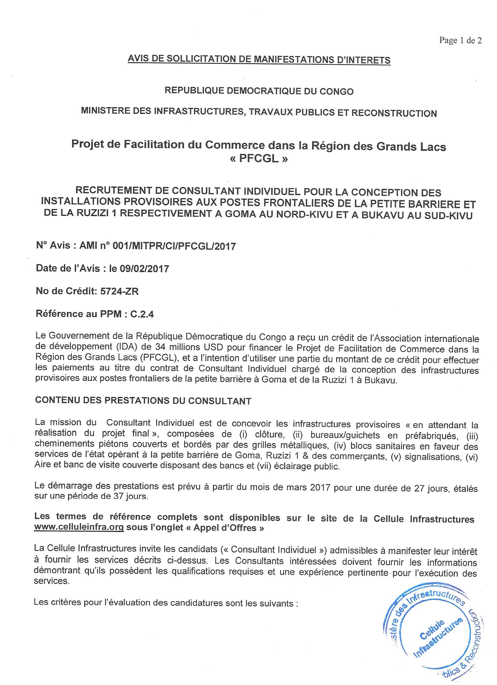 Recrutement de Consultant Individuel pour la Conception des Installation Provisoire aux Postes Frontaliers de la Petite Barriere et de la RUZIZI 1 Respectivement à Goma au Nord-Kivu et Bukavu au Sud-Kivu.