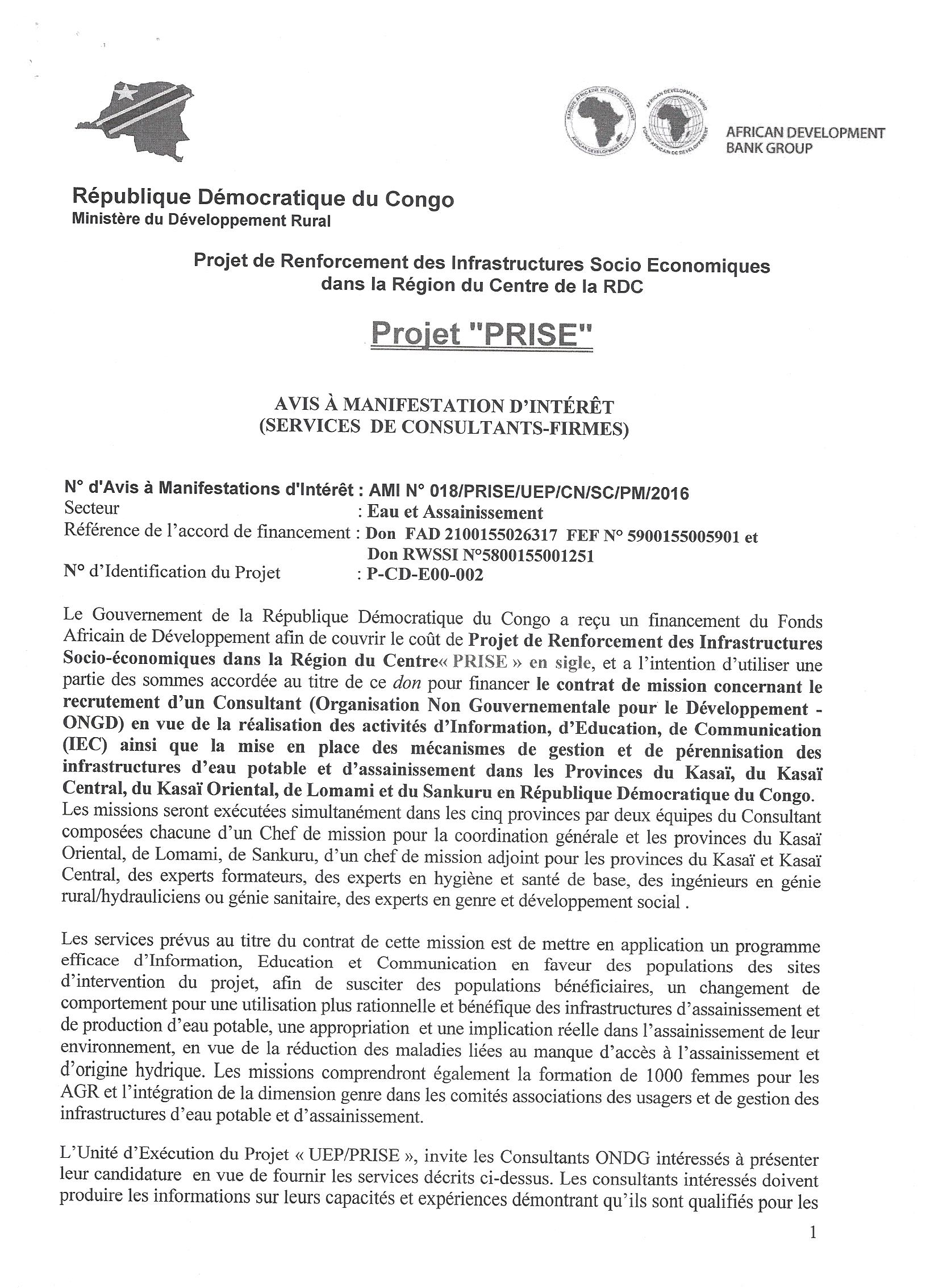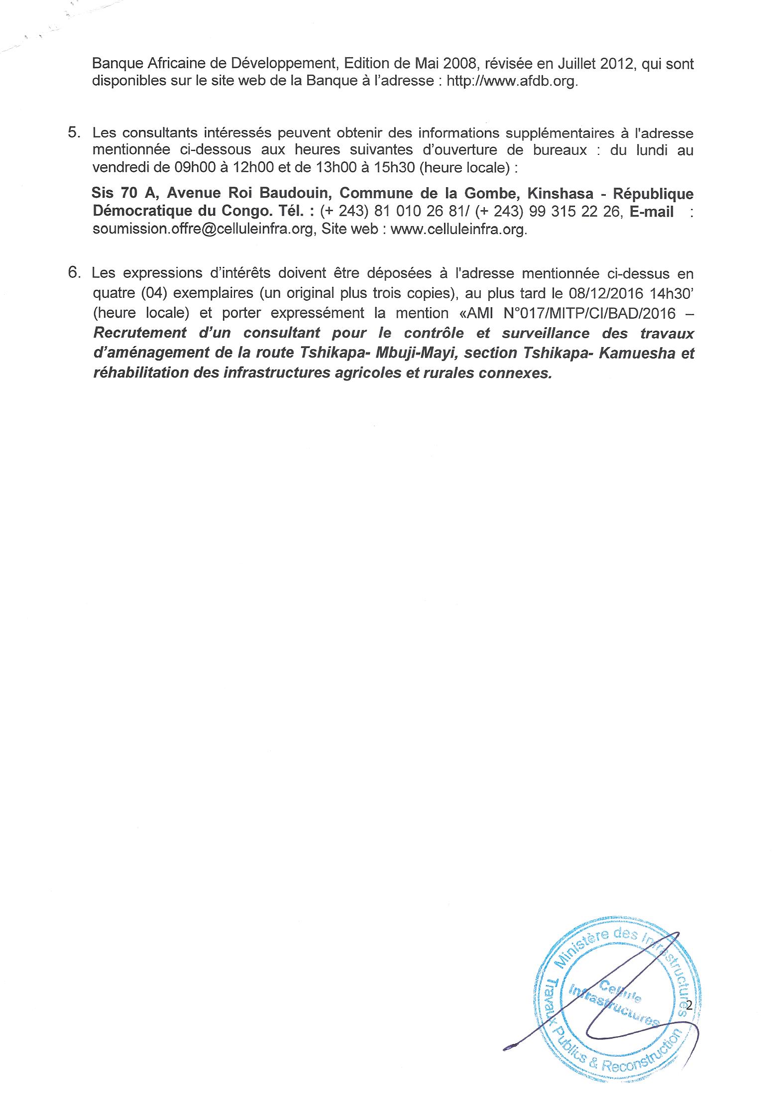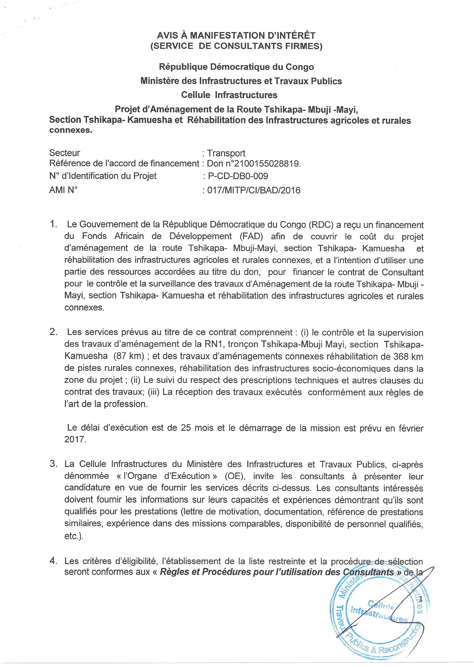 Service de Consultants Firmes pour le projet d’Aménagement de la Route Tshikapa-Mbuji-Mayi, Section Tshikapa-Kamuesha et Réhabilitation des Infrastructures agricoles et rurales connexes.