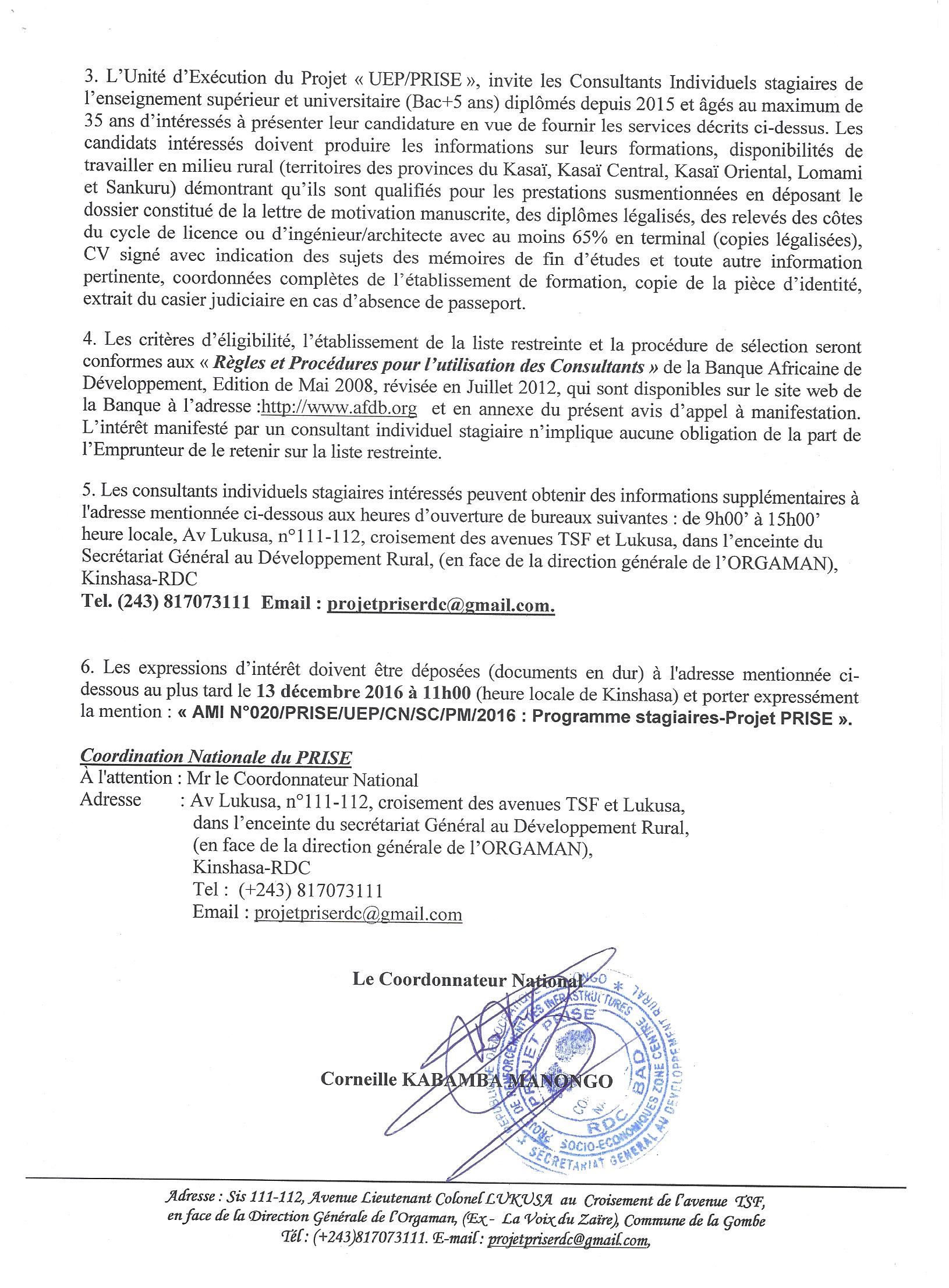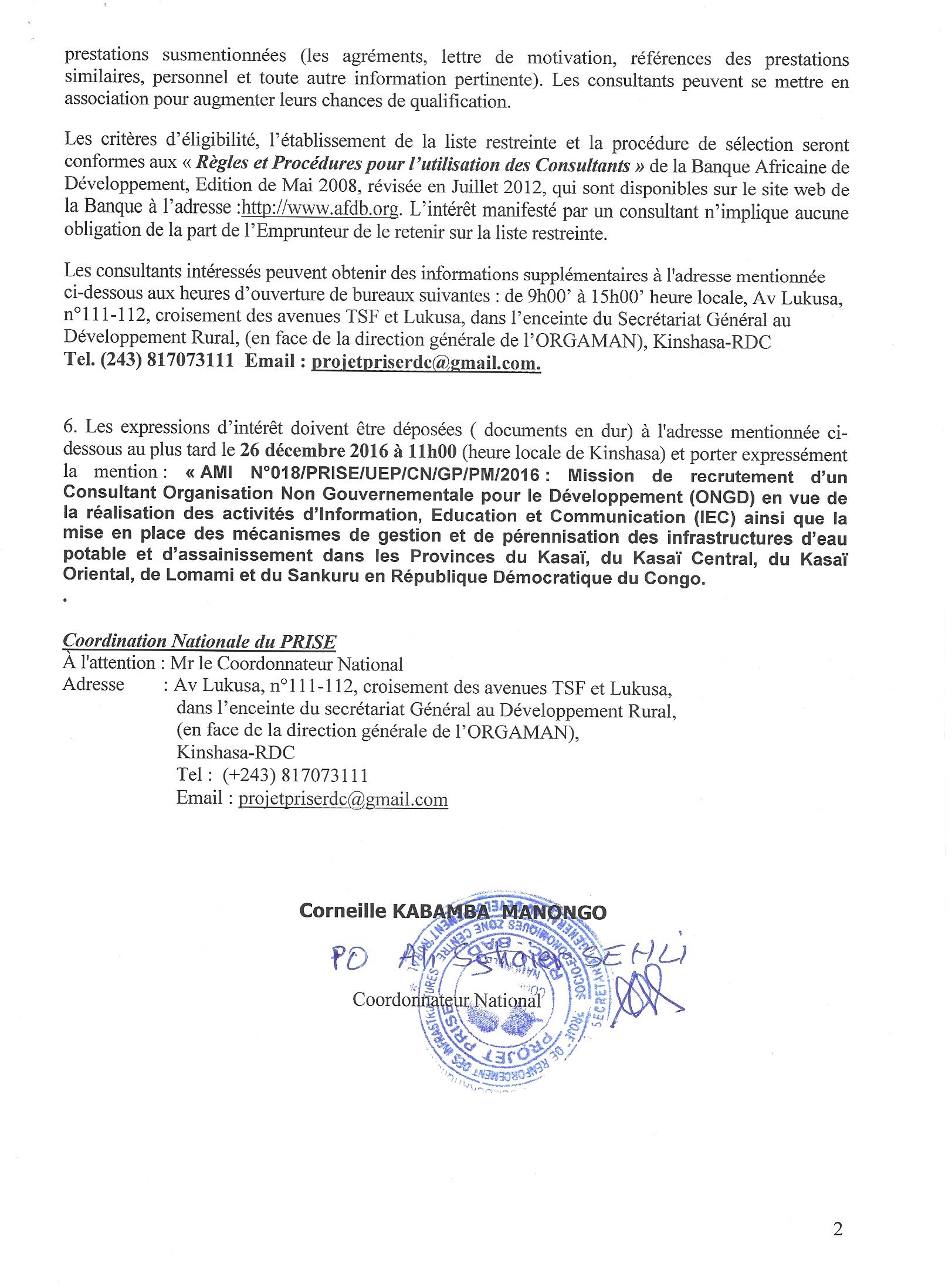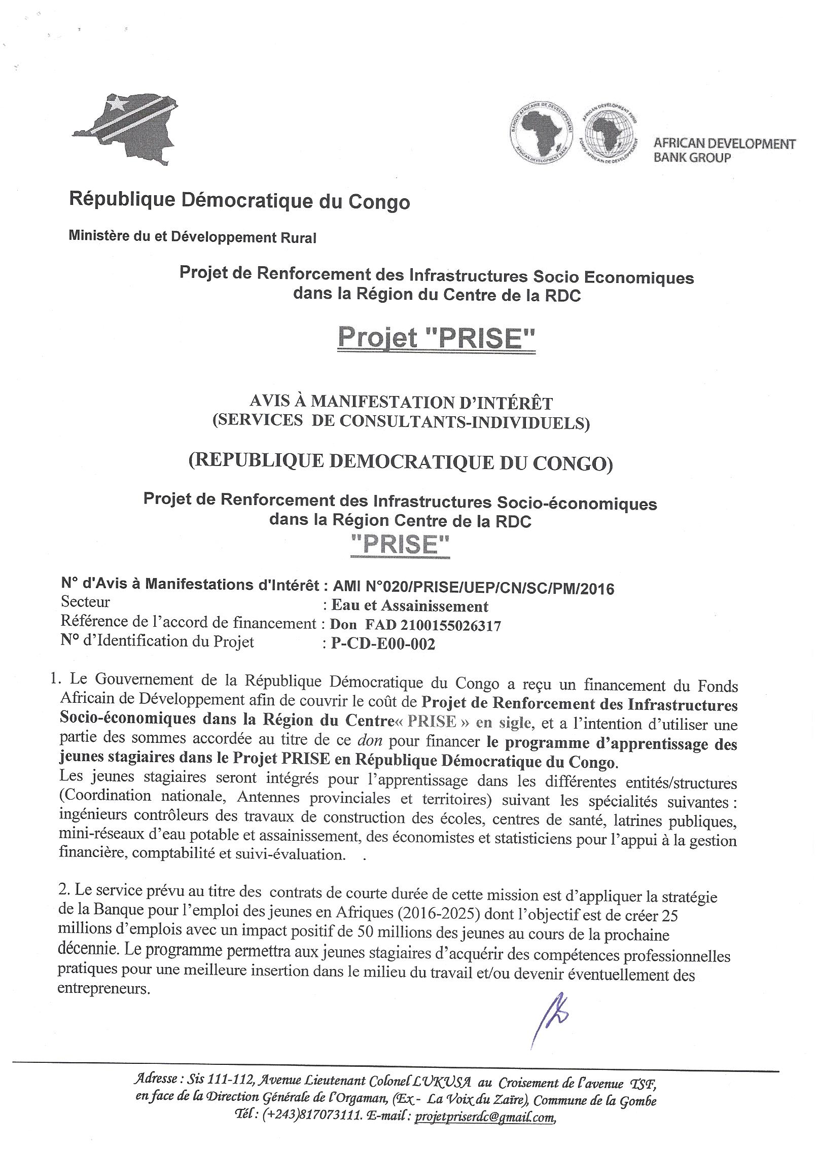 Service de Consultants Firmes pour le projet d’Aménagement de la Route Tshikapa-Mbuji-Mayi, Section Tshikapa-Kamuesha et Réhabilitation des Infrastructures agricoles et rurales connexes.