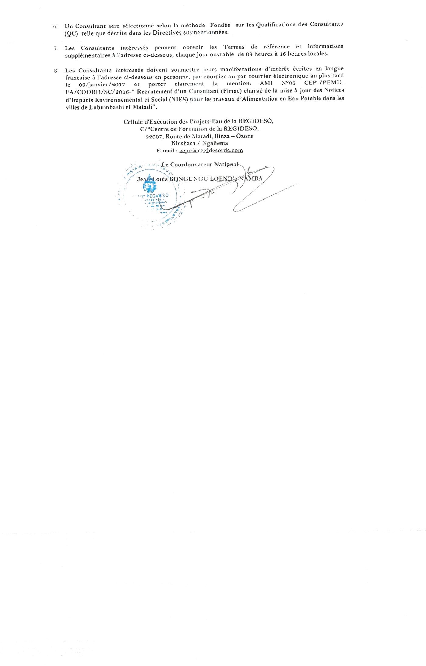 Recrutement d’un Consultant chargé de la mise à jour d’une Notice d’Impacts Environnemental et Social pour les travaux d’Alimentation en Eau Potable dans la ville de Lubumbashi et Matadi.