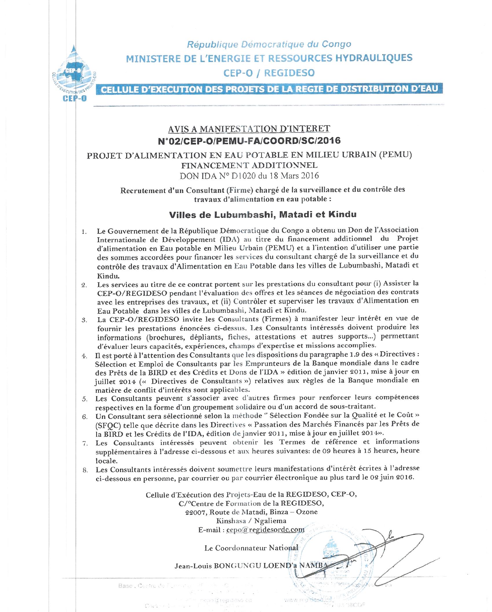 Recrutement d’un Consultant chargé de la surveillance et du contrôle des travaux d’alimentation en eau potable.« Villes de Lubumbashi, Matadi et Kindu ».