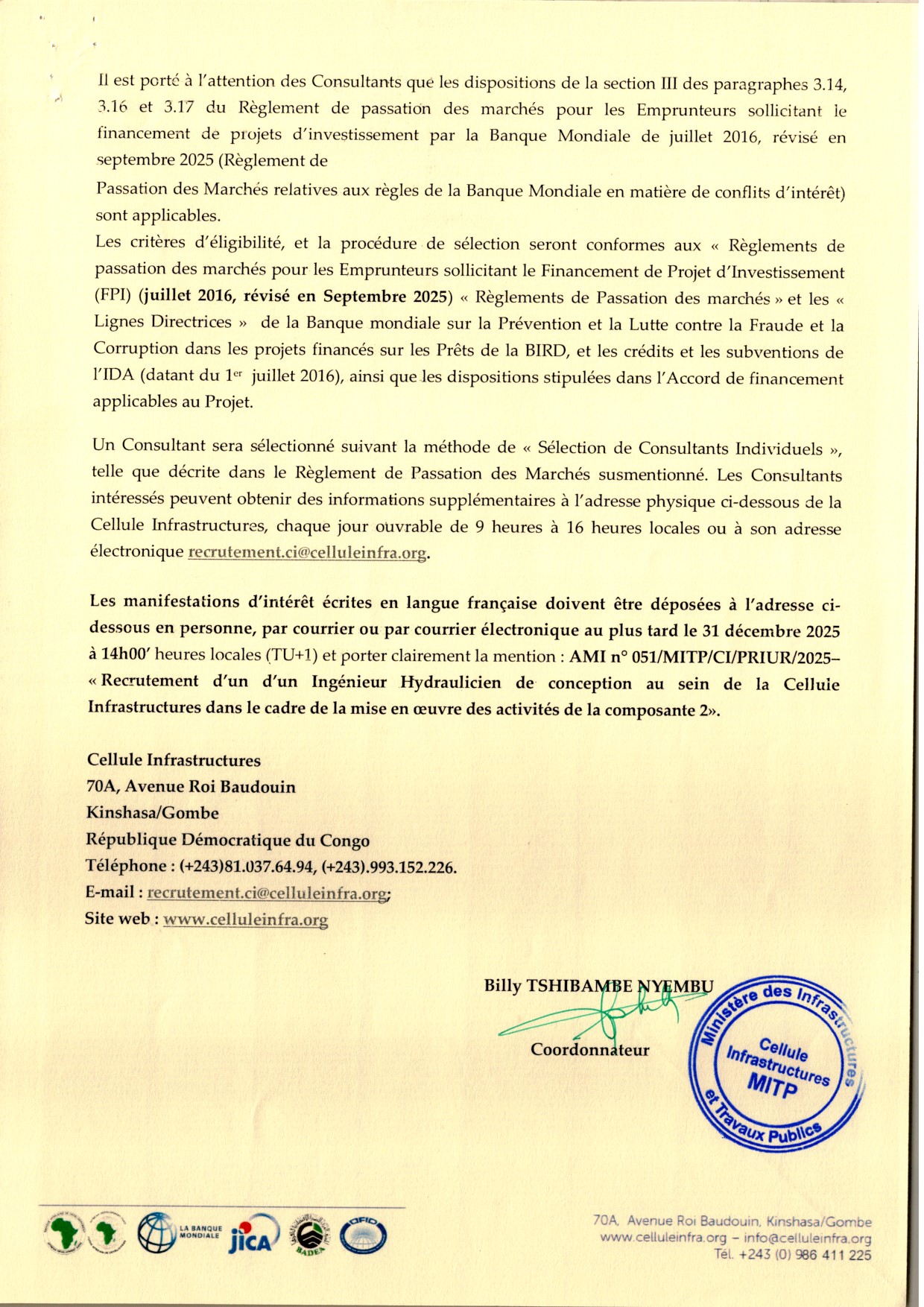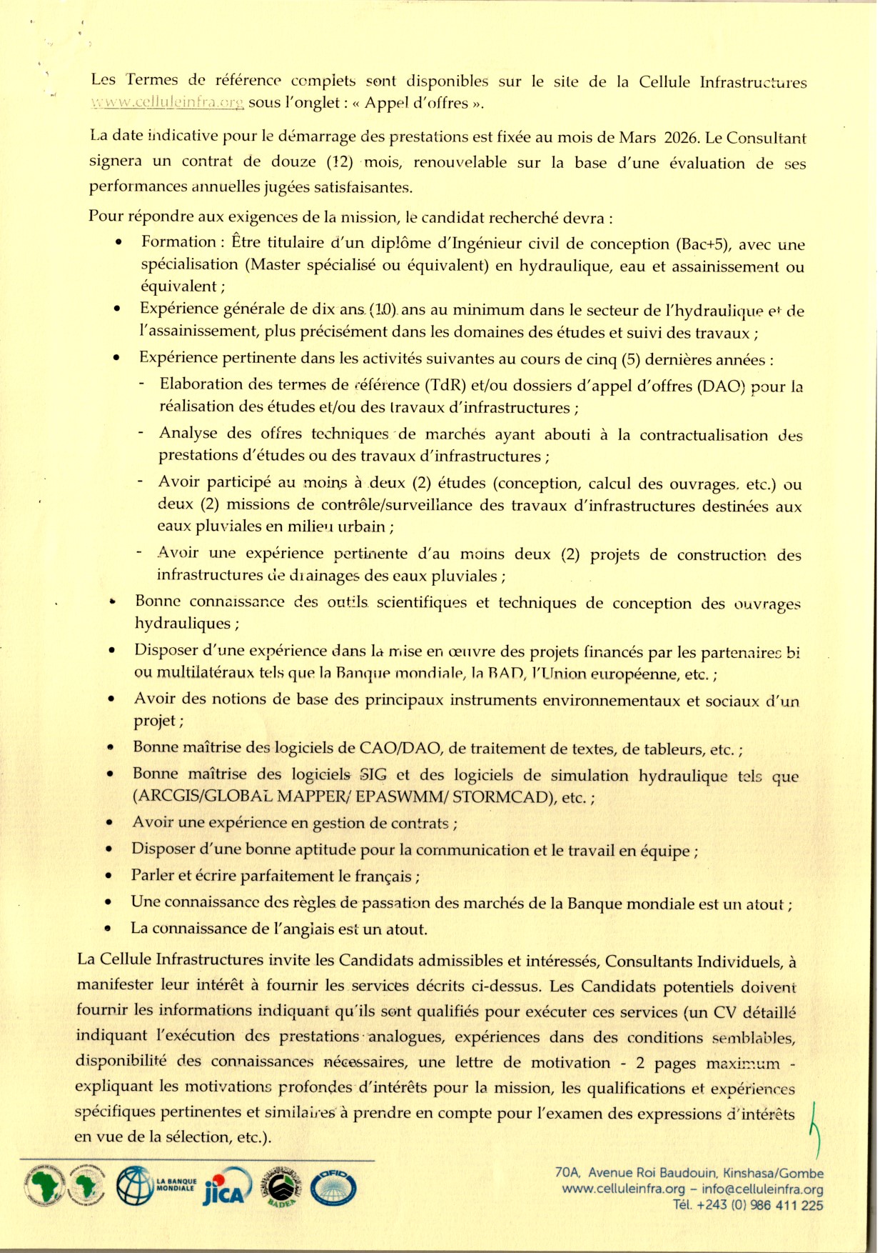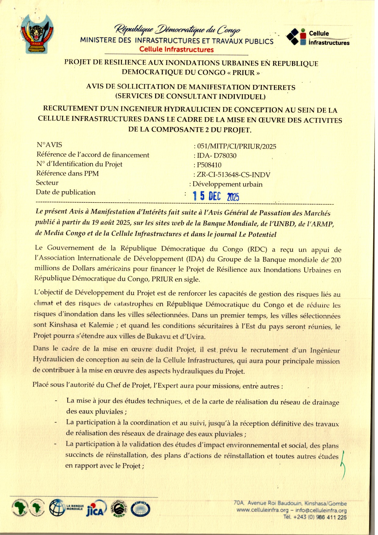 Recrutement d’un ingénieur hydraulicien de conception au sein de la cellule infrastructures dans le cadre de la Mise en œuvre des activités de la composante 2 du projet