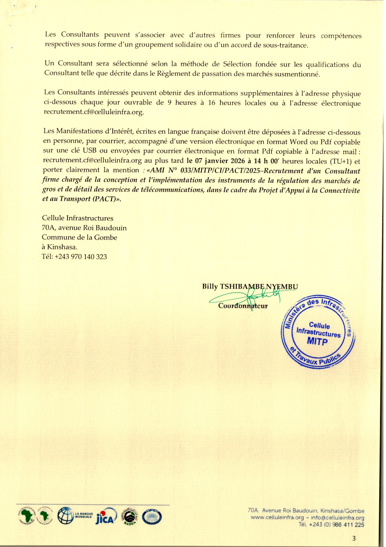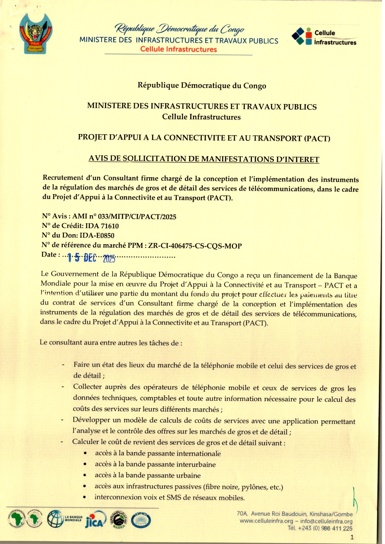 Recrutement d’un Consultant firme chargé de la conception et l’implémentation des instruments de la régulation des marchés de gros et de détail des services de télécommunication, dans le cadre du Projet d’Appui à la Connectivité et au Transport (PACT)