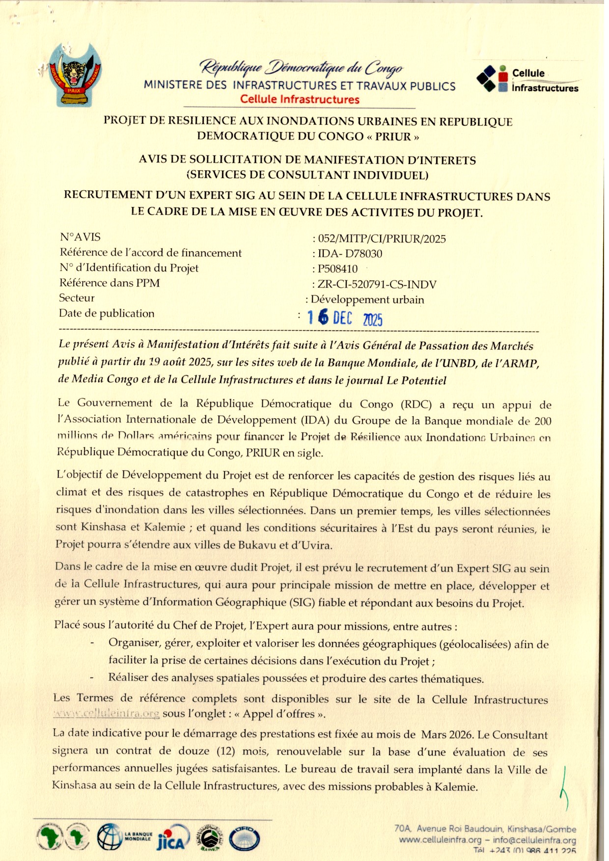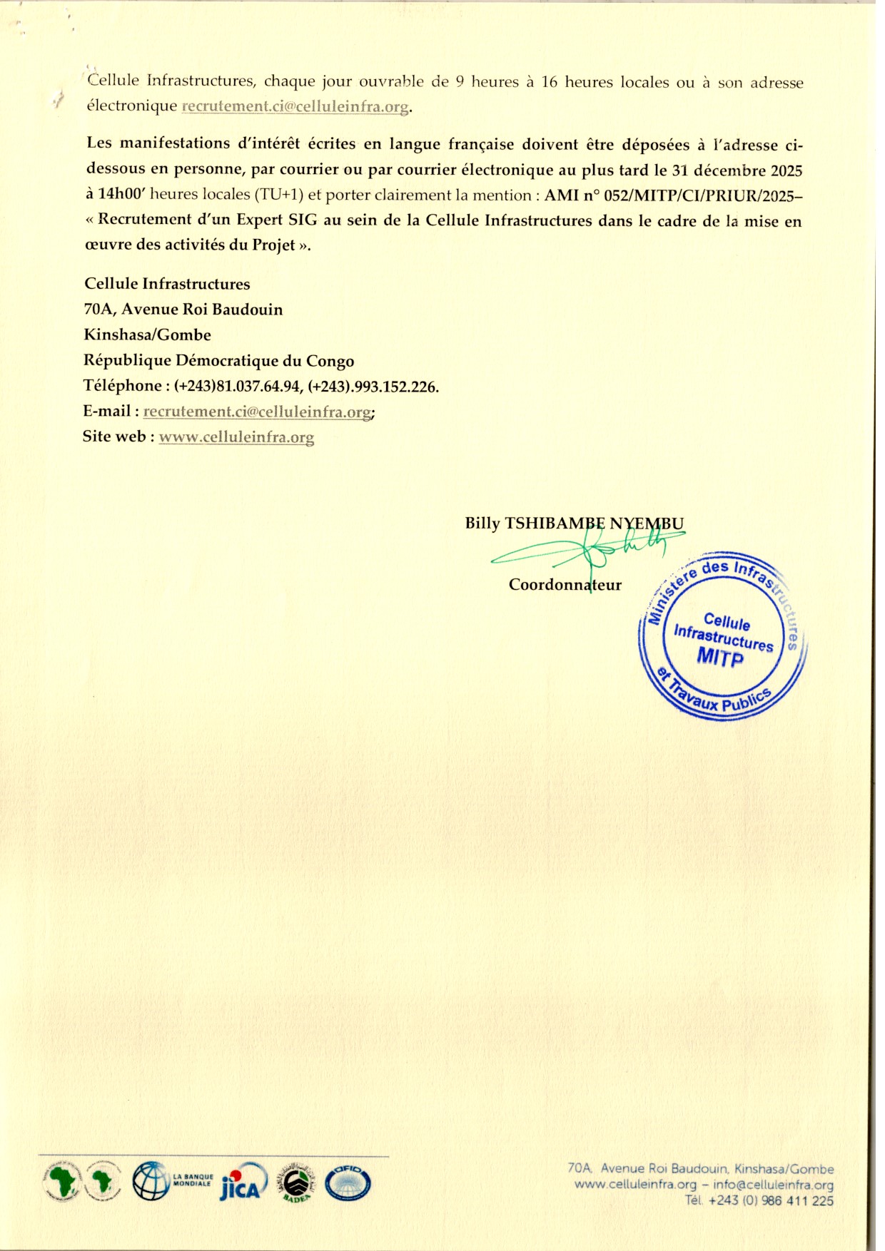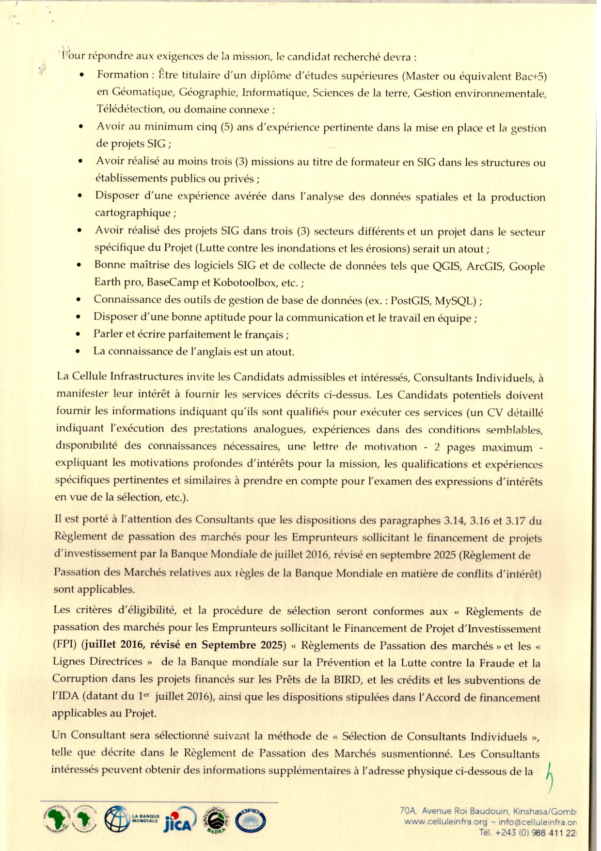 Recrutement d’un consultant firme pour la réalisation d’une étude de faisabilités pour la construction d’un pont sur l’axe Monkoto-Emengelye dans la province de la Tshuapa