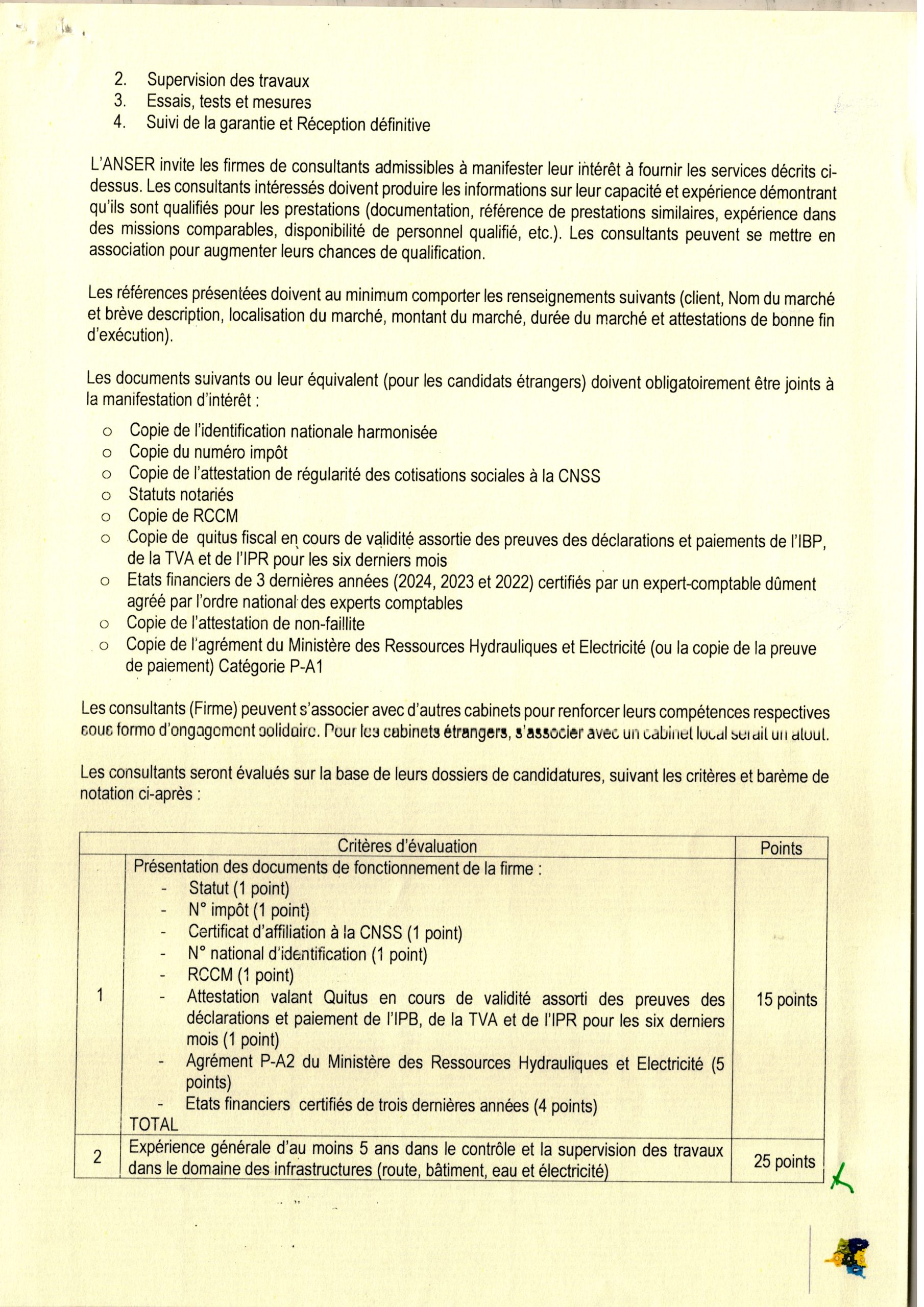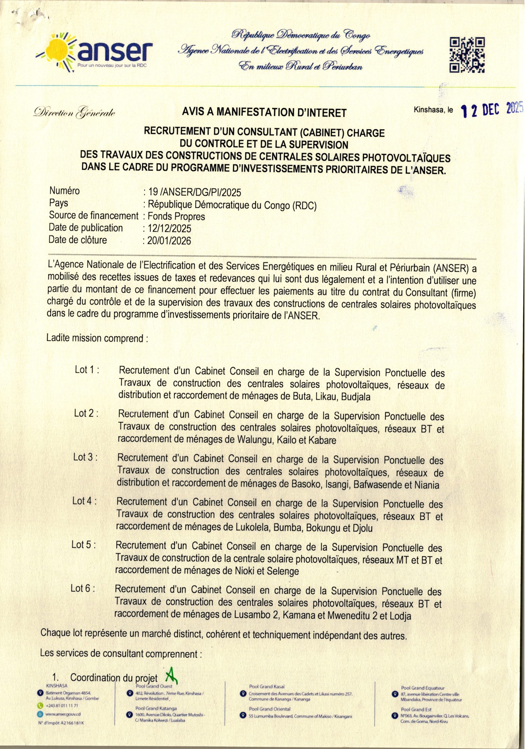Recrutement d’un consultant (cabinet) chargé du contrôle et de supervision des travaux de construction des centrales solaires photovoltaiques dans le cadre du programme d’investissements prioritaires de l’ANSER.