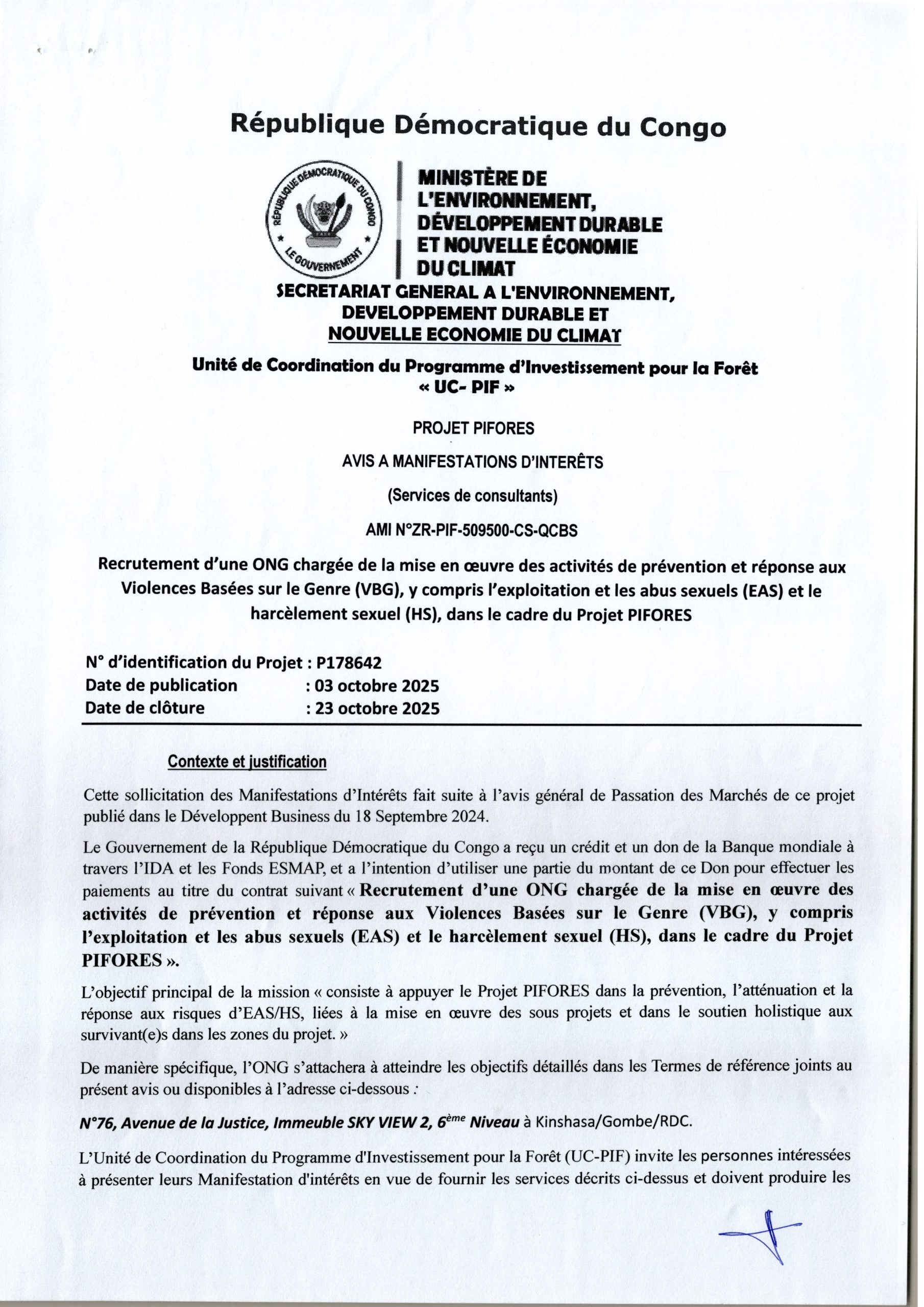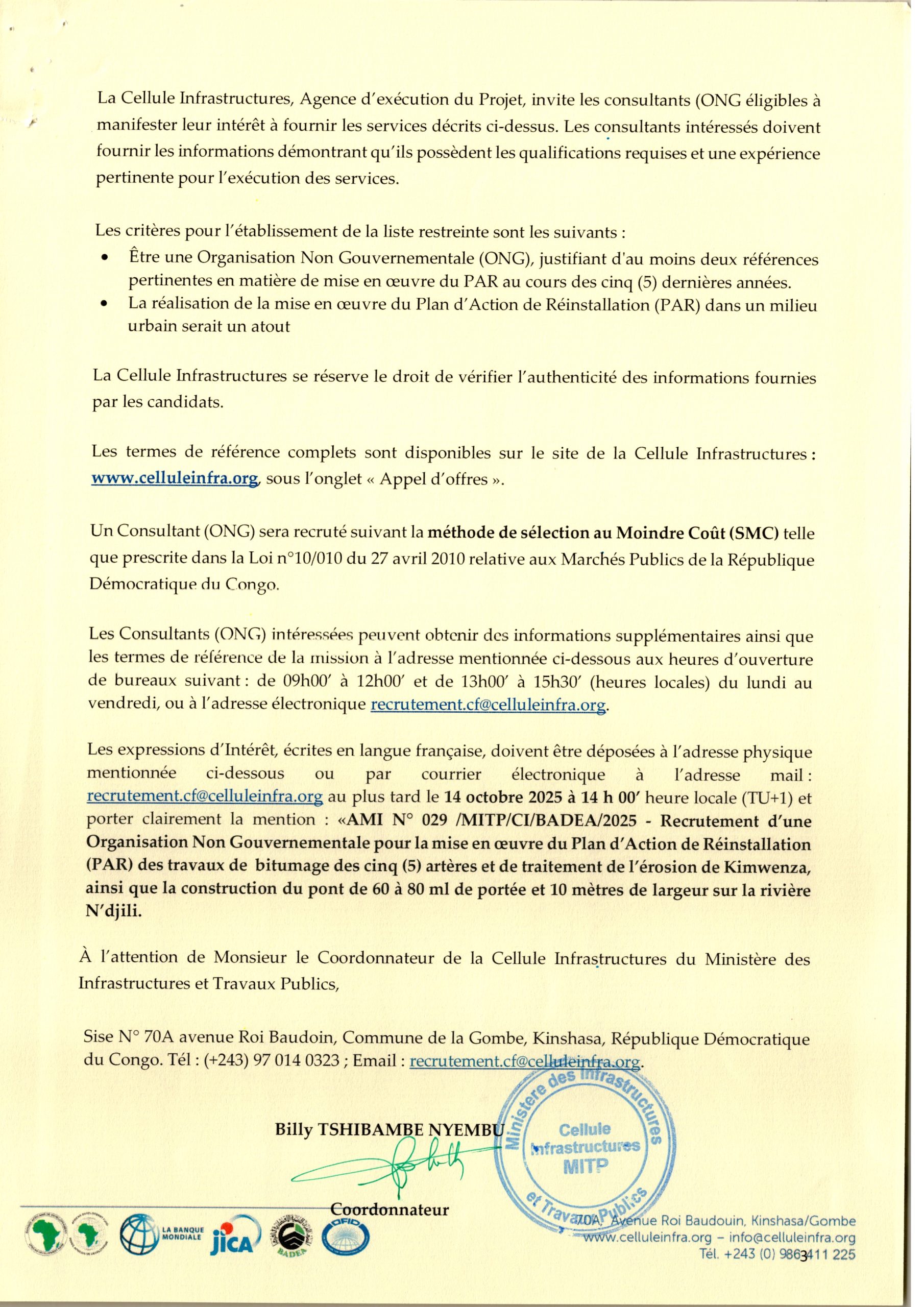 Recrutement d’une Organisation Non Gouvernementale (ONG) chargée de la mise en œuvre du Plan d’Action de Réinstallation des travaux de réhabilitation de la voirie de Kinshasa (PHASE 2)