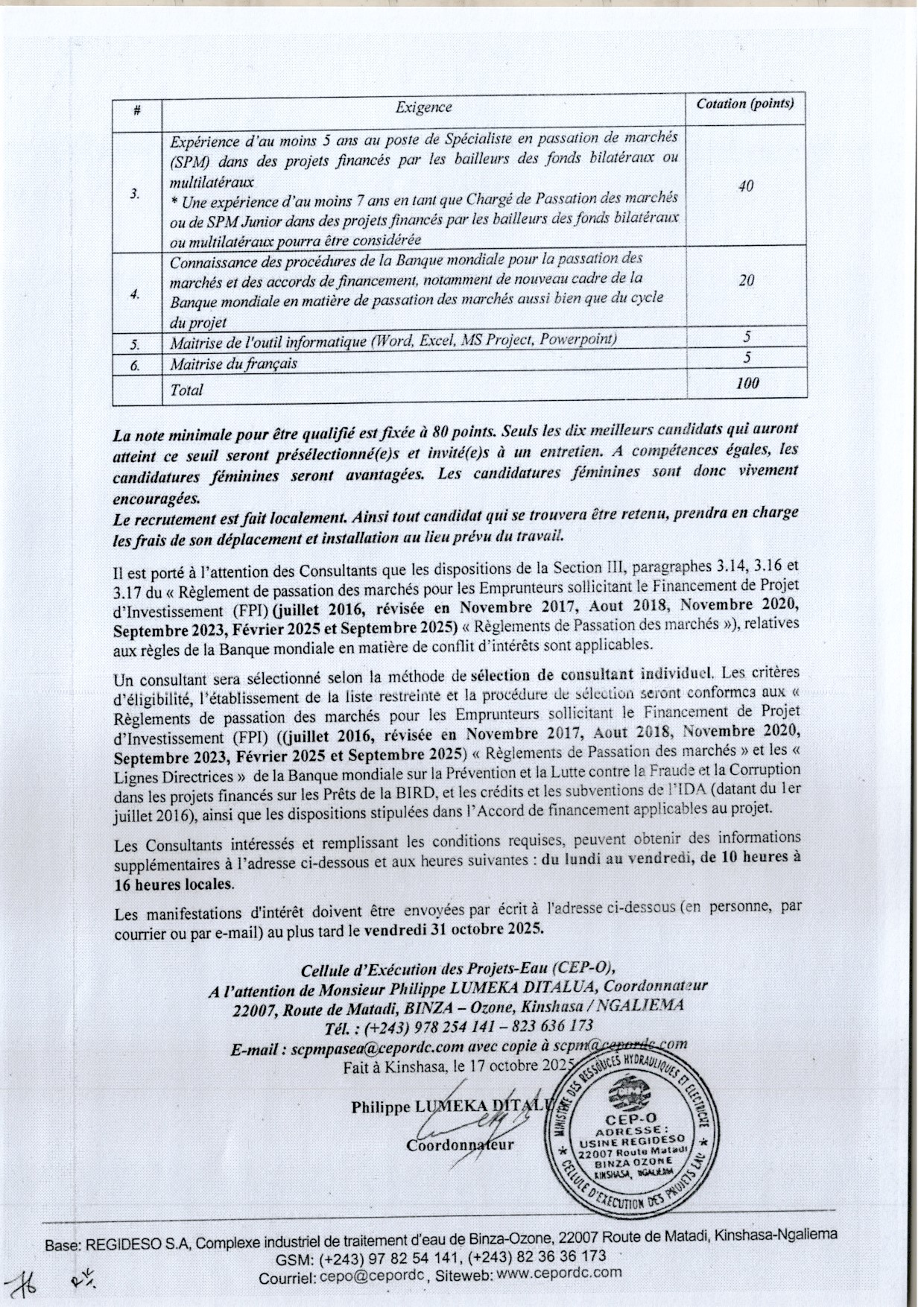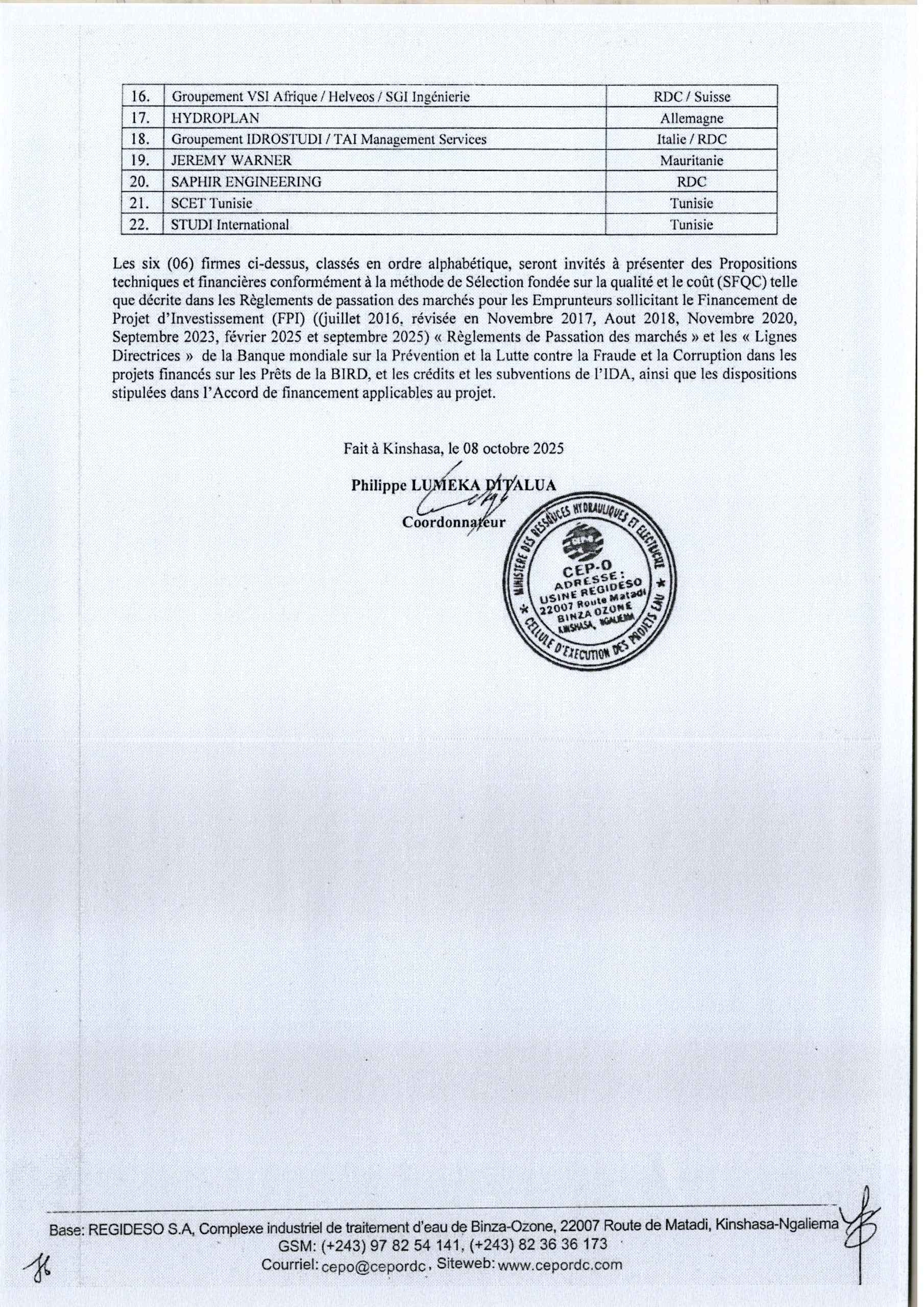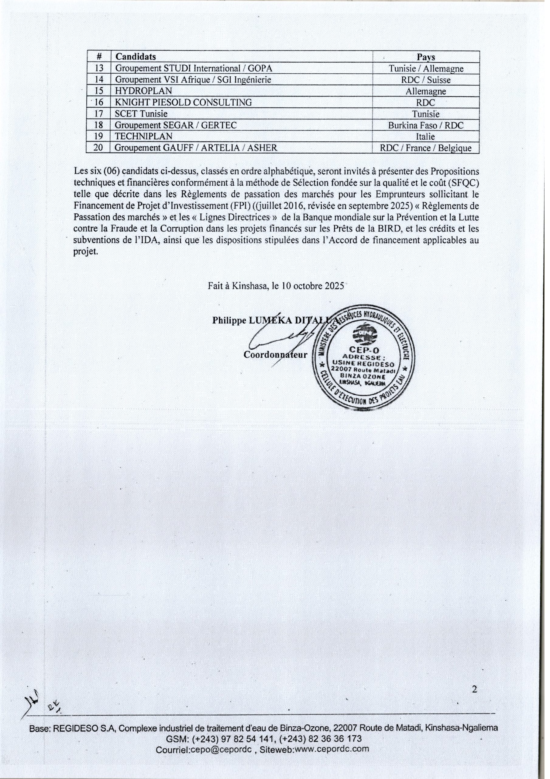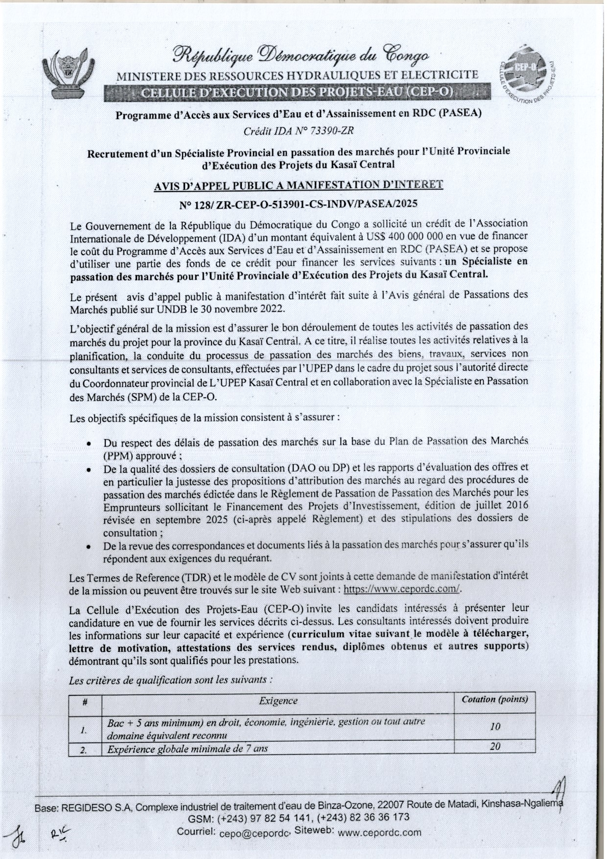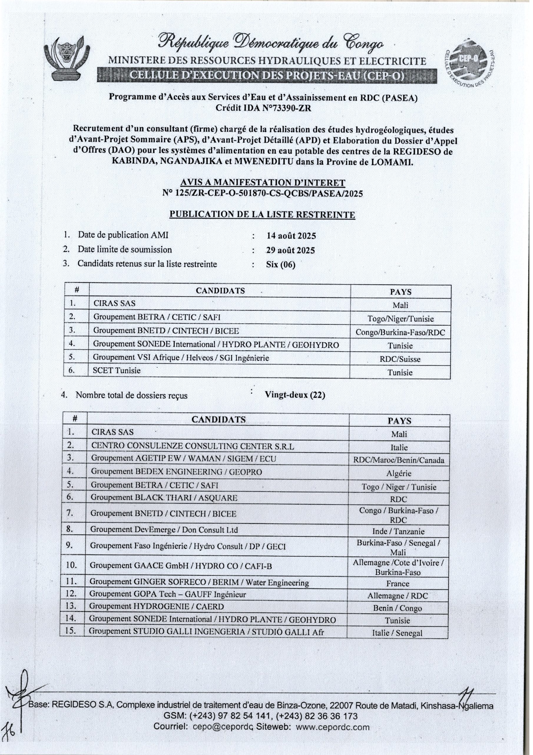 Recrutement d’un Consultant (firme) en charge de l’élaboration des Etudes Hydrogéologiques, études d’Avant-Projet Sommaire (APS) et Détaillé (APD) et Elaboration du Dossier d’Appel d’Offres (DAO) pour les systèmes d’alimentation, …. dans la province du Kogo Central