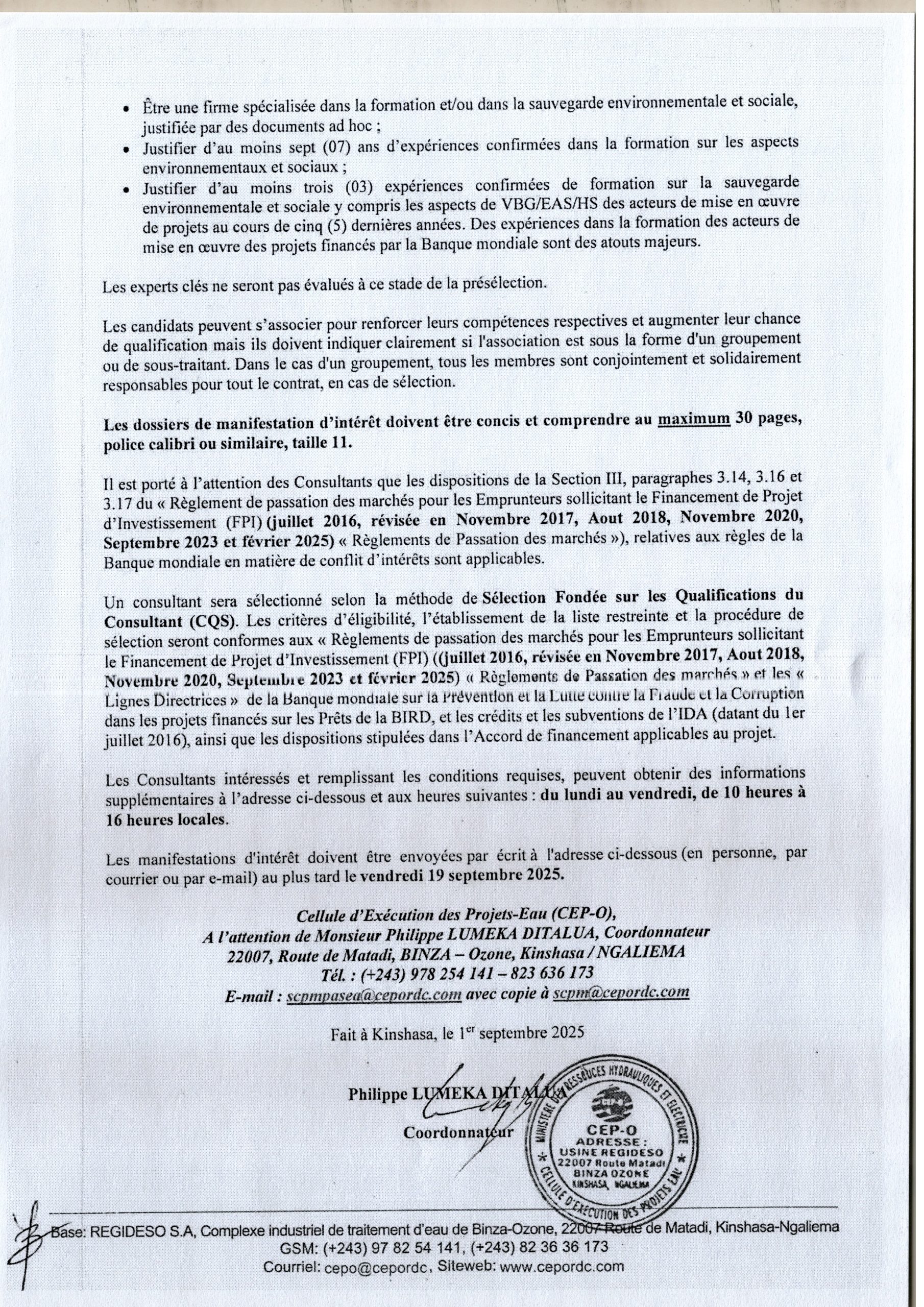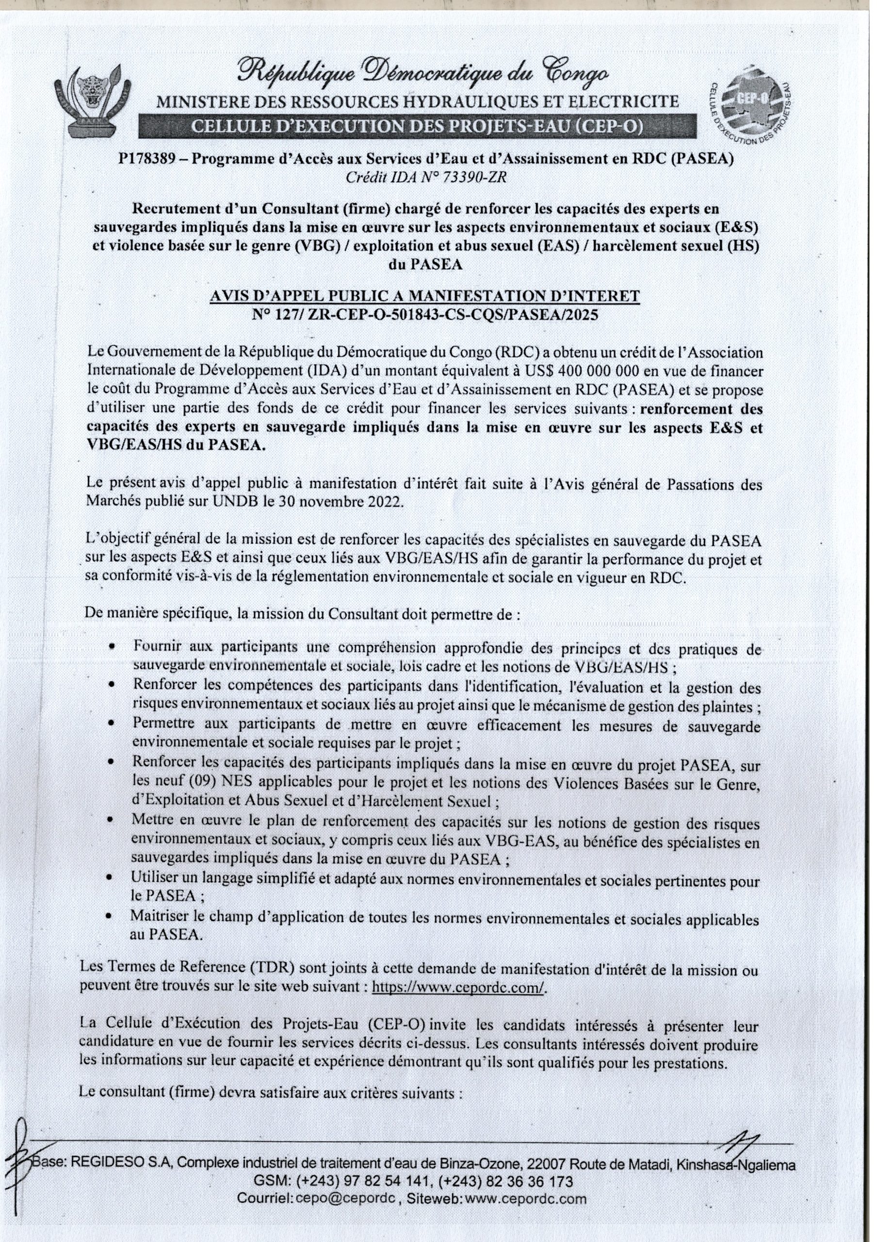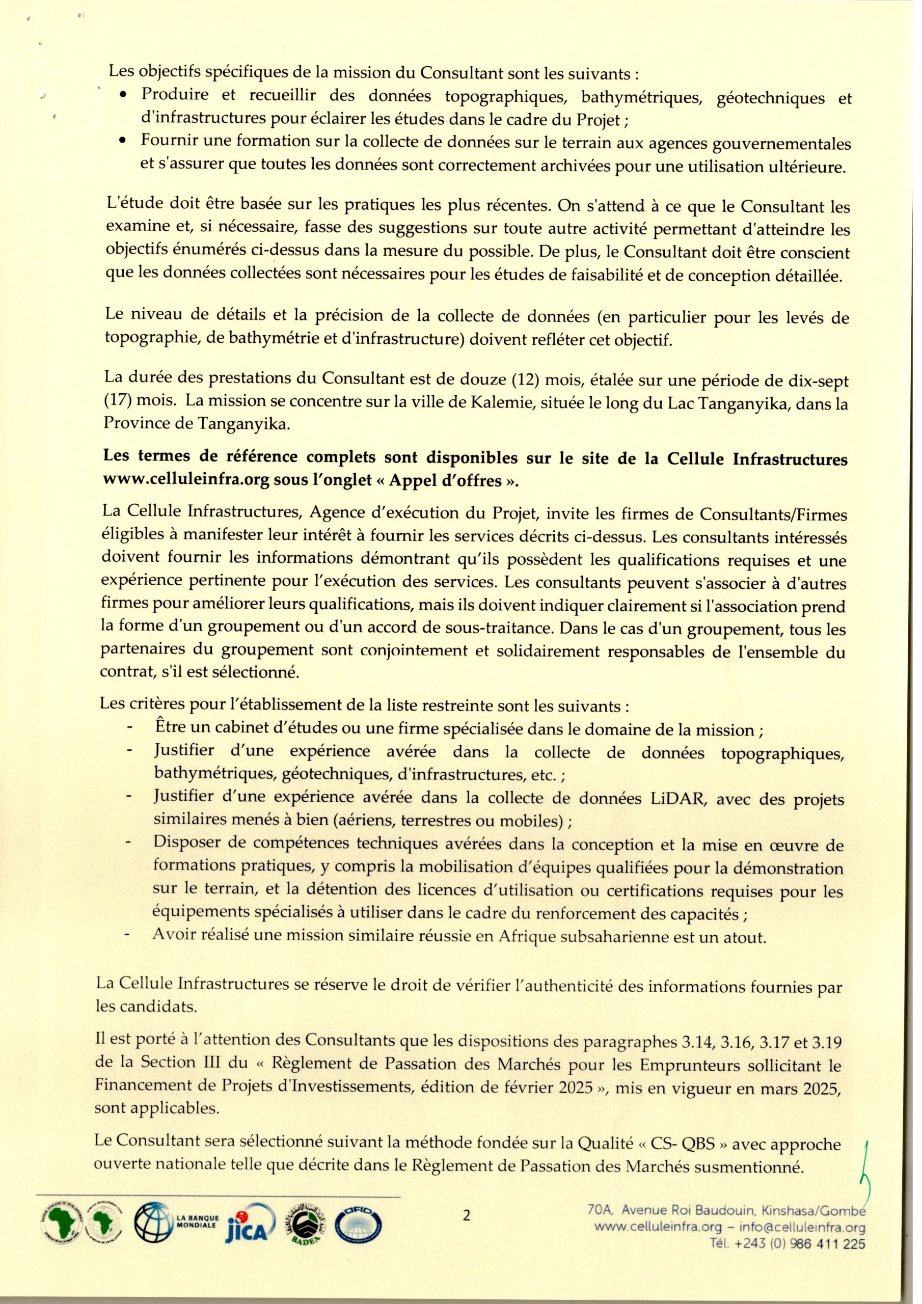 Recrutement d’un consultant (firme) pour mener une campagne de collecter des données topographiques, bathymétriques, géotechniques et d’infrastructures pour la ville de Kalemie dans la Province du Tanganika.