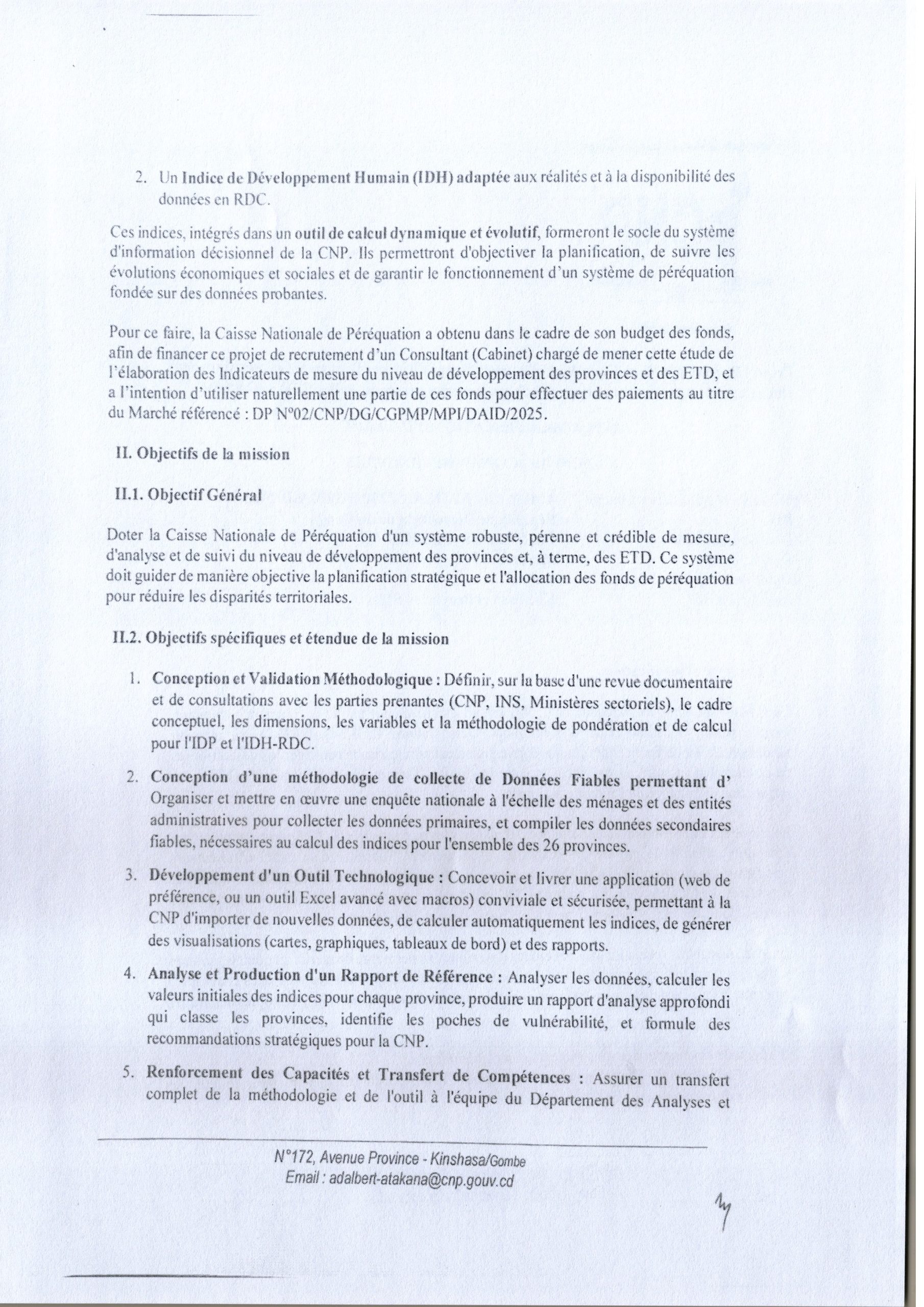 Recrutement d’un consultant (cabinet) chargé de mener l’étude de l’élaboration des indicateurs de mesure du niveau de développement des provinces et des ETD à Kinshasa.