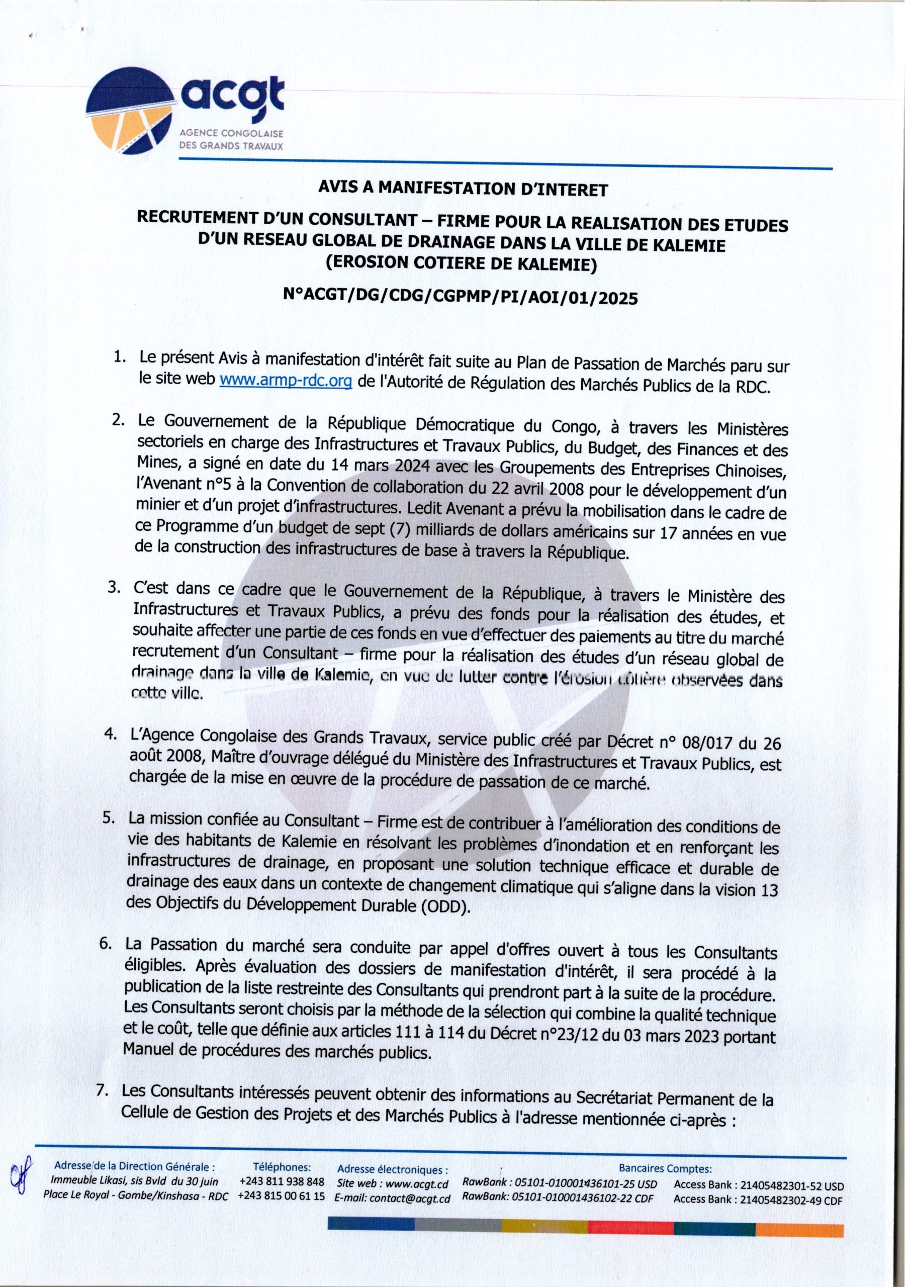 Recrutement d’un consultant-firme pour la réalisation des études d’un réseau global de drainage dans la Ville de Kalemie (Erosion cotière de Kalemie).