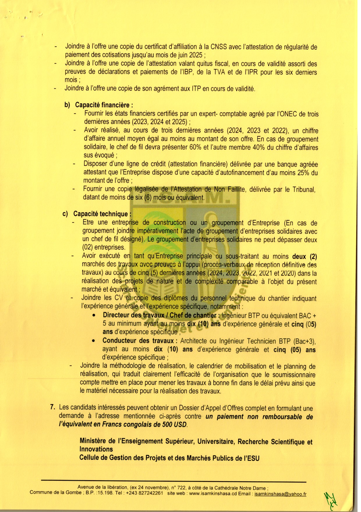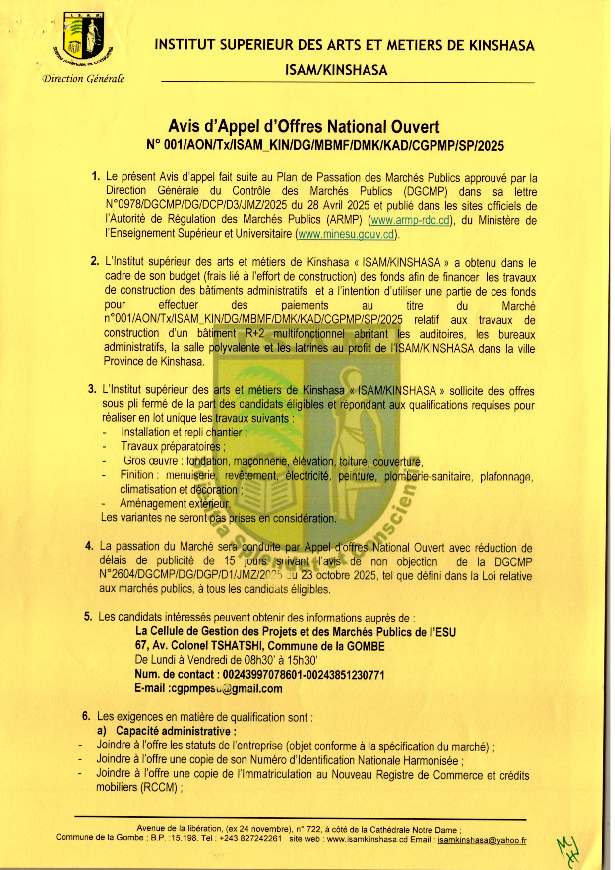 Travaux de construction d’un bâtiment R+2 multifonctionnel abritant les auditoires, les bureaux administratifs, la salle polyvalente et les latrines au profit de l’ISAM/KINSHASA dans la ville Province de Kinshasa.